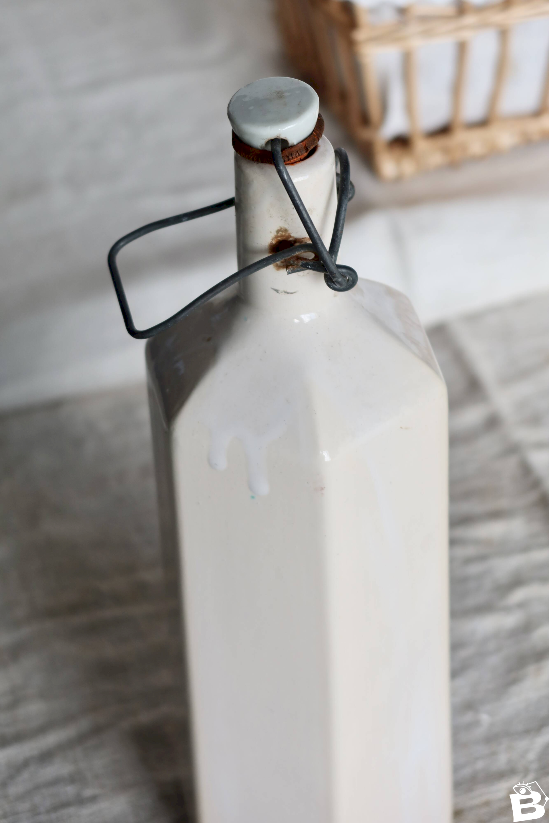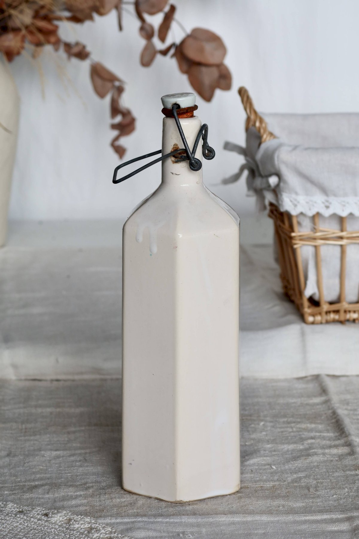Bouteille vintage en céramique émaillée beige, de forme élancée à pans coupés, au charme sobre et authentique.