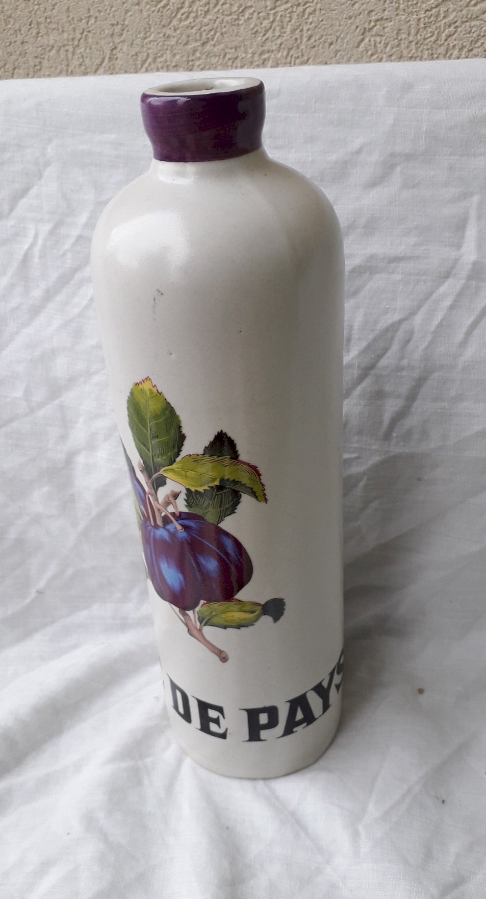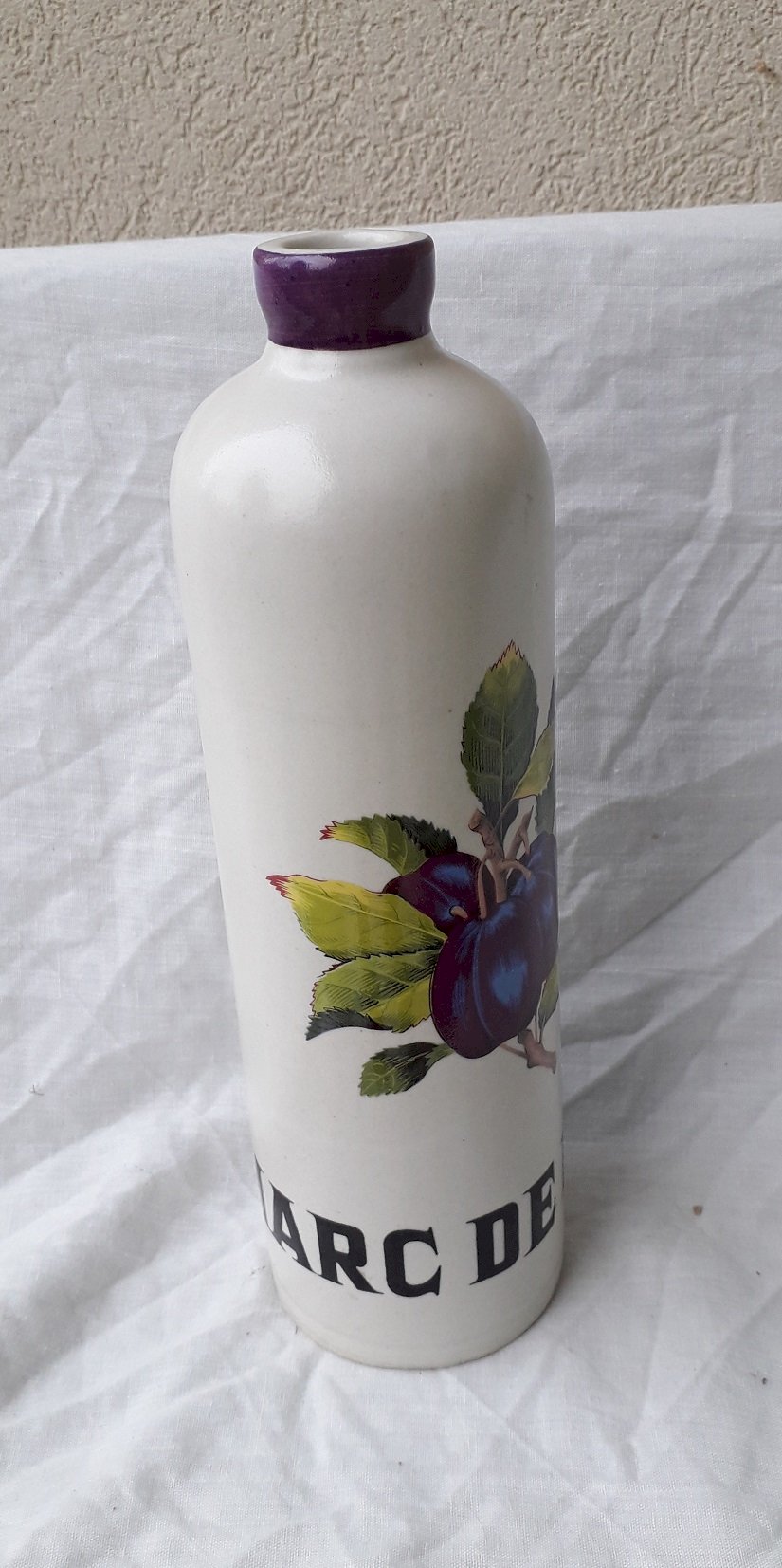 Bouteille en grès, portant un cachet en dessous, avec un joli décor de prunes, inscription "Marc de pays".