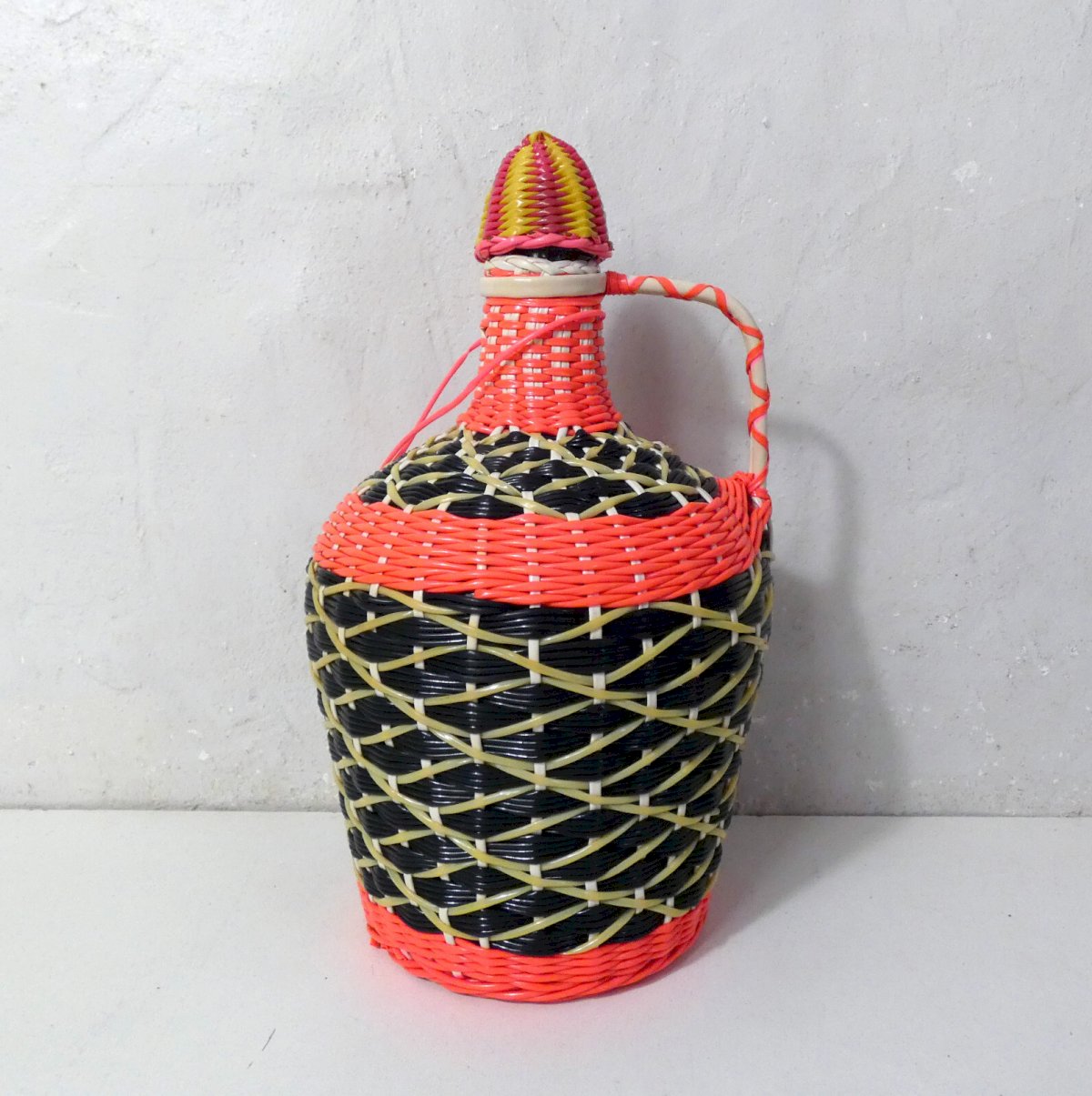 Bouteille en scoubidou, des années 70. Hauteur: 34 cm. Diamètre: 19,5 cm. C'est un beau format. Elle est en excellent état et parfaitement fonctionnelle.