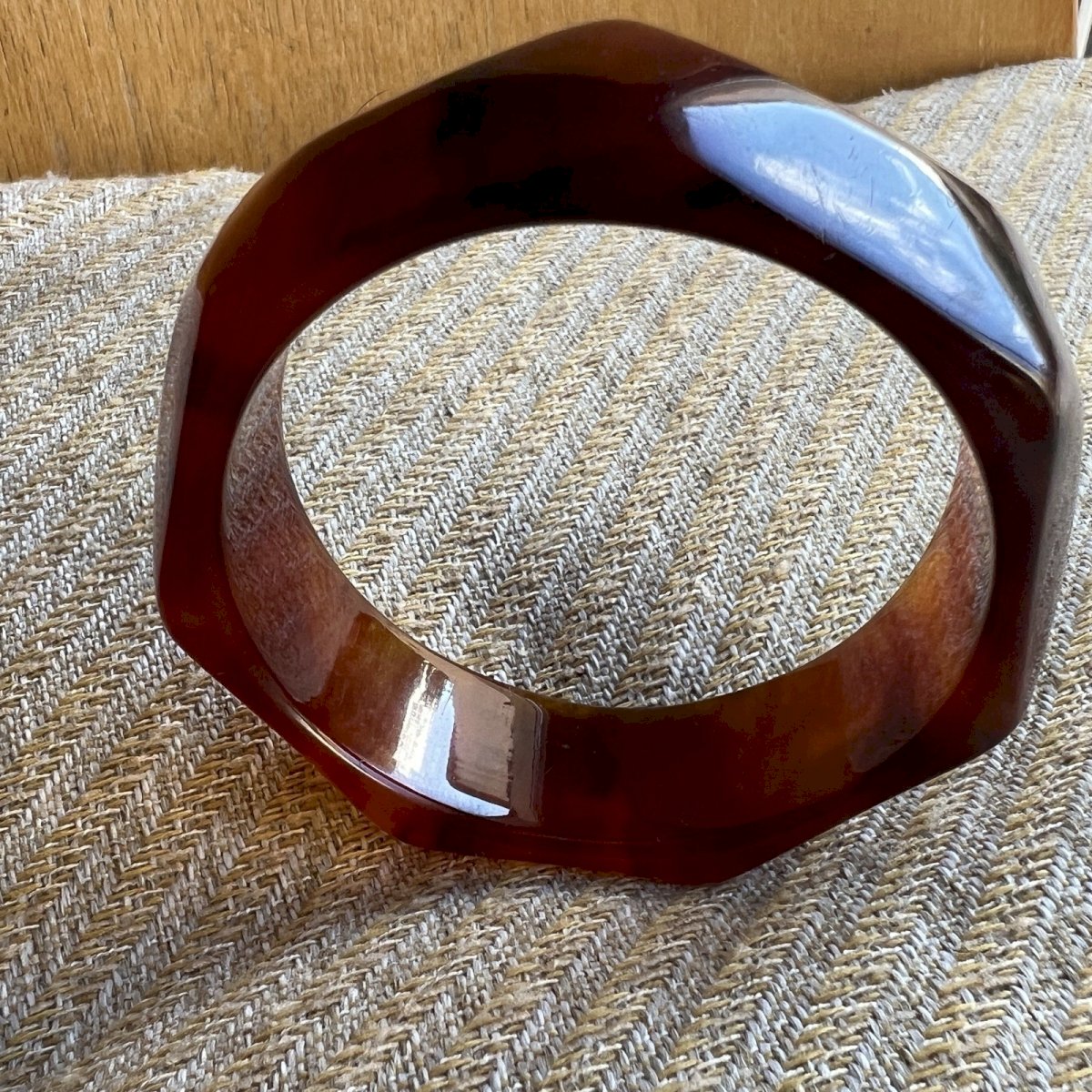 Bracelet Art Deco Bakelite Jonc Biseauté vintage ancien. Bracelet jonc biseauté, Art Déco vers 1925 Diamètre intérieur : environ 6,5 cm (diamètre standard, correspondant à une circonférence d’environ 20,4 cm). ⚠️ Attention au passage des jointures : malgré un diamètre classique, ce jonc peut être difficile à enfiler selon la morphologie de la main, en particulier en raison de sa forme rigide. Largeur du bracelet : environ 2,3 cm. Poids : environ 45 g. Petites usures d’usage cohérentes avec son âge. État:Occasion: Objet ayant été porté. ...Occasion: Objet ayant été porté. les éventuelles imperfections. Style:Jonc Marque:Bakelite Pays d'origine:France Couleur dominante:Marron Matière:Bakelite