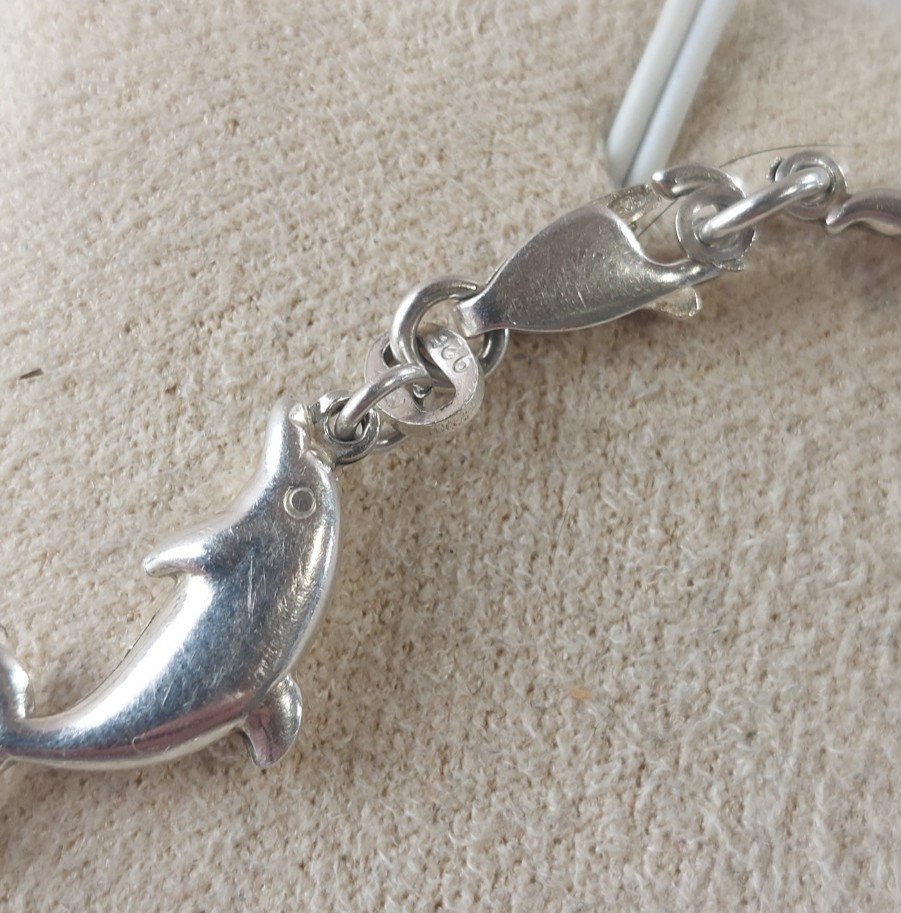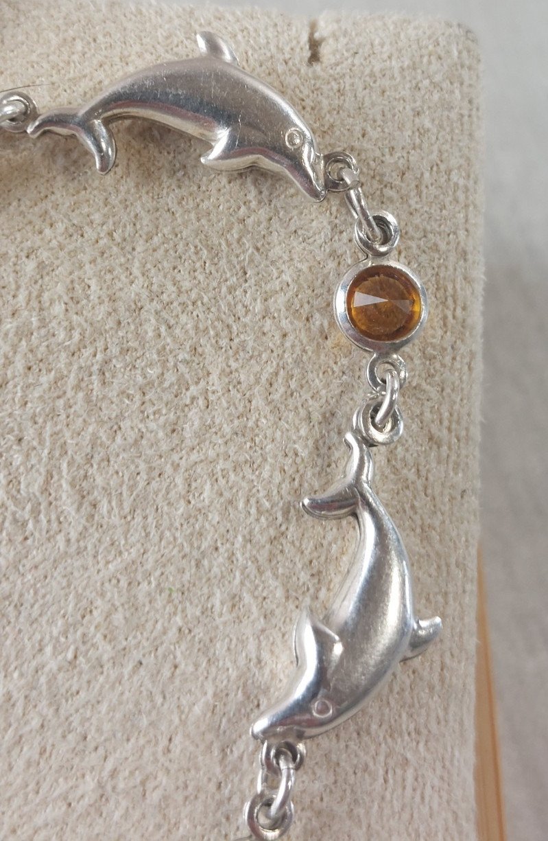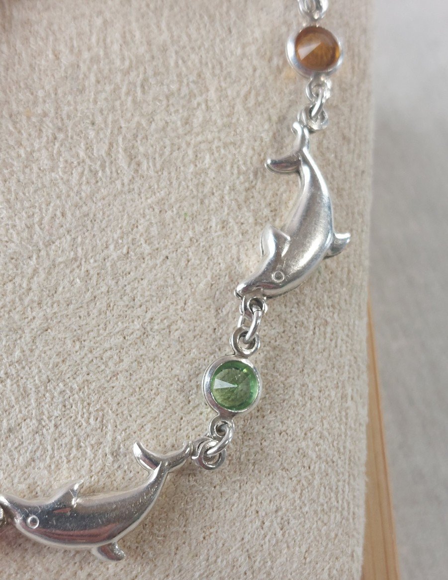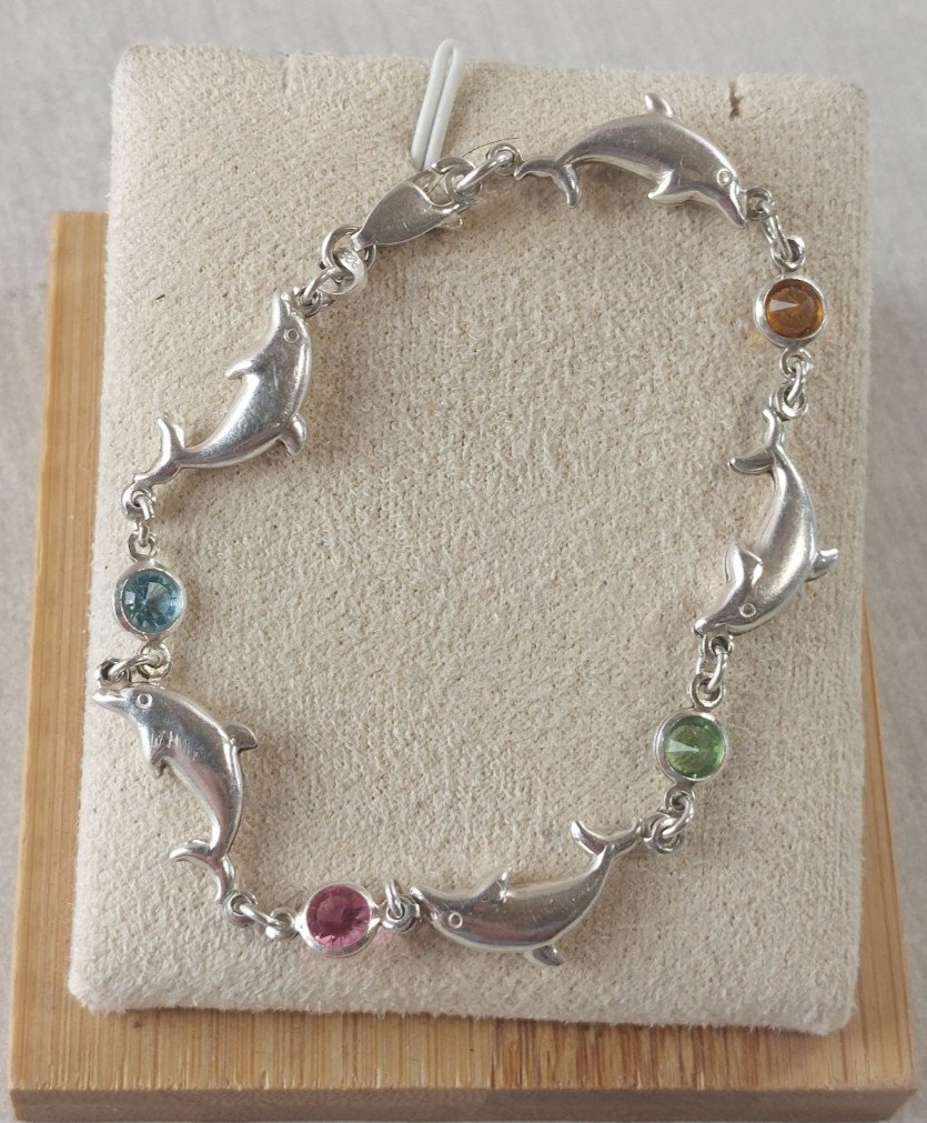 Bracelet décor dauphin, pierres multicolores, en argent massif