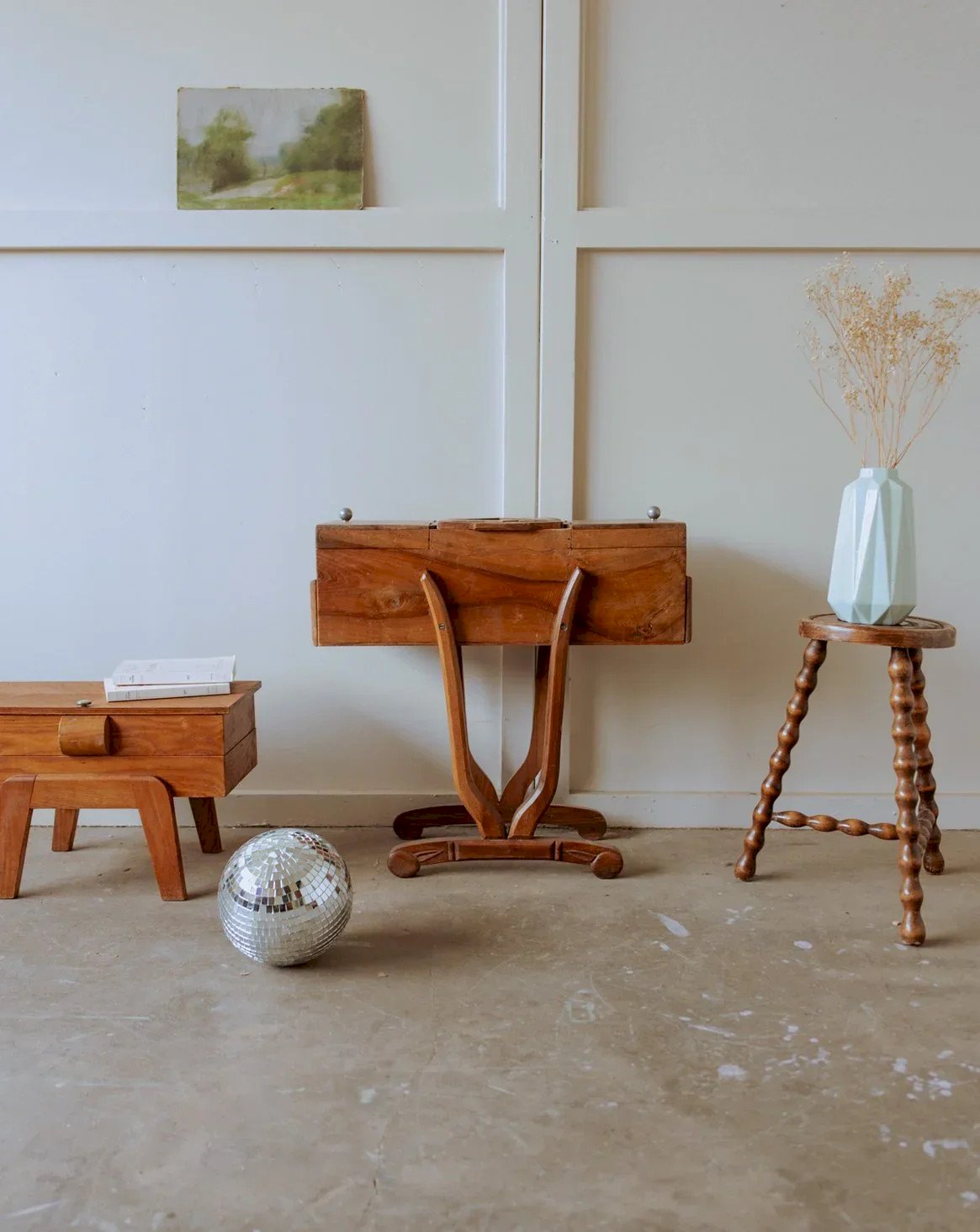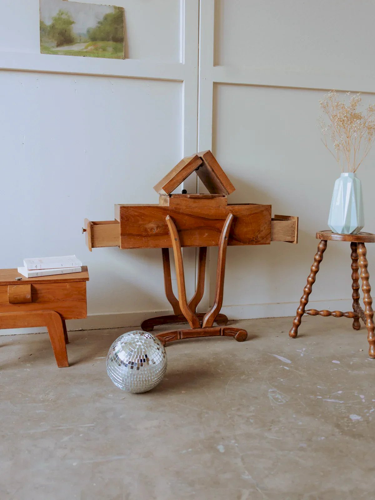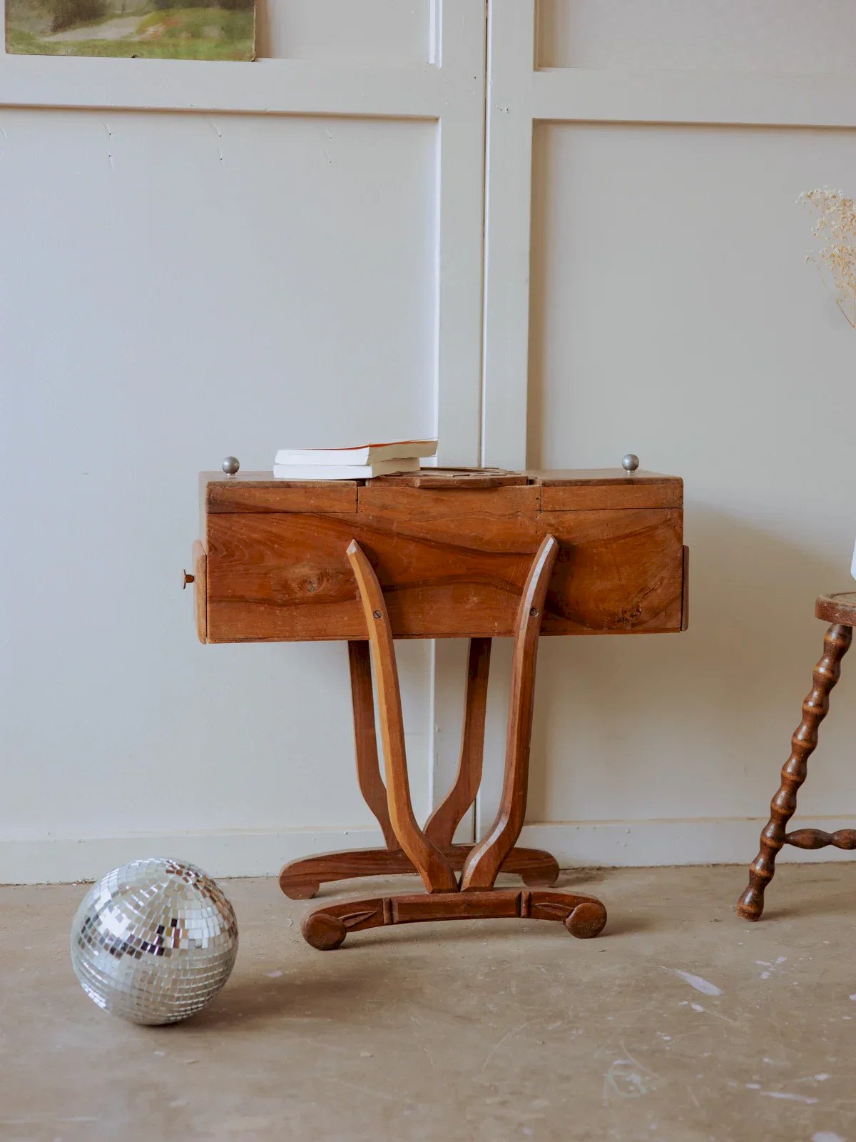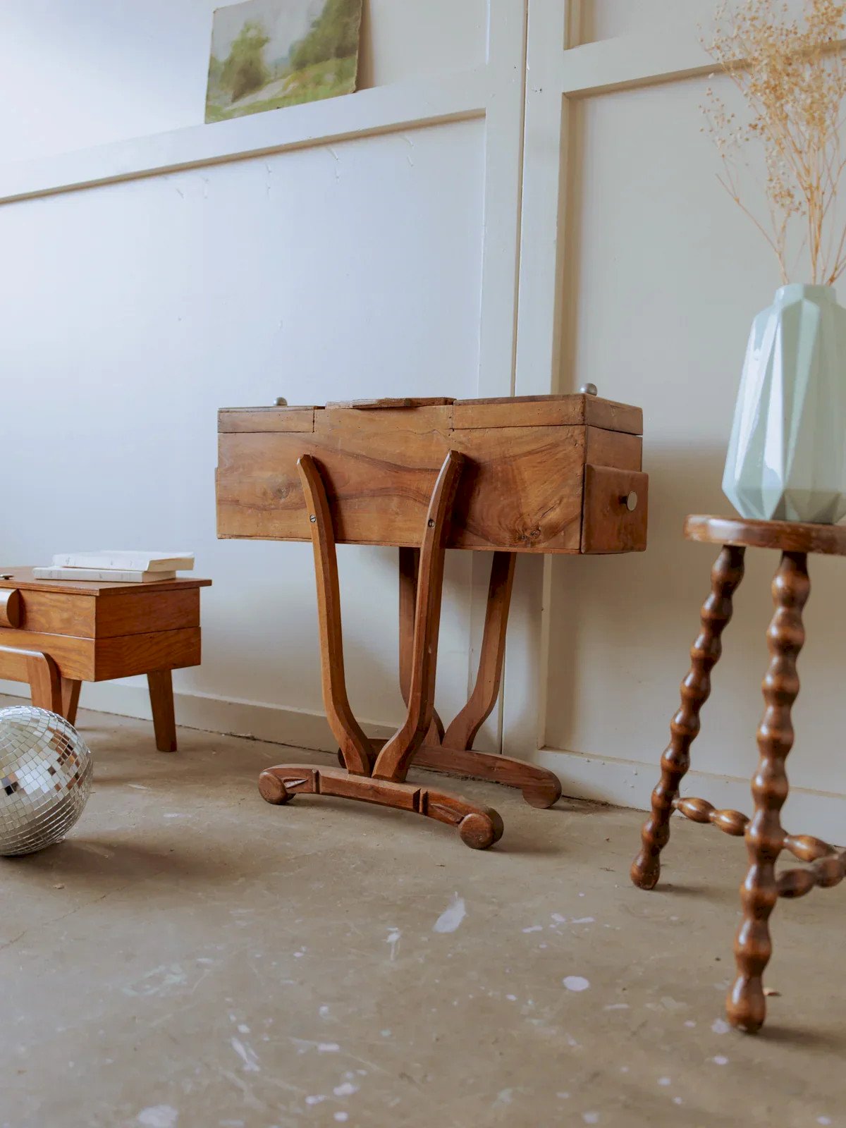 Découvrez cette travailleuse en bois grand format, au grain chaleureux et aux lignes sobres qui invitent au travail artisanal. Ses compartiments généreux et son agencement ingénieux permettent d'organiser fils, aiguilles et accessoires de couture autant que les fournitures de loisirs créatifs, offrant une capacité adaptée à un atelier domestique. Posée sur une table ou ouverte lors d'une séance de couture, elle diffuse une ambiance calme et invitante, mêlant praticité et charme d'atelier. Longueur : 65 cm Largeur : 23 cm Hauteur : 63 cm Hauteur tiroir : 6 cm État:Occasion: Objet ayant été utilisé. Objet présentant quelques marques d'usure superficielle, ...Occasion: Objet ayant été utilisé. Objet présentant quelques marques d'usure superficielle, entièrement opérationnel et fonctionnant correctement. Il peut s'agir d'un modèle de démonstration ou d'un objet retourné en magasin après une courte période d'utilisation. les éventuelles imperfections. Marque:Debongout Type:Produit chiné Matériau:Bois Style:Campagne Personnalisé:Travailleuses