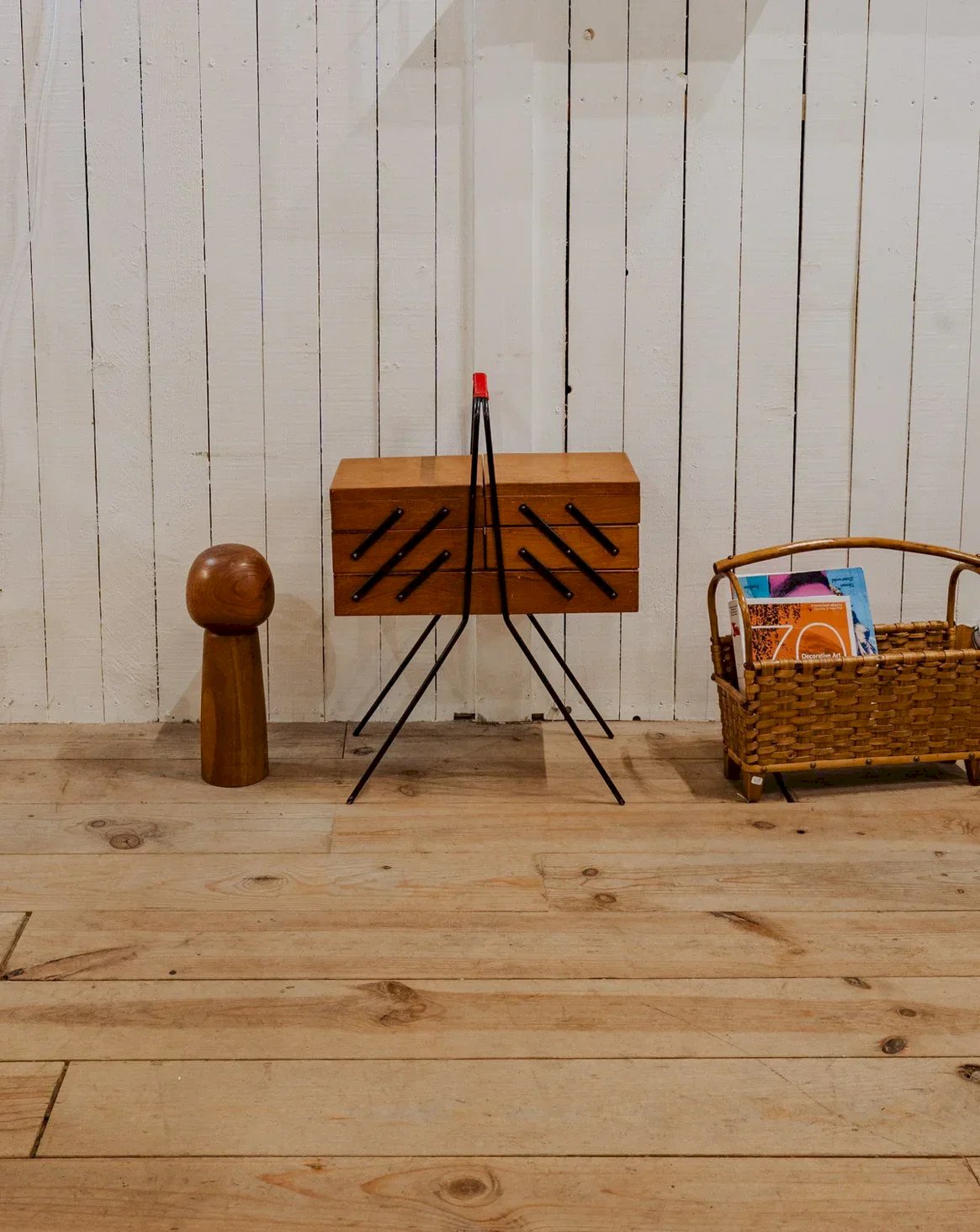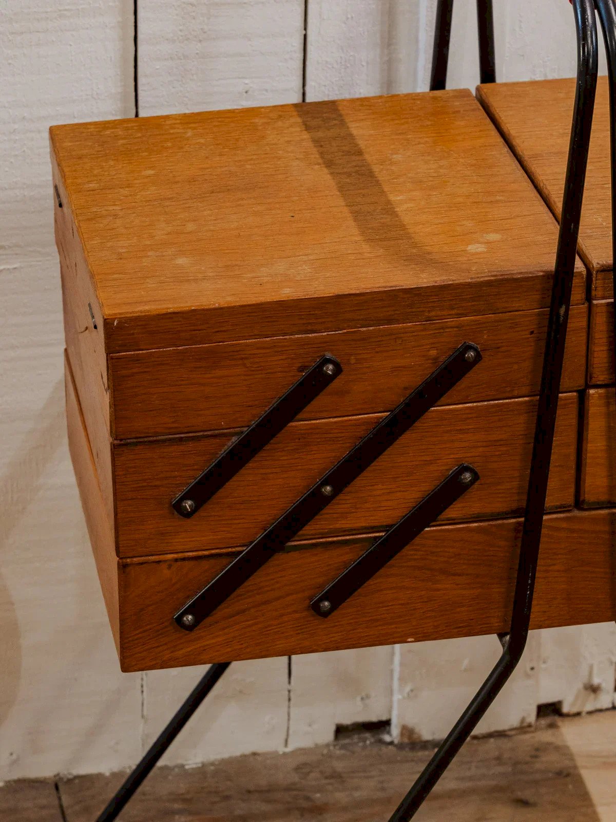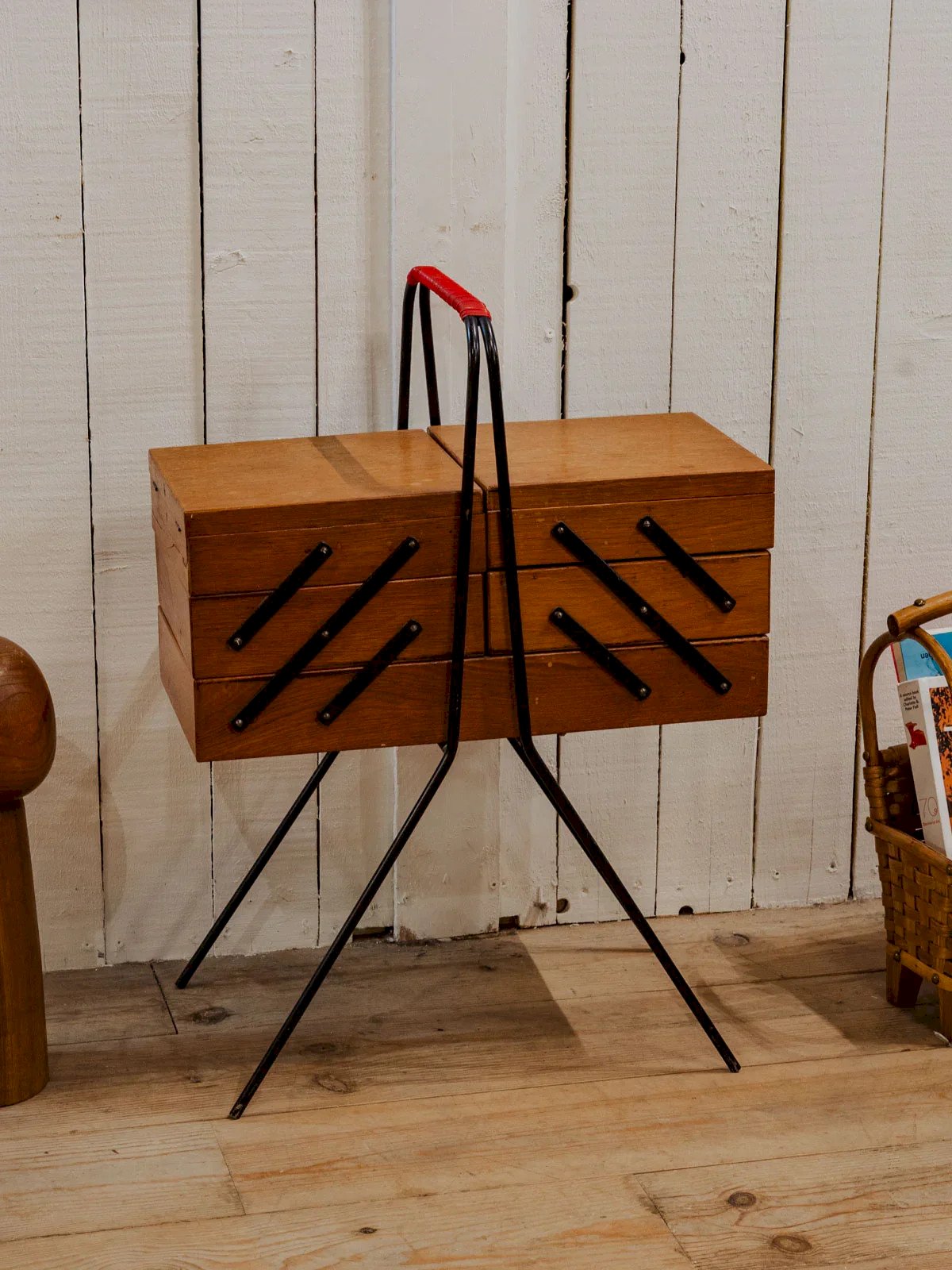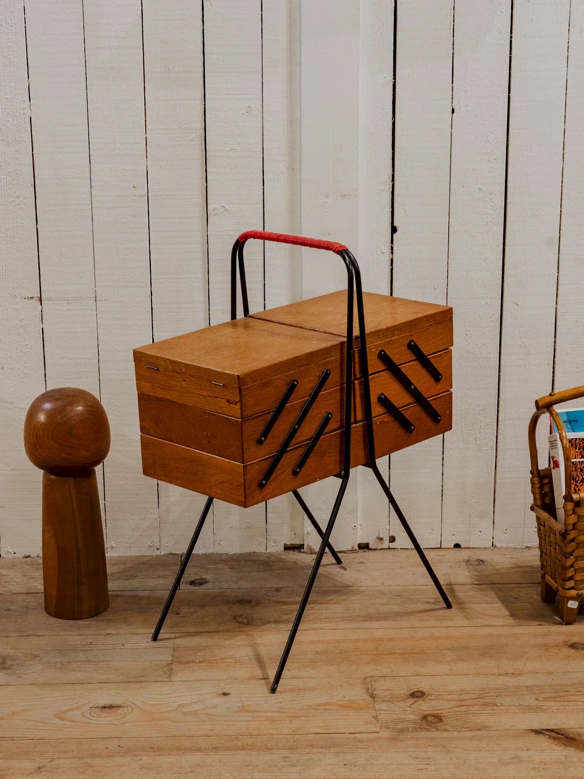 Adoptez cette travailleuse en bois, ponctuée de détails en métal noir et rouge, compacte fermée et généreuse une fois dépliée. Ses trois casiers de chaque côté et son plateau central plus large offrent un rangement modulable pour couture, loisirs créatifs ou bureau d'appoint, tandis que les pieds en métal noir lui confèrent une élégance industrielle discrète. Elle apporte une touche chaleureuse et fonctionnelle à un salon ou un atelier. Quelques traces du temps présentes. Longueur : 51 cm Largeur : 25 cm Hauteur : 68 cm Longueur dépliée : 161 cm État:Occasion: Objet ayant été utilisé. Objet présentant quelques marques d'usure superficielle, ...Occasion: Objet ayant été utilisé. Objet présentant quelques marques d'usure superficielle, entièrement opérationnel et fonctionnant correctement. Il peut s'agir d'un modèle de démonstration ou d'un objet retourné en magasin après une courte période d'utilisation. les éventuelles imperfections. Marque:Debongout Type:Produit chiné Matériau:Bois, Métal Personnalisé:Travailleuses Style:Campagne
