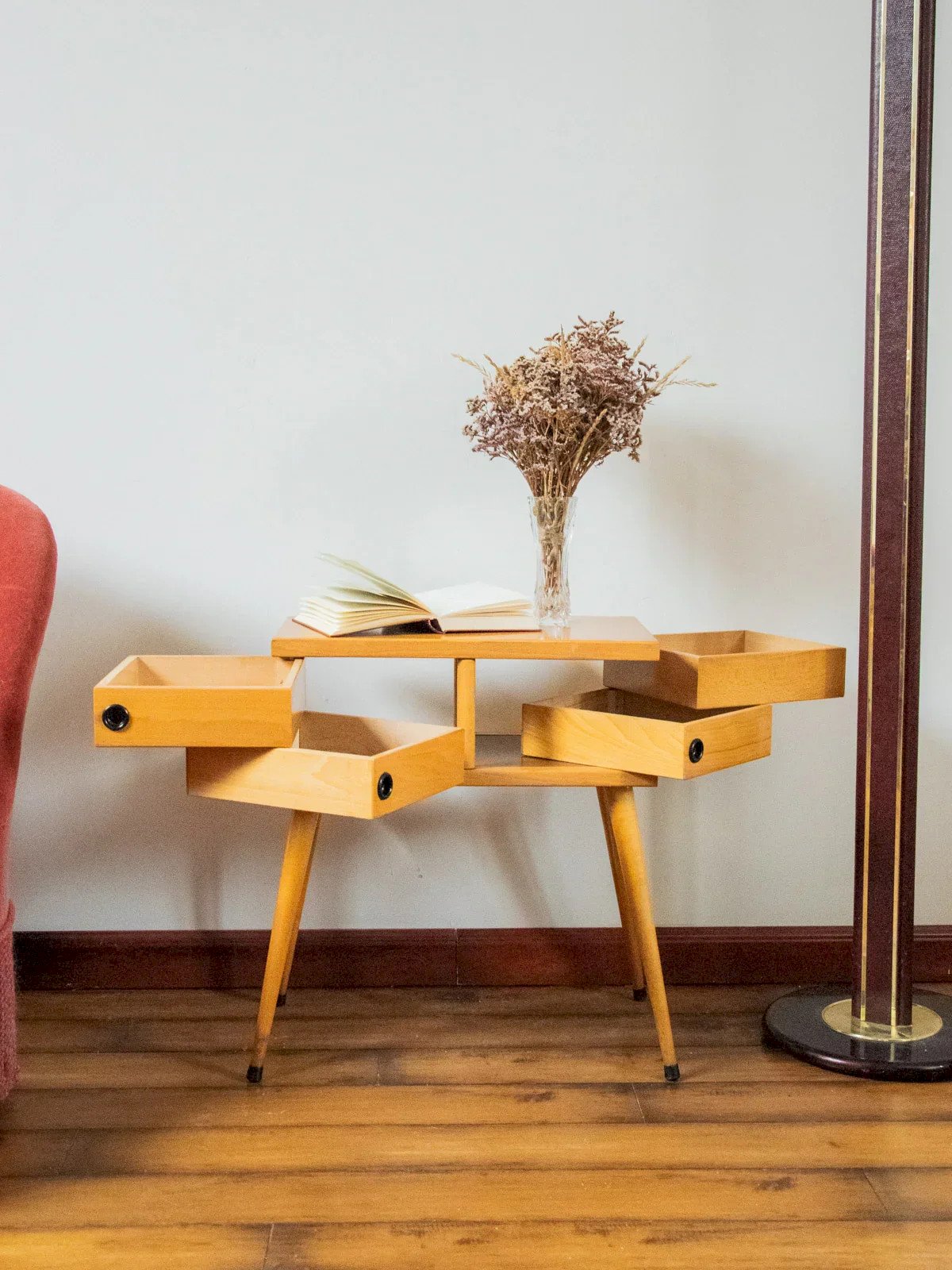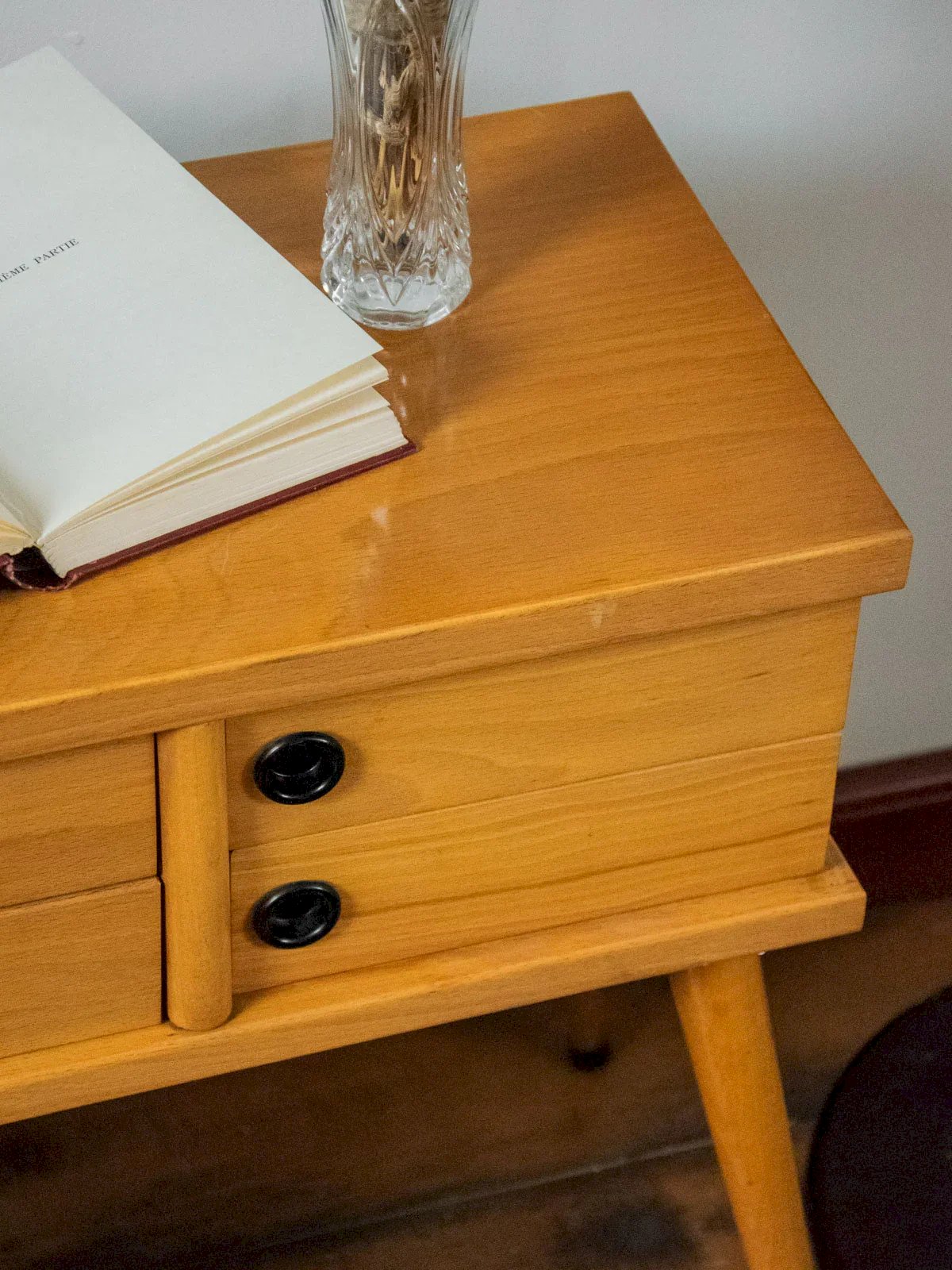 Découvrez cette travailleuse en bois au style rétro, idéale comme chevet ou petite console pour un coin lecture. Compacte mais généreuse en rangement, elle repose sur des pieds compas élégants et dévoile des tiroirs pivotants qui s'ouvrent en sens inverse, dotés de prises d'ouverture rondes en plastique noir ; les tiroirs coulissent parfaitement et accueillent accessoires ou couture avec facilité. Deux tiroirs sur la face avant, et deux tiroirs sur la face arrière. Quelques traces du temps sur le dessus du plateau. Longueur : 48 cm Largeur : 27 cm Hauteur : 55,5 cm Hauteur tiroir : 6 cm Dimensions des tiroirs : 22 cm x 19,5 cm État:Occasion: Objet ayant été utilisé. Objet présentant quelques marques d'usure superficielle, ...Occasion: Objet ayant été utilisé. Objet présentant quelques marques d'usure superficielle, entièrement opérationnel et fonctionnant correctement. Il peut s'agir d'un modèle de démonstration ou d'un objet retourné en magasin après une courte période d'utilisation. les éventuelles imperfections. Marque:Debongout Type:Produit chiné Matériau:Bois, Plastique Style:Campagne Personnalisé:Travailleuses