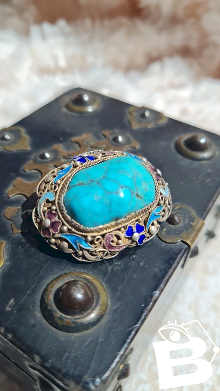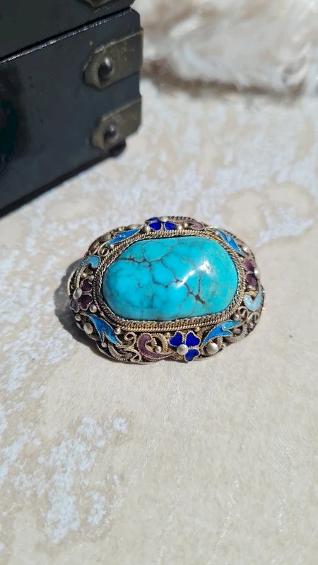 Broche ancienne chinoise en turquoise naturelle et émaillée en argent Argent/Pierre