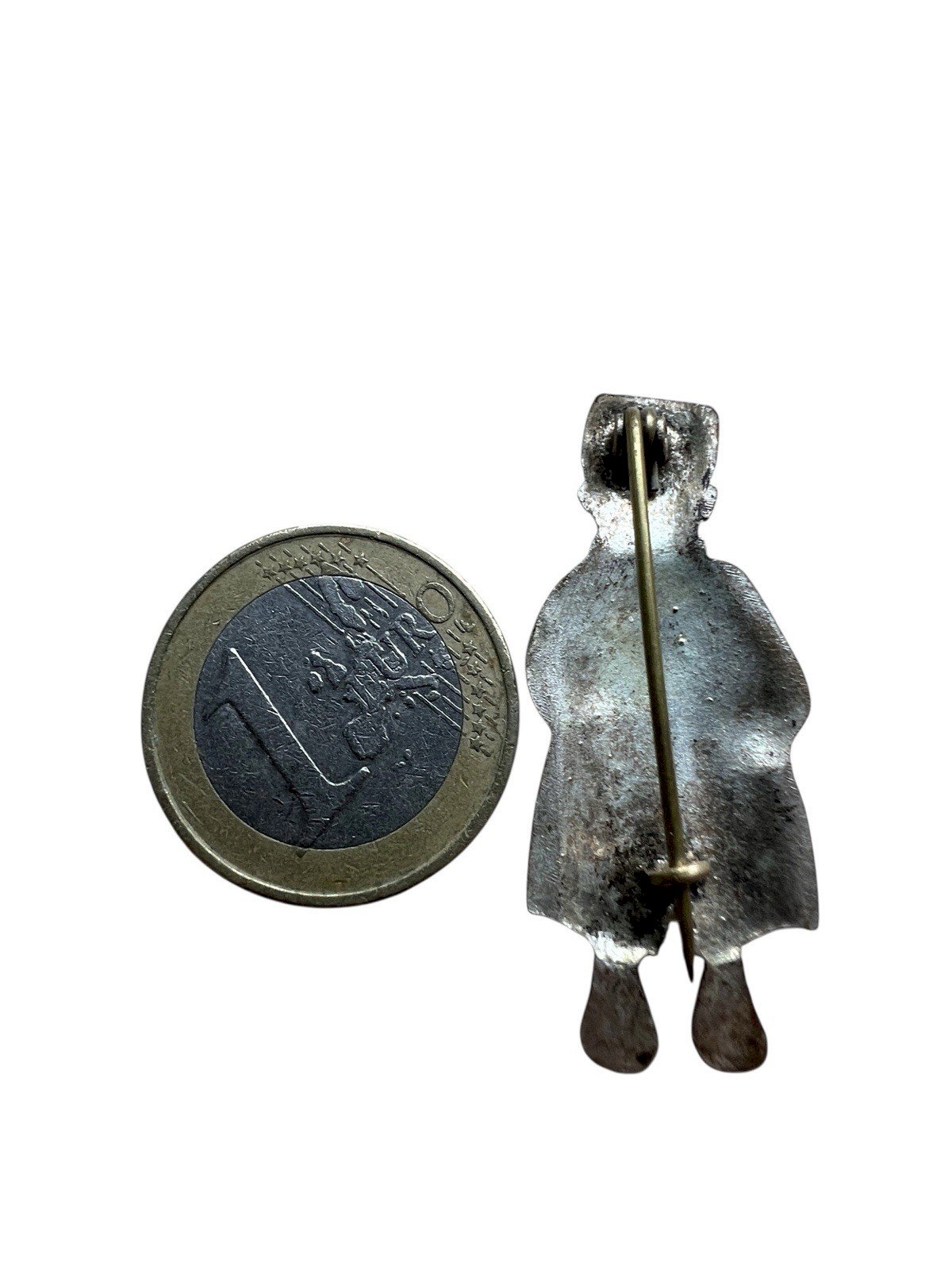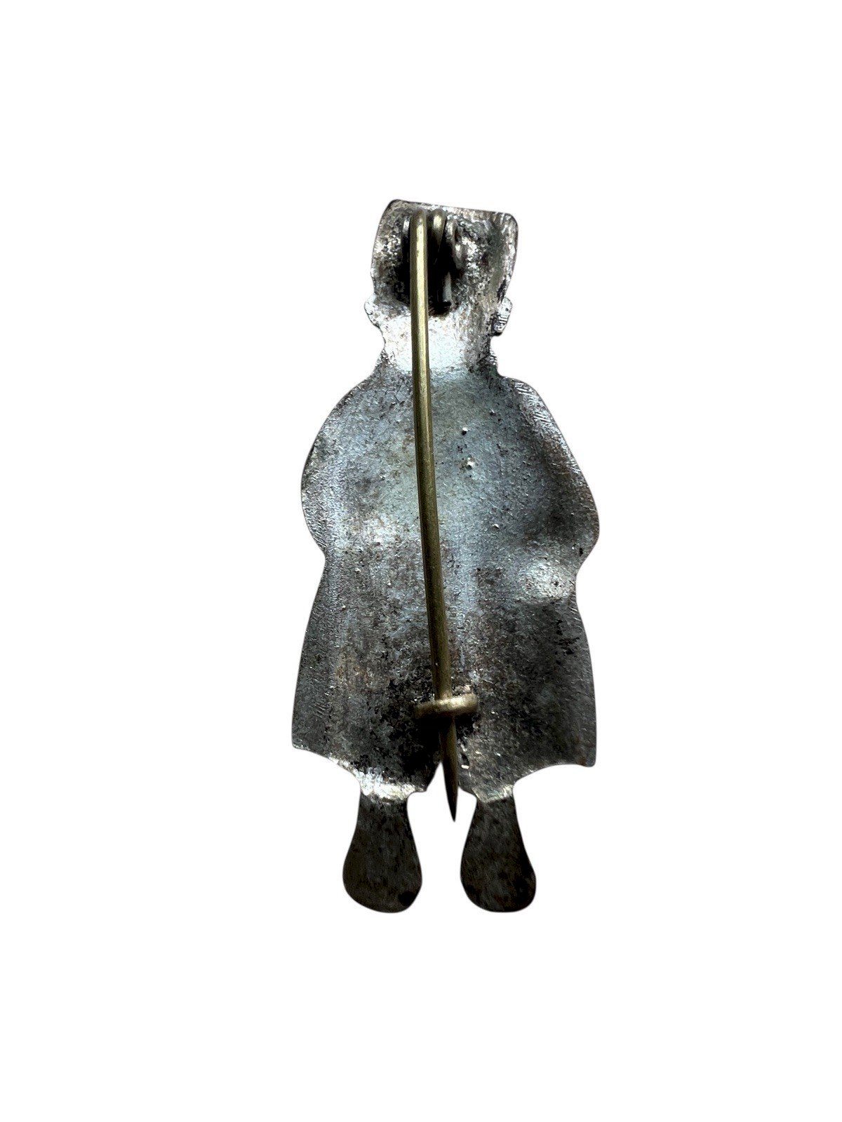 Broche 1920 Personnages strasse. C'est une broche figurative de Art Déco représentant un petit personnage masculin, souvent appelé "Blackamoor" ou "Jazz Age" figure dans le contexte des bijoux fantaisie des années 1920-1930. Broche de l'ère Art Déco mesurant environ 4 cm de long pour environ 1,6 cm de large. Elle représente une figure unisexe de type "Blackamoor" ou "Jazz Age", caractéristique des bijoux fantaisie de cette époque. Le personnage porte une casquette et un long manteau entièrement serti de strass incolores. Il arbore une cravate ou un nœud émaillé de couleur verte. Des accents de strass colorés, rouges à gauche et verts à droite, ornent la partie inférieure du manteau. Le visage, les mains et les jambes sont en métal avec une finition foncée, contrastant avec l'éclat des strass. Des petits manques d'argenture et de laque sont visibles, témoignant de son âge, mais son charme demeure intact État:Occasion: Objet ayant été porté. ...Occasion: Objet ayant été porté. les éventuelles imperfections. Type:Broche Matière:Strass Thème:Personnage