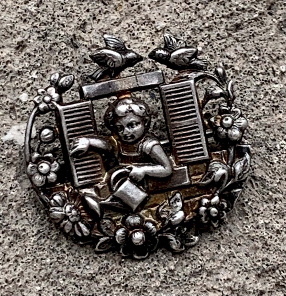 broche art nouveau métal argenté putto à la fenêtre romantique fleurs oiseaux