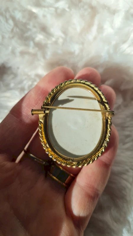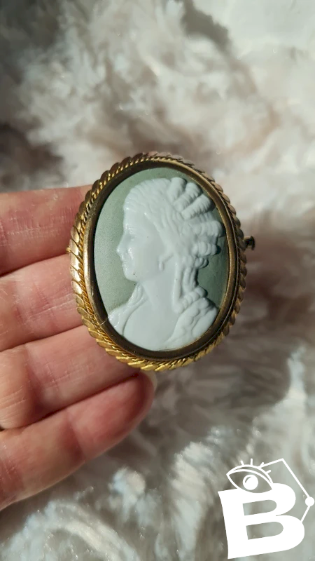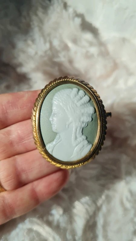 Broche camée vintage en porcelaine fond vert céladon Métal/Porcelaine