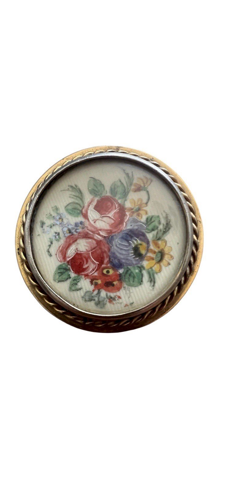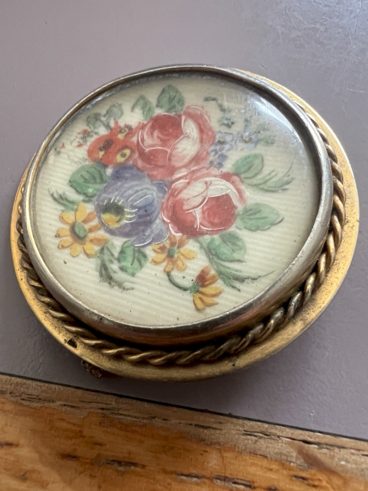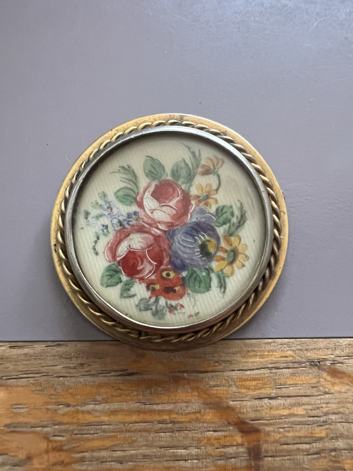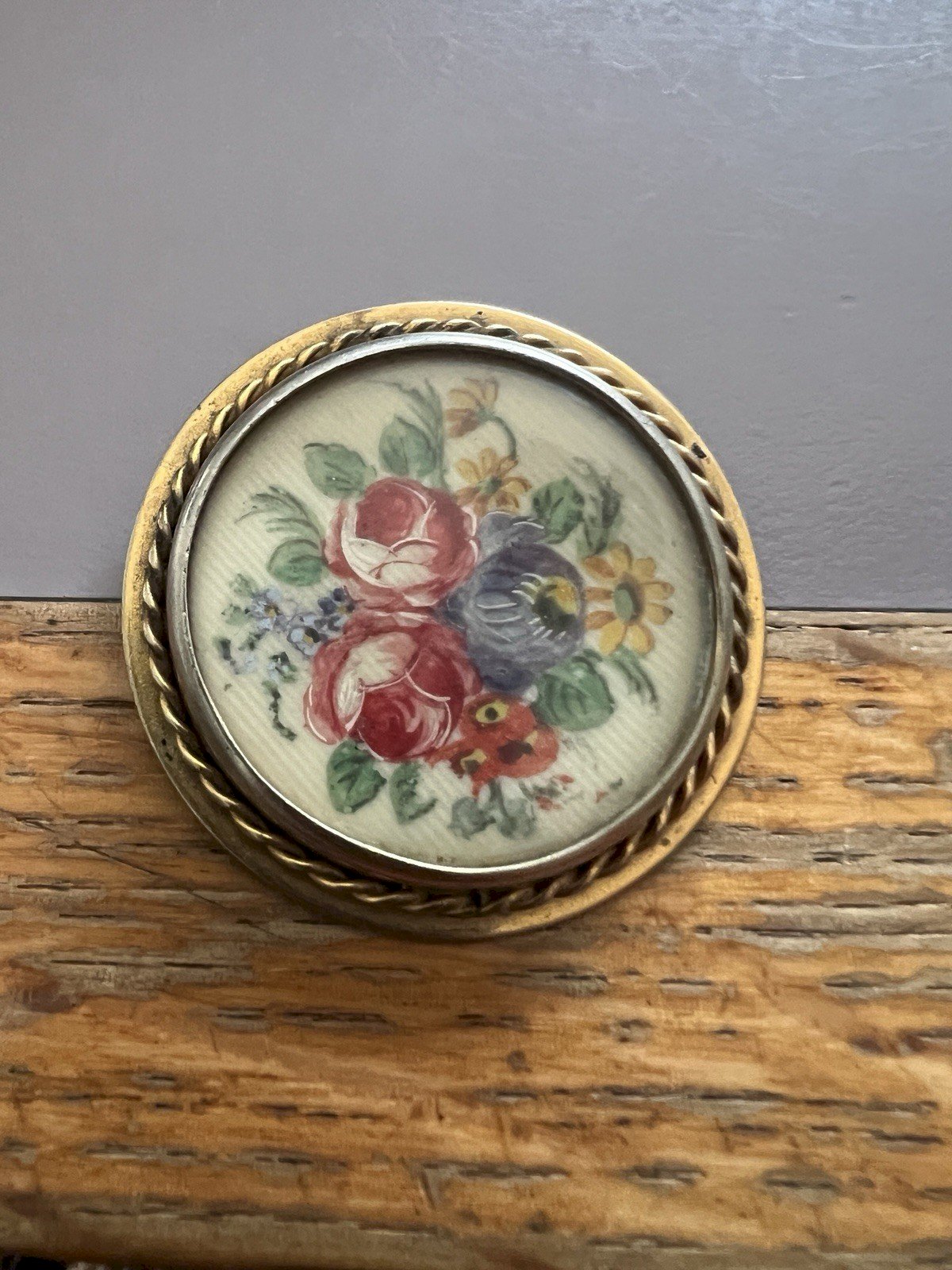 Ravissante broche rétro de forme circulaire datant des années 1940 ou 1950. Cette pièce authentique présente un délicat bouquet de fleurs peint à la main sur un support en galalithe. Le décor floral coloré est protégé par un opercule en plastique d'origine. La monture en métal doré affiche une jolie patine ancienne avec quelques traces d'usage par endroits qui témoignent de son vécu et de son charme vintage. Le contour est travaillé avec un effet de torsade élégant. Ce bijou ancien mesure environ 5 cm de diamètre. Merci de bien lire la description et de vérifier les dimensions avant achat. Les photos font partie intégrante du descriptif et permettent d’apprécier l’état de l’objet. Bijoux anciens ou vintage ayant été portés : de légères traces d’usage peuvent être présentes. Envoi soigné et bien protégé après paiement. État:Occasion: Objet ayant été porté. ...Occasion: Objet ayant été porté. les éventuelles imperfections. Type:Broche Marque:Vintage Brooch Pays d'origine:France Couleur dominante:Multicolore Matière:Galalithe Métal:Alliage Thème:Fleur
