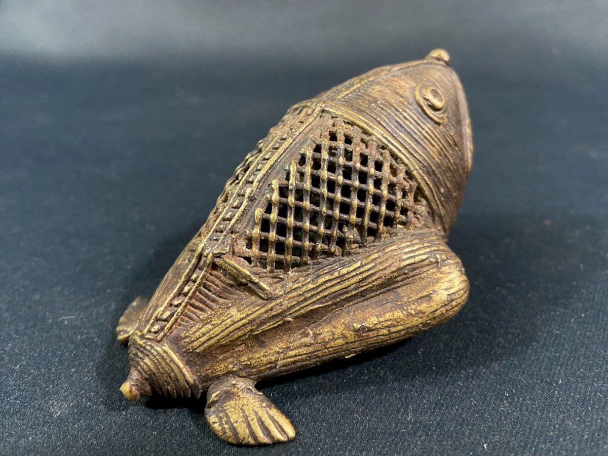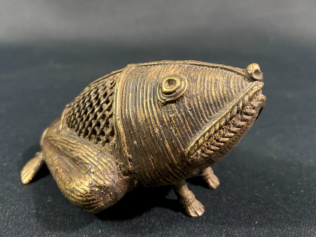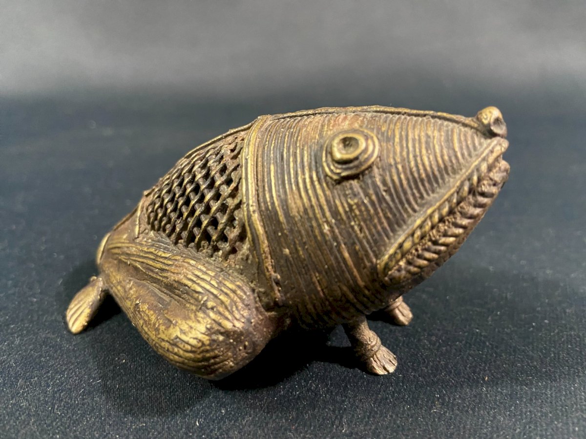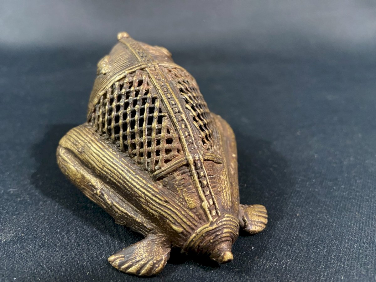 Brûle-parfum tribal Dhokra en bronze, cire perdue puis ciselé, en forme de grenouille. Dos ajouré (grille) pour laisser passer la fumée, chargement par l'orifice sous le ventre  Chhattisgarh (Bastar), Odisha, Bengale Epoque : fin XIXe - milieu XXe Dimensions max : 8,3 x 6,5 x Hauteur 4,5 cm Poids : 158 grammes Envoi TRES soigné dans le monde entier Authenticité:Original Type:Brûle-parfum Origine:Inde Pays de fabrication:Inde Matière:Bronze