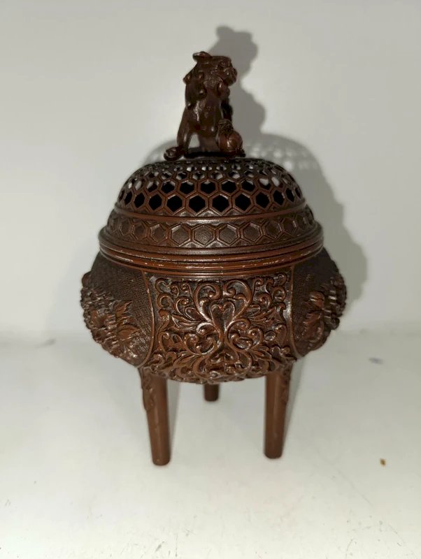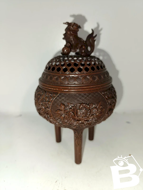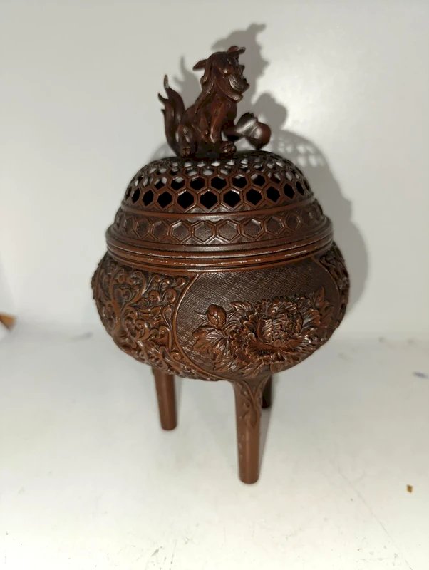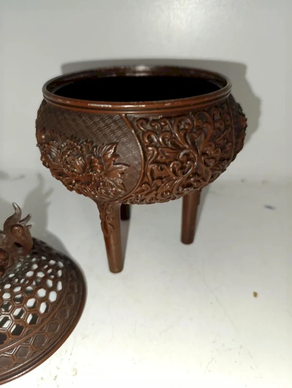 Brûleur d'encens, signé par Sano Kosai japon fin du 20eme siecle en bon etat semble etre en metal couleur suivre Coutellerie Takaoka un peu d'usures de la patine principalement à l'interieur de l'encensoir hauteur complete 19cm