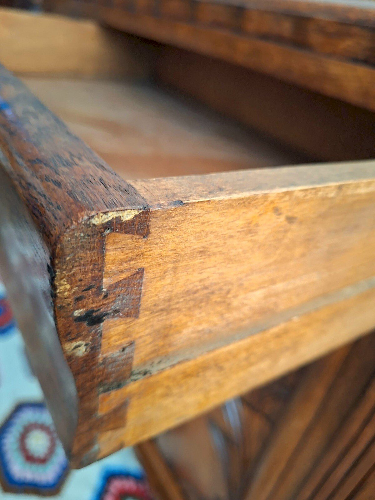 Merci de m’écrire si vous souhaitez me faire une offre. Buffet art déco plateau marbre, meuble vaisselier ancien Dimensions 140x41xh102cm. Une poignée en métal sur le tiroir. 3 clefs d’origine fonctionnelles. Tiroir monté en queue d’aronde. Traces très discrètes d’usage. Belle capacité de rangement. Motifs et découpes géométriques et floraux. Très jolie couleur de marbre, esprit terrazzo. Bois massif. Remise à mon domicile ou livraison possible via transporteur (ex 80€ vers Paris et région parisienne, me contacter pour d’autres destinations). Les délais de livraison de 2 à 4 jours sont imposés par et sont donc donnés à titre purement indicatif. Enfilade vintage nouveau living bahut Période:Art Déco
