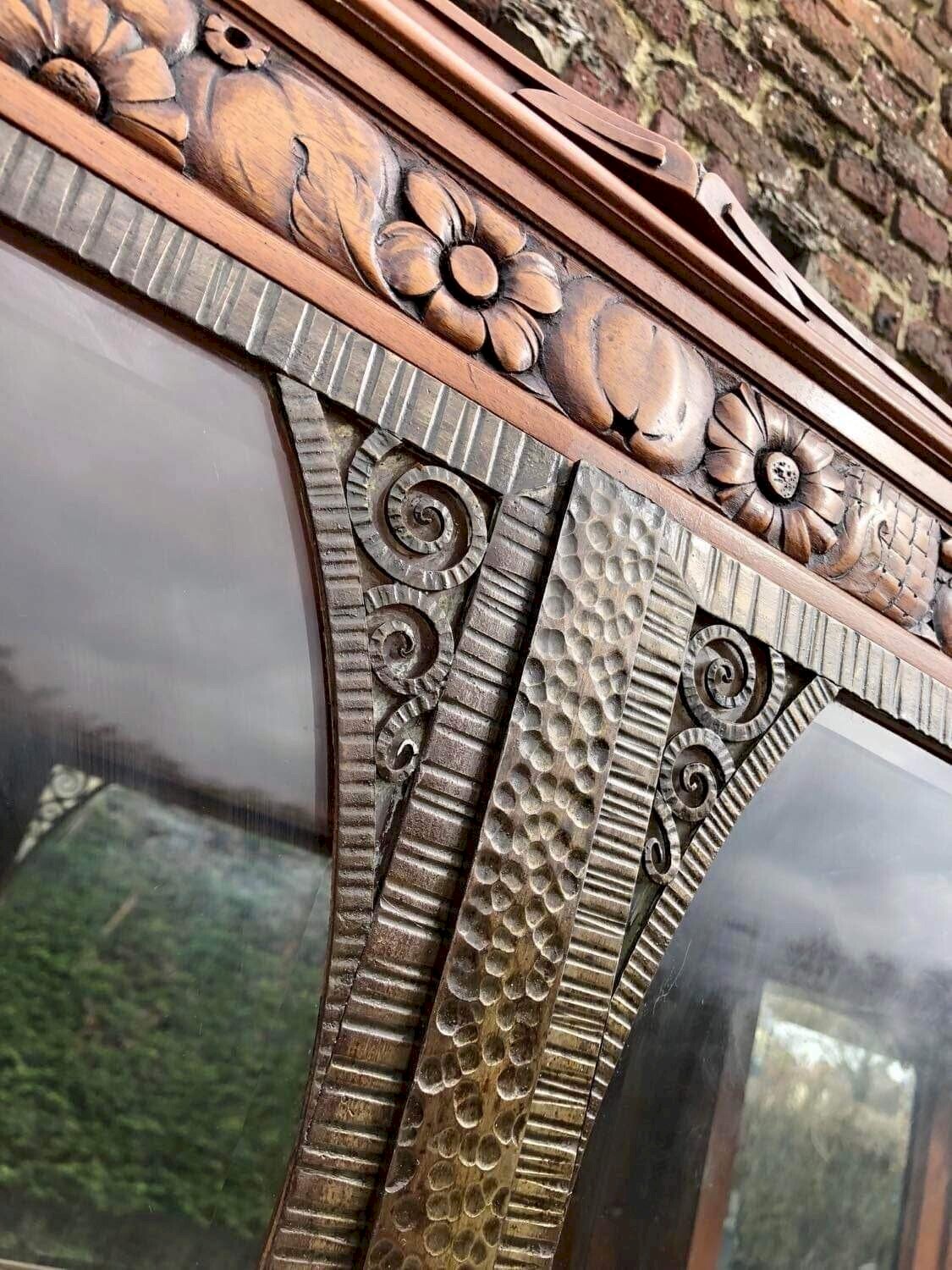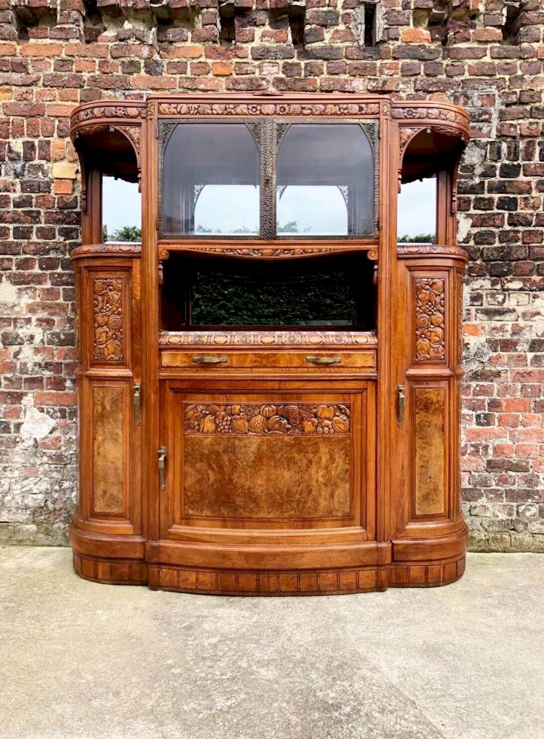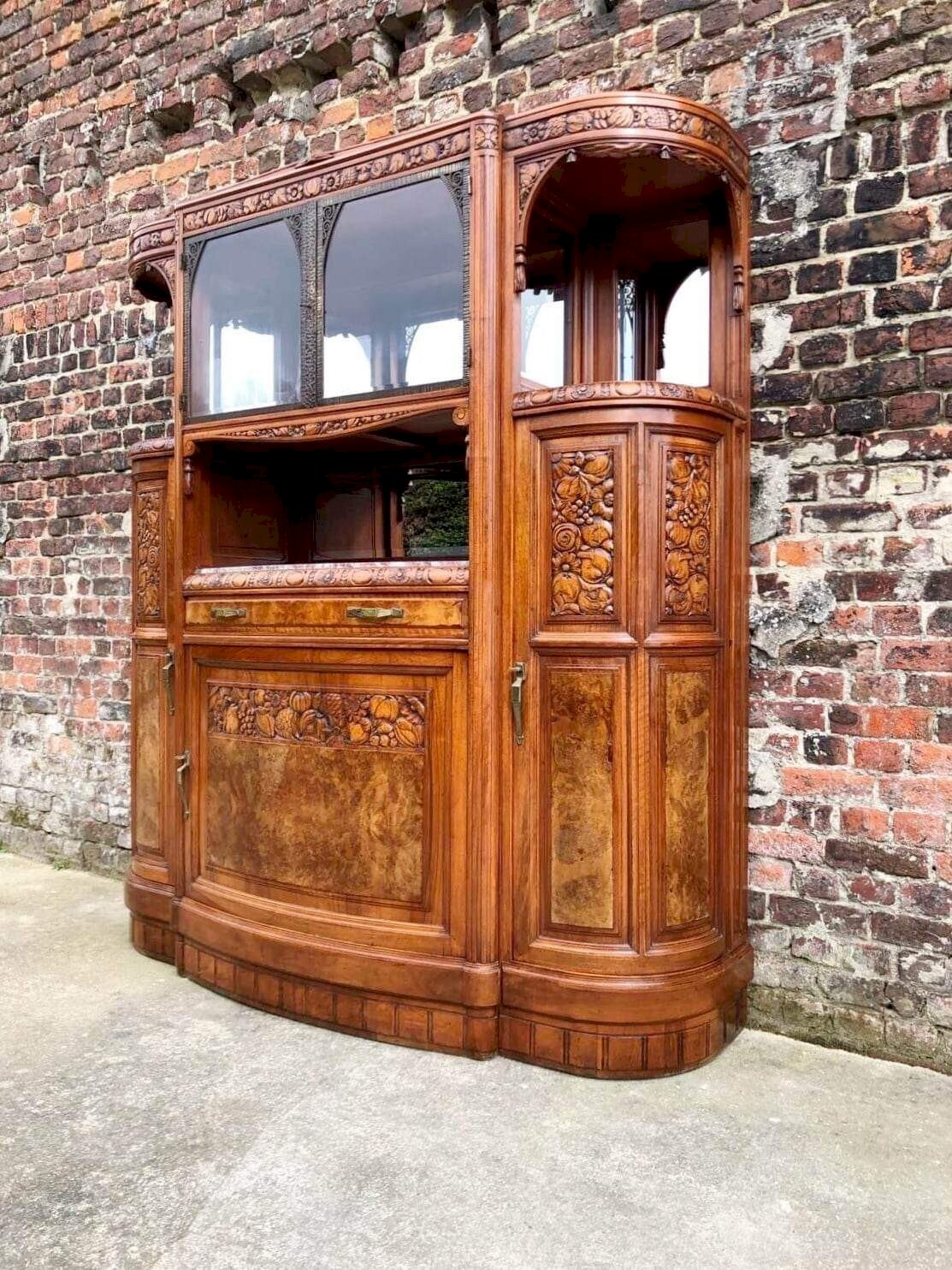 Buffet art déco plateau marbre, meuble vaisselier ancien Forme demie lune en noyer et loupe. Facade ouvrant par vantaux délicatement sculptés de fruits stylisés et 1 tiroir. Poignées et pourtour des portes vitrées en métal. Miroirs dans le fond du meuble. 4 clefs d’origine fonctionnelles. Marbre aux couleurs rares: violet, gris, blanc. Dimensions 185x55xh208cm. Tiroir et portes montés en queue d’aronde. Ce meuble est ancien et comporte donc des traces normales d’usage et d’utilisation discrètes: colorations et décolorations, traces minimes d’oxydation des parties métal, quelques légers manques de marqueterie. Il est en très bon état général au regard de son âge. Lourd et solide. Démontable en 3 parties pour le transport. Remise à mon domicile ou livraison possible via transporteur (ex 200€ vers Paris et région parisienne, me contacter pour d’autres destinations). Les délais de livraison de 2 à 4 jours sont imposés par et sont donc donnés à titre purement indicatif. Mc enfilade vasque vintage nouveau Période:Art Déco
