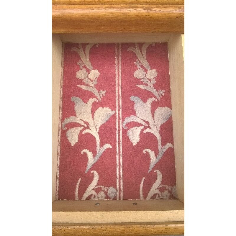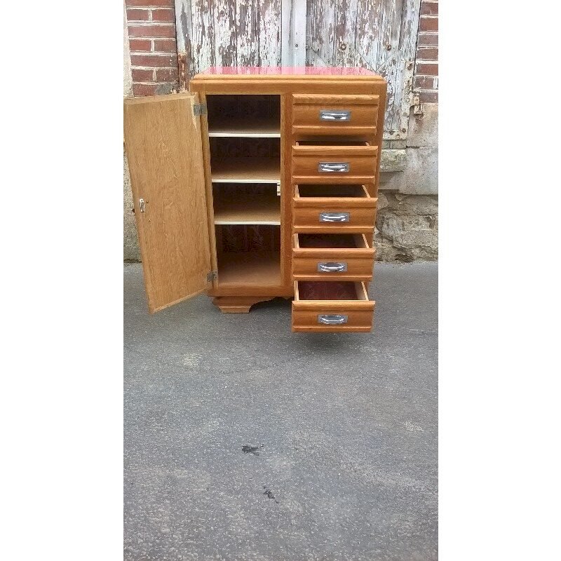 Superbe buffet parisien année 60. Ce buffet est aménagée de 5 tiroir et un coté avec 3 étagères. Le fond et les tiroirs on été aménagée d'un papier peint des année 70. Le plateau est en formica d'origine. Hauteur totale 100 cm. Largeur 72 cm. Profondeur extérieur 43 cm. Profondeur intérieur 38 cm. Quelque marque du temps(dans l'ensemble belle état de conservation). Ce buffet est stable et solide.