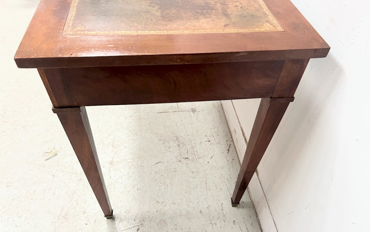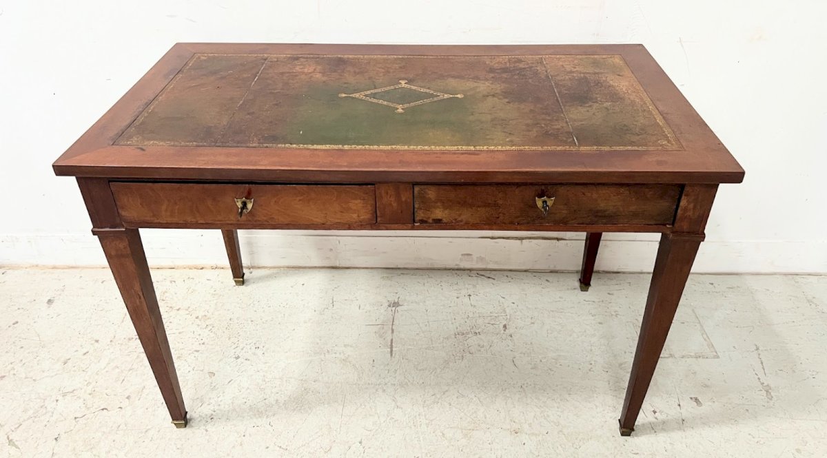 Bureau plat de style Directoire en acajou et placage Quatre pieds coniques a bagues de bronze Deux tiroirs en façade Dessus en cuir vert a rehaut d'or usagé voir les photos Bon état Dimension H 75 x L 115 x 60 cm Epoque fin du XIX siècle Couleur:Multicolore Type:Bureau simple Période:Design du XXème Sous-type:Avec tiroir Hauteur:75 Matière:Acajou Longueur:115 Largeur:60