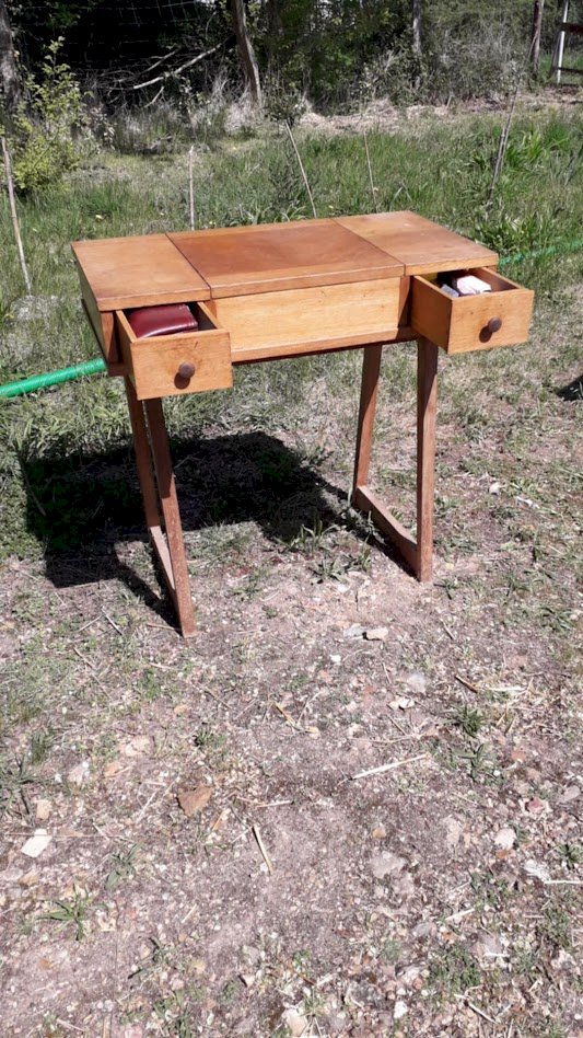 Charmant petit bureau vintage en bois massif, doté d’un abattant central ouvrant et de deux tiroirs latéraux.