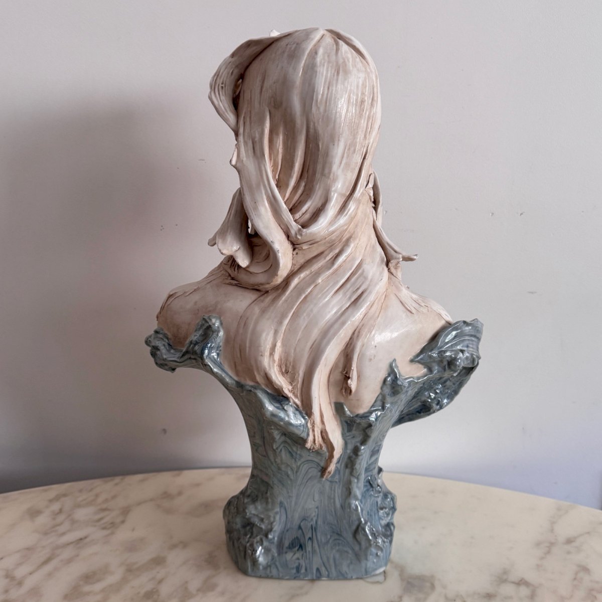 Buste en céramique Art Nouveau 1900 Royal Dux Bohemia M3679 Ce buste en céramique a été réalisé par Royal Dux.  La fabrique Royal Dux, marque de porcelaine de Bohême, s’est illustrée au début du XXe siècle par ses productions de style Art Nouveau. Autour de 1900 cette importante manufacture réalisait des vases, des figurines, souvent des sujets féminins, dans des décors exubérants de fleurs, de feuilles sur des socles de coquillage, de fontaine... La porcelaine était laissée sous forme de biscuit, dorée ou peinte, souvent en vert. Cette céramique est typique Art Nouveau, notamment pour le côté végétal et "Nouille". La partie du bas est irisée en bleu. Nous signalons un petit accident dans les cheveux, le reste est en superbe état de conservation  Nos photos vous permettent d'apprécier la qualité de l'objet. Pour l'état, merci de bien détailler les photos. N'hésitez pas à zoomer . Les photos font partie intégrante de la description. Dimensions : Hauteur : 52 cm Largeur : 35 cm Profondeur : 25 cm A :  I3ORC0L8WK P :  1614108   Je reste à votre disposition pour toute question. Type:Objet de vitrine, Décoratif Période:Art Nouveau Hauteur:52 cm Matière:Céramique Style:Art Nouveau Longueur:cm Largeur:35 cm