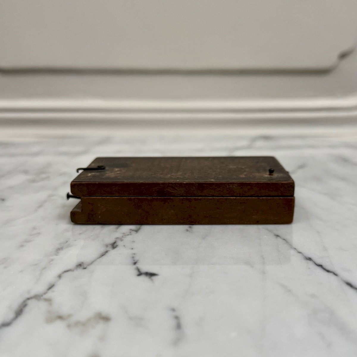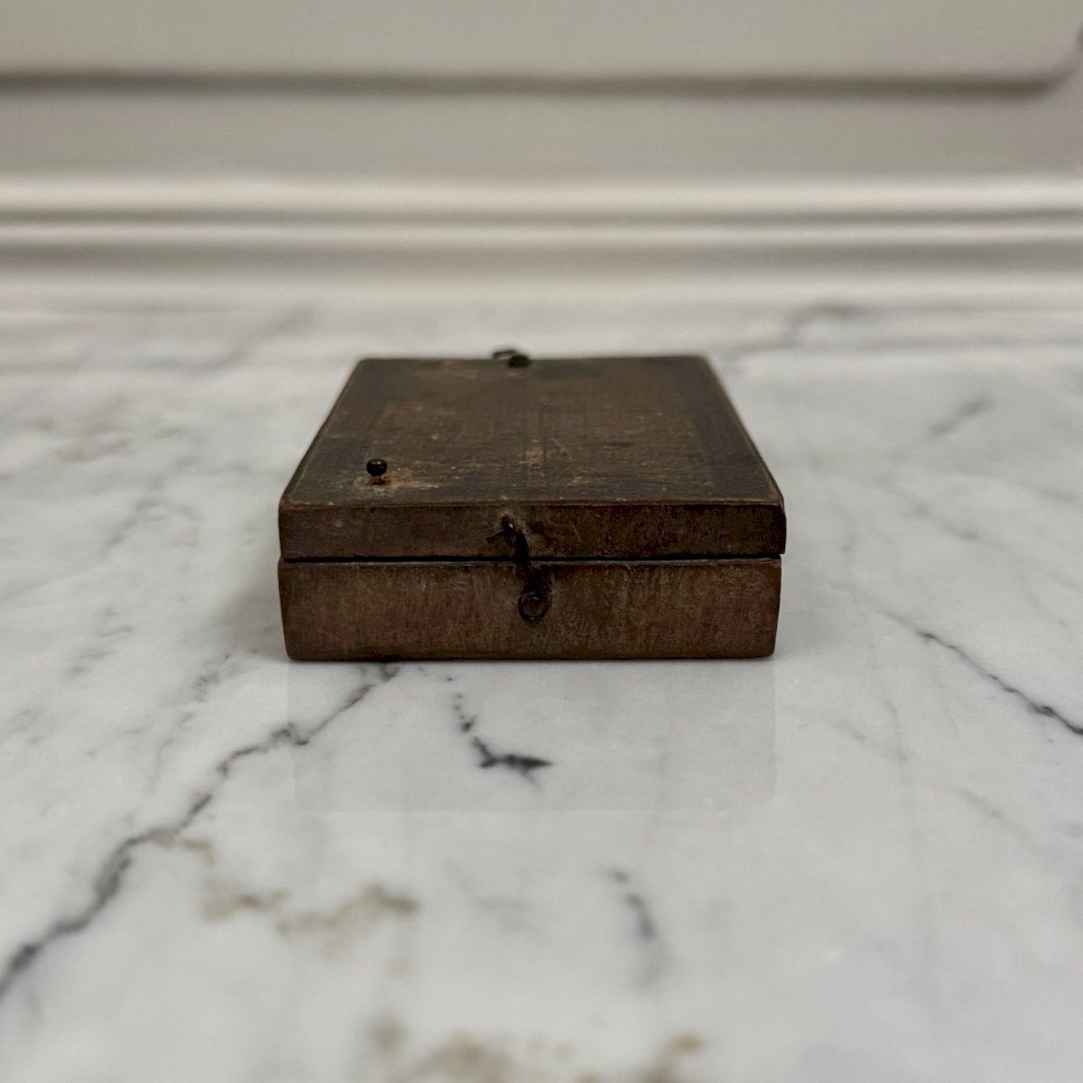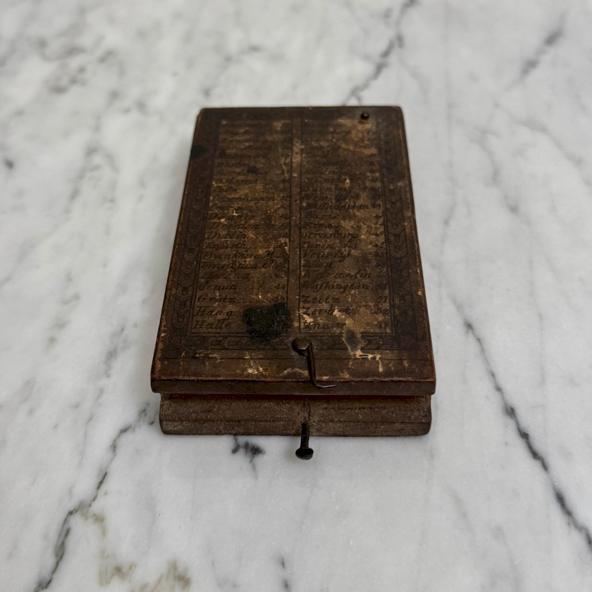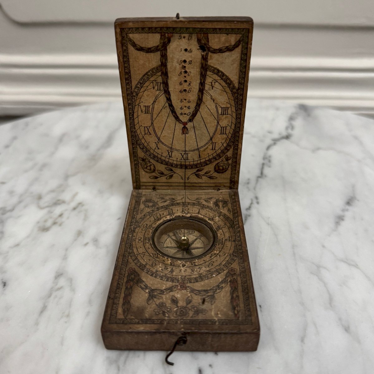 Cadran solaire de poche portatif en bois XVIIIe M3921 Ce cadran solaire de poche en bois est d'époque fin XVIIIe. Le dos est recouvert d'un papier portant une liste des principales villes d'Europe, à l'intérieur on trouve un cadran solaire avec une boussole d'orientation. Pour l'état, notons des traces d'usure dues à l'usage, des petits manques. Le tout reste présentable. Nos photos vous permettent d'apprécier la qualité de l'objet. Pour l'état, merci de bien détailler les photos. N'hésitez pas à zoomer . Les photos font partie intégrante de la description. Dimensions : Hauteur : 1,7 cm Largeur : 5,8 cm Profondeur : 8,7 cm Diamètre cadran boussole : 2 cm A :  LB77LACL9Z P :  1668825   Je reste à votre disposition pour toute question. Type:Objet de vitrine, Décoratif Origine:France Pays d'origine:France Sous-type:Cadran solaire Hauteur:1,7 cm Matière:Bois Longueur:cm Largeur:5,8 cm