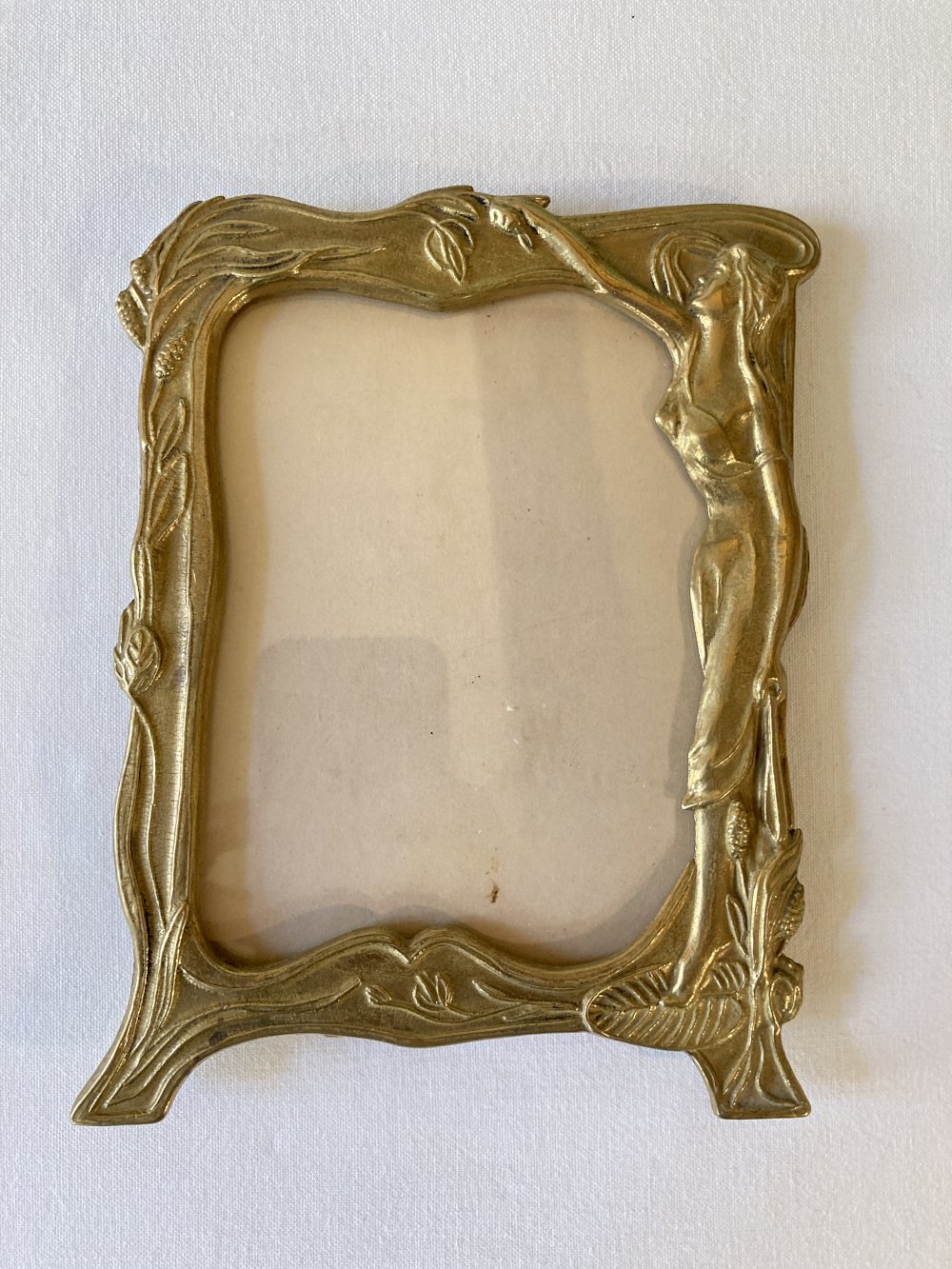 Ravissant et délicat cadre de style Art Nouveau en laiton, avec décor de femme et végétaux. Années 1950. En état irréprochable pour son âge. Verre et carton de protection d'origine.