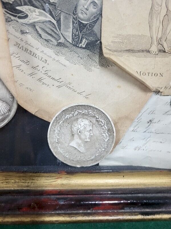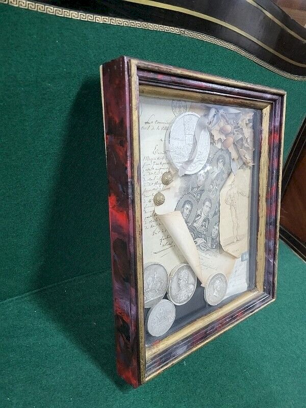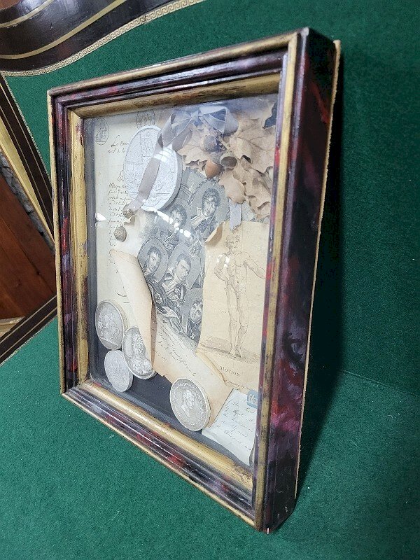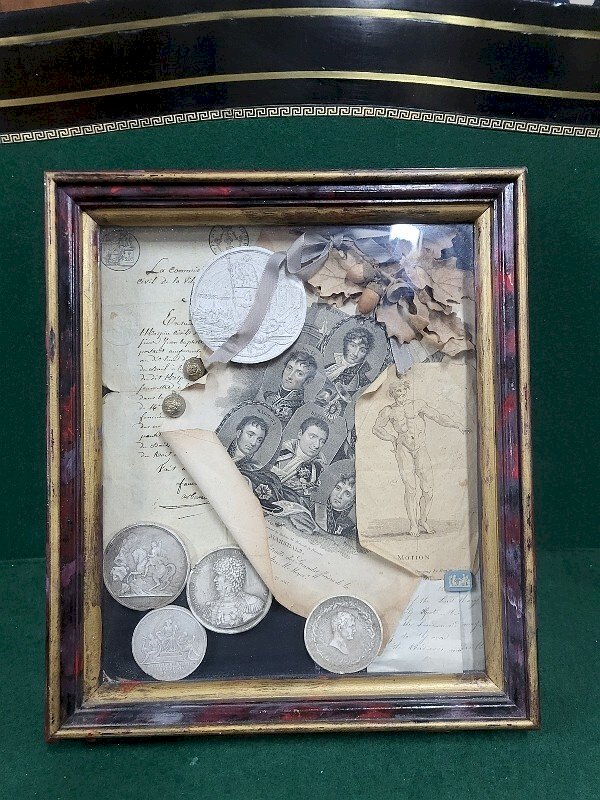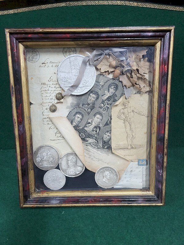 superbe cadre composition sur Napoléon il est en bon état c'est un très bel ensemble très décoratif il y a des vieux papiers et diverses choses il mesure 31 cm de large sur 36 cm de haut et 5 cm d'épaisseur Type:CADRE COMPOSITION SUR NAPOLEON