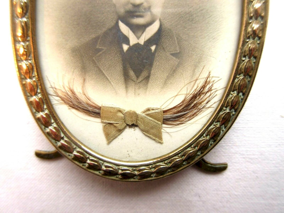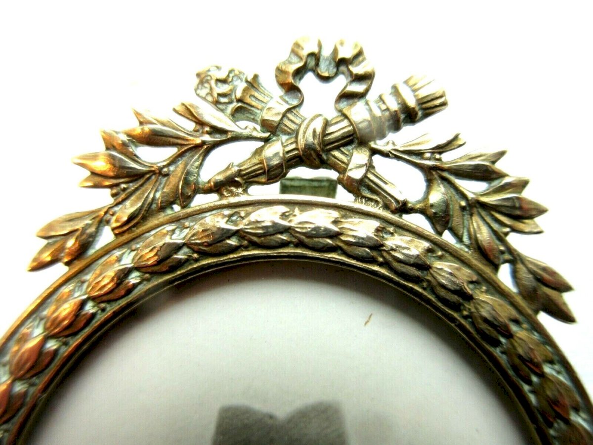 Vente dans le monde entier. Cadre Napoléon III. Ancien cadre médaillon ovale tout en bronze. En haut, un fronton avec noeud et palmes. Le tour du cadre est sculpté  de fines feuilles de laurier. A l'arrière, une béquille pour le poser. Sous le verre, un homme au chapeau gris et une mèche de cheveux liée par un ruban. L'ensemble est de qualité. Bon état, sans défaut. Dimensions: 9,5 cm sur 6 cm. Verre: 7 cm sur 5 cm. A collectionner ou à offrir. Couleur:Doré Type:Cadre photo Période:XIXème et avant Matière:Bronze Caractéristiques:A poser Dimension (cm):10x15