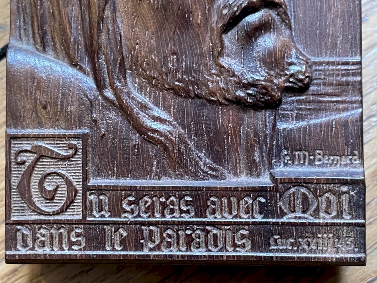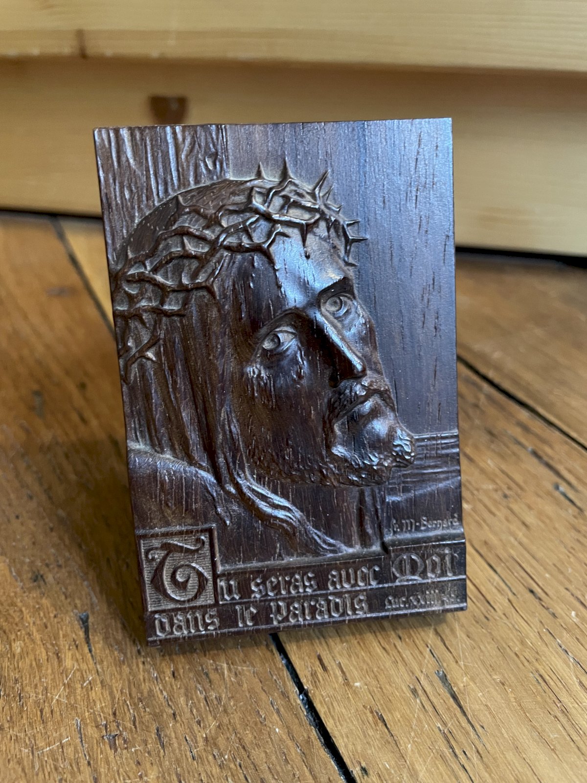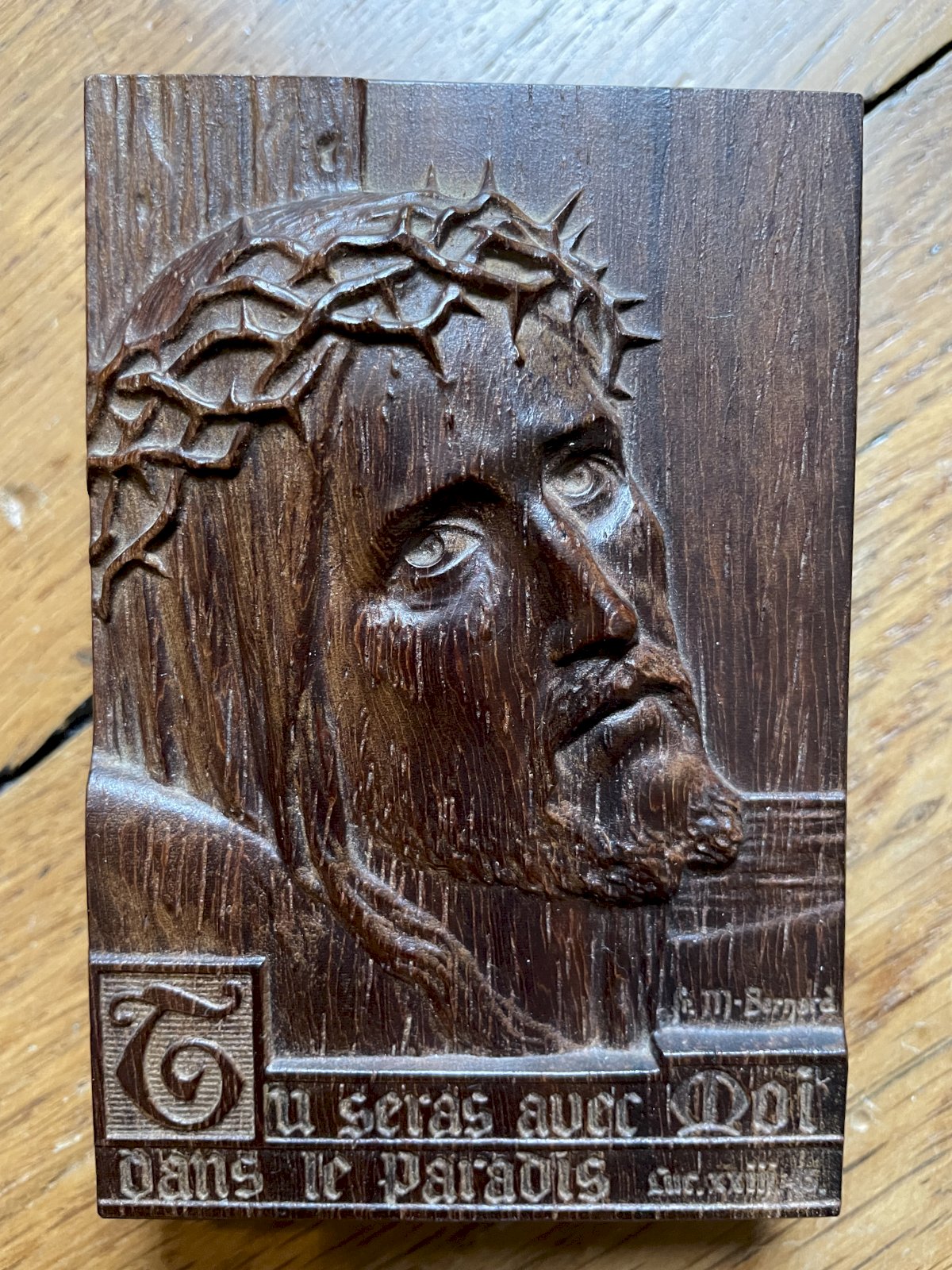 Cadre-sculpture sur bois visage du Christ, signé Marron Illustration