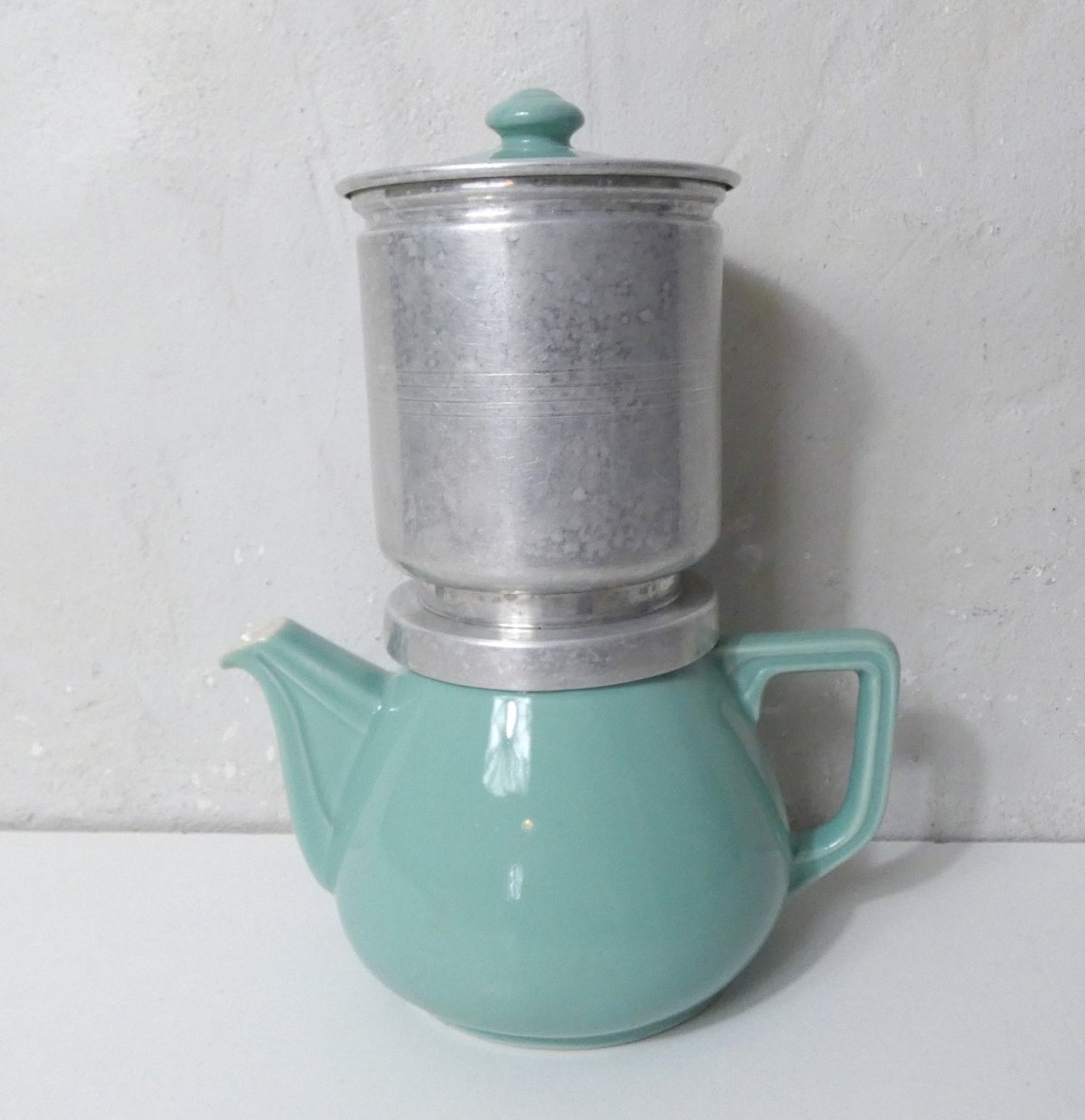 Ancienne cafetière de bistrot, en faïence de couleur mint. Avec son filtre à café en alu. Hauteur avec le filtre: 28 cm. Hauteur sans le filtre à café: 16 cm. Largeur: 14,5 cm. Profondeur: 22 cm. En très bon état, quelques traces d'usage et de vieillissement superficielles au niveau du filtre. Elle fait un excellent café.