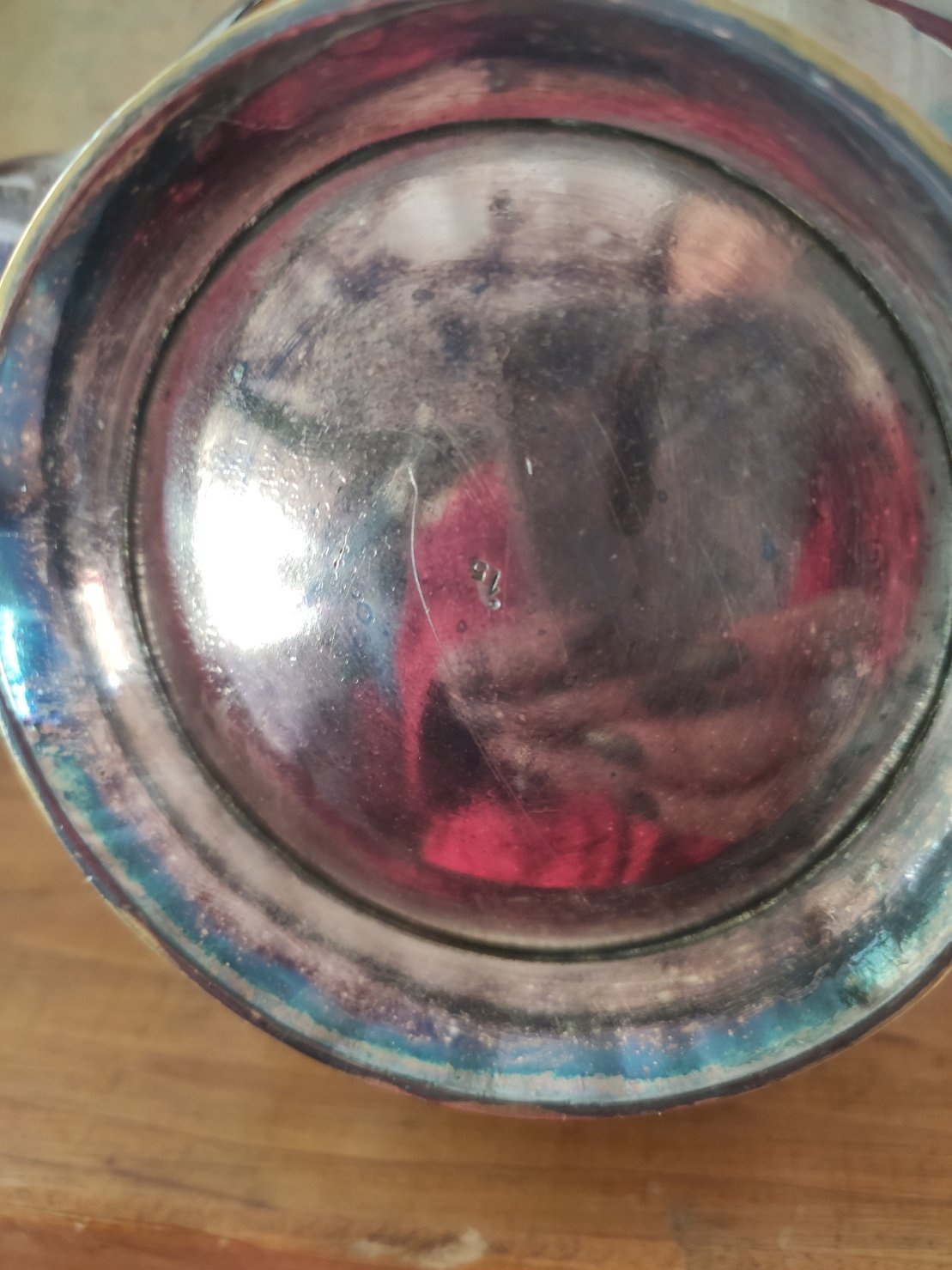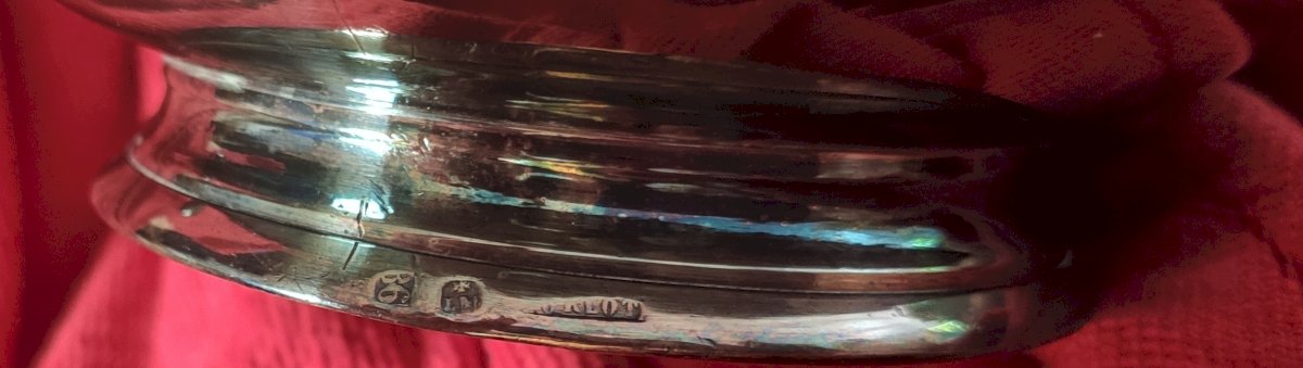 Magnifique pièce d'orfèvrerie française signée KRETLY (nom frappé sur le socle), modèle n°98 gravé sur le pied. Poinçon de maître d'orfèvre et grammage d'argent "15" garantissant la qualité du plaquage. Cette pièce est authentique, signée 3 fois. Datation 1930 - 1950. Oxydation naturelle. détails: présence de bagues isolantes sur l'anse en parfait état, permettant de servir sans se brûler.