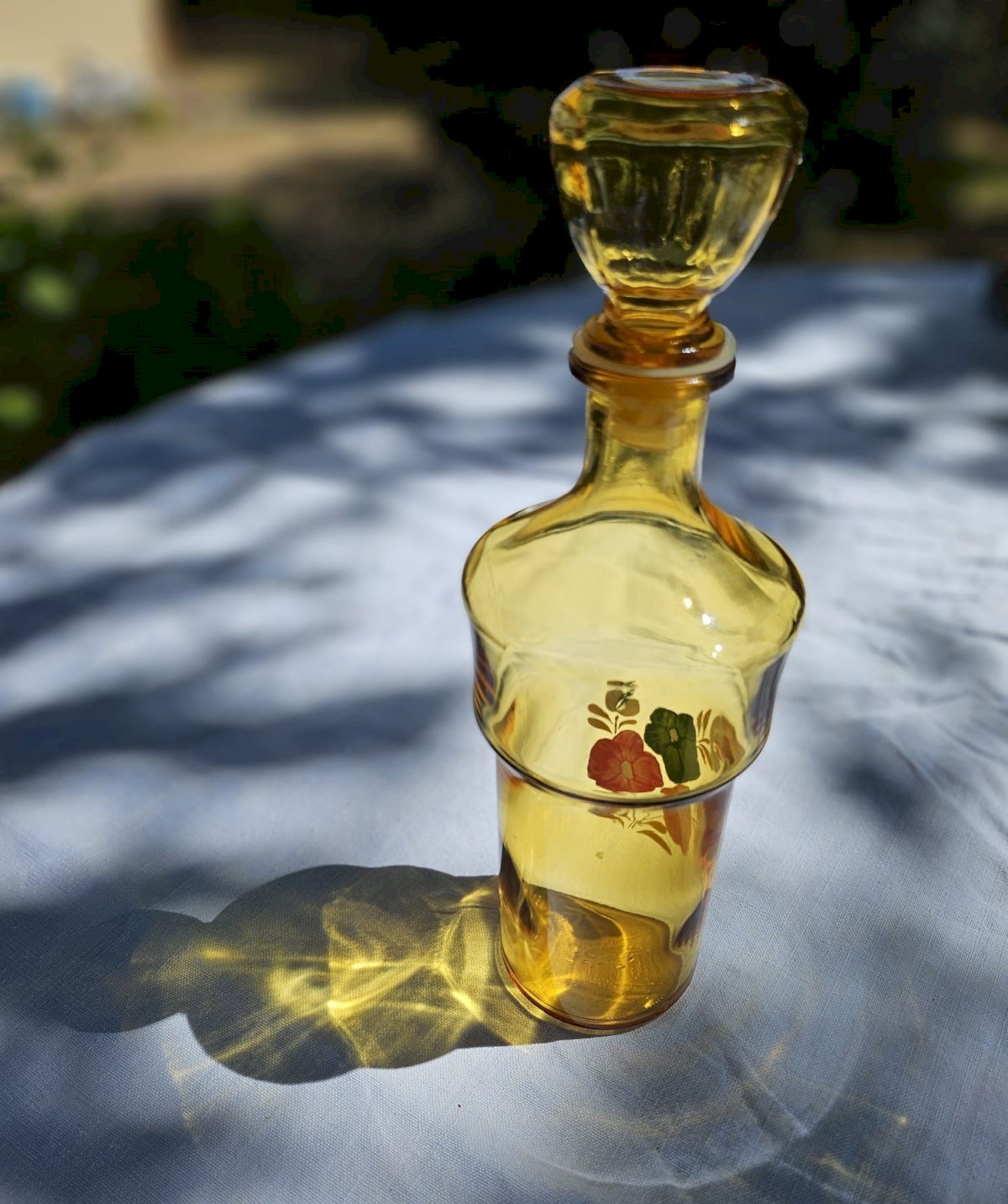Carafe verre teinté jaune avec des motifs de fleurs peinte.