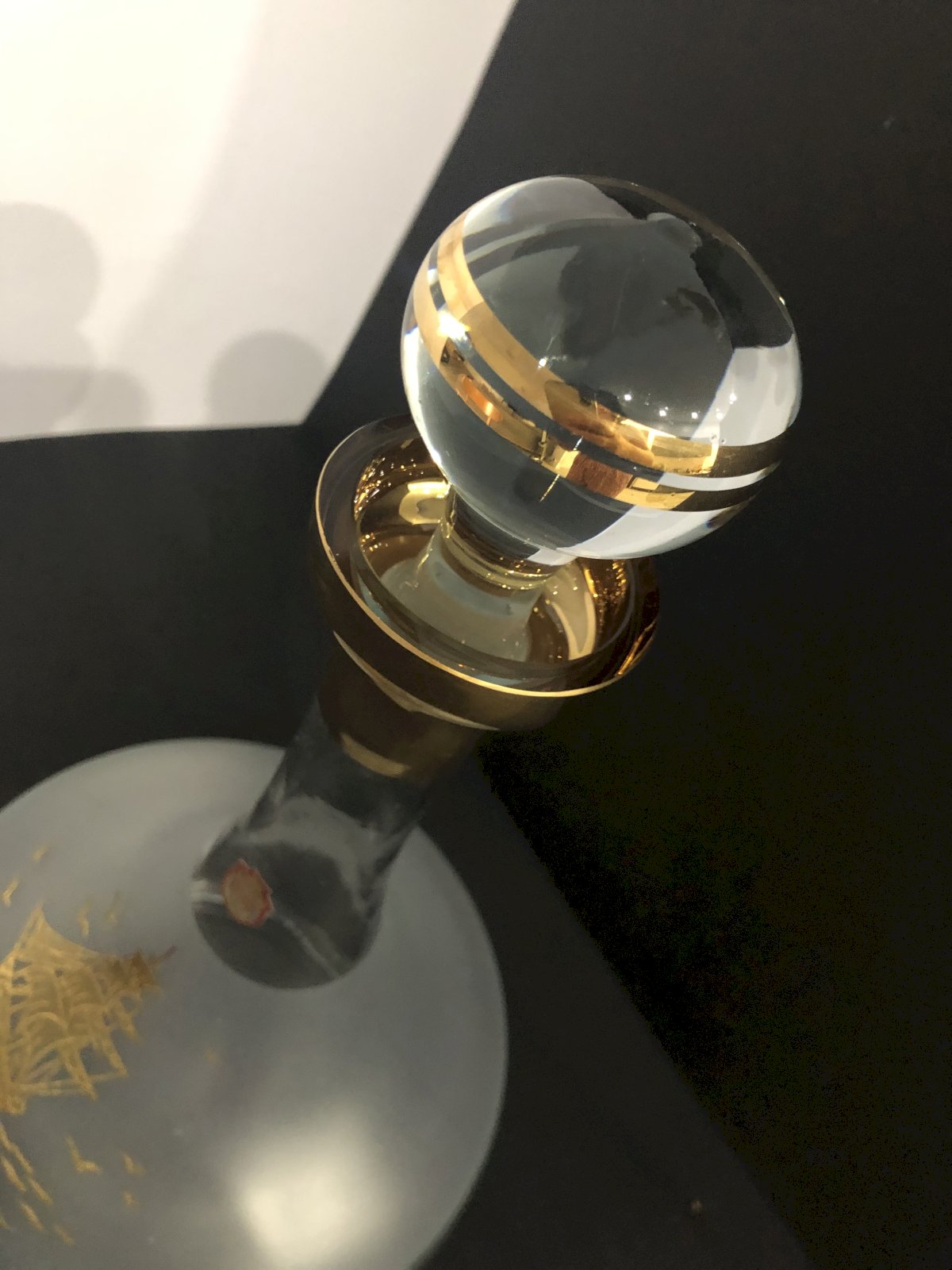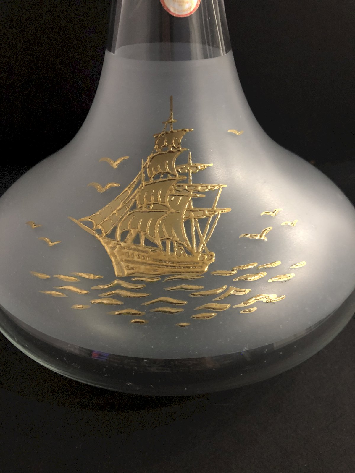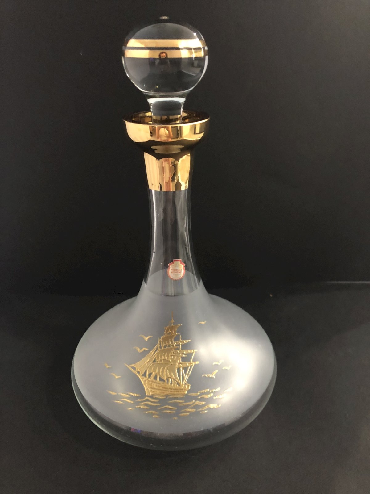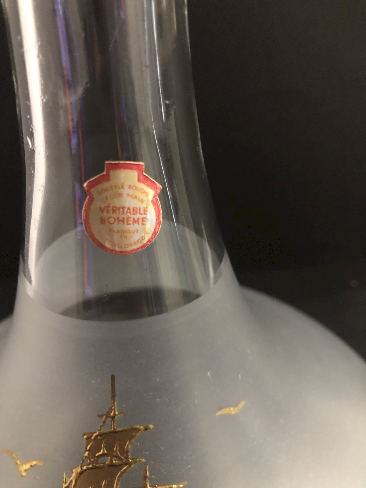 Superbe carafe en cristal de bohème, décorée à la main. Etiquette d'origine. Décor original représentant un voilier doré en relief. Très bon état, pas d'éclat, ni de fêlure. Période estimée années 1960 / 1980. Taille : H 31 cm, diamètre à la base 18 cm