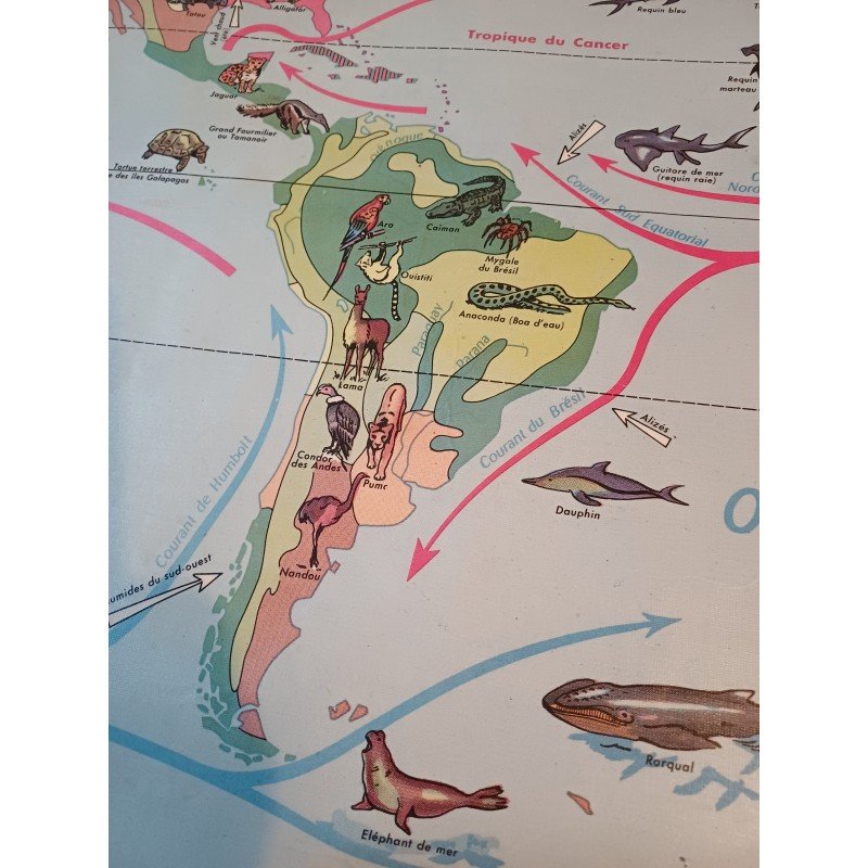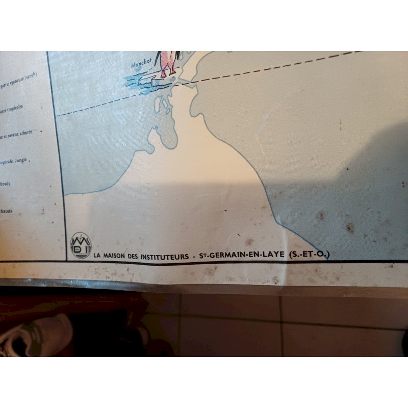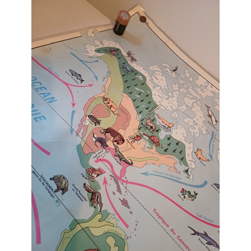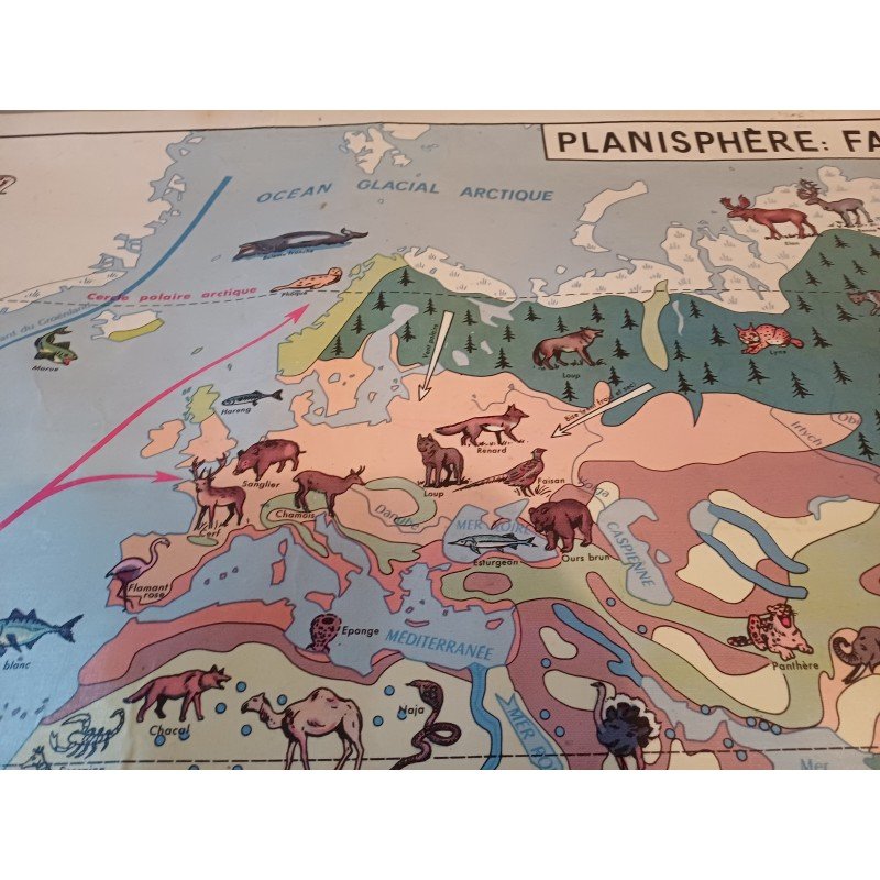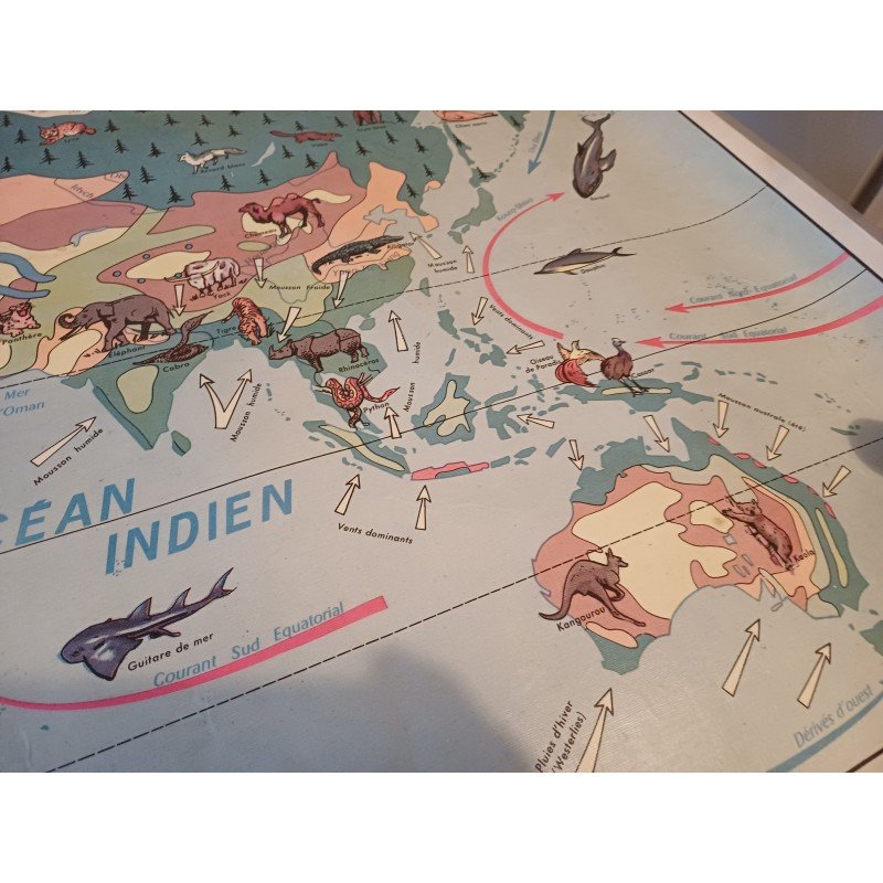 Carte Plastifié Planisphére de J.Anscombre ,recto verso : Faunes et Végétations et Physique , Dimensions : 126 cm sur 93 cm , poids : 500 g , très bon état