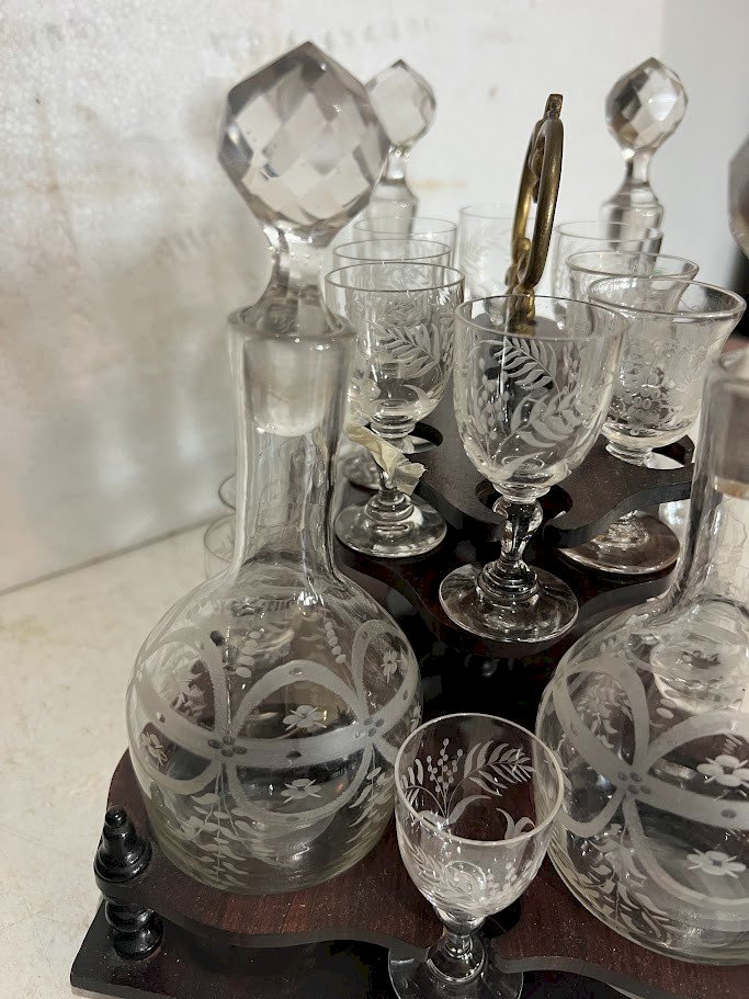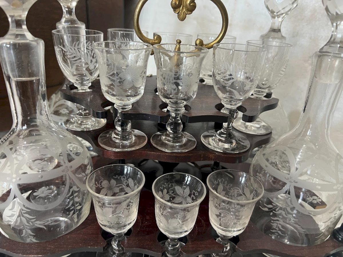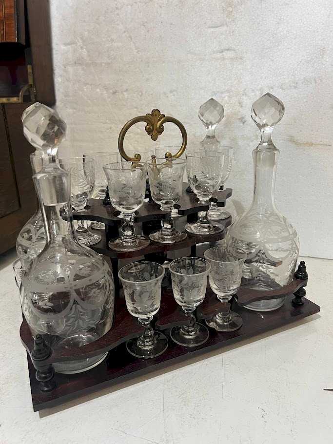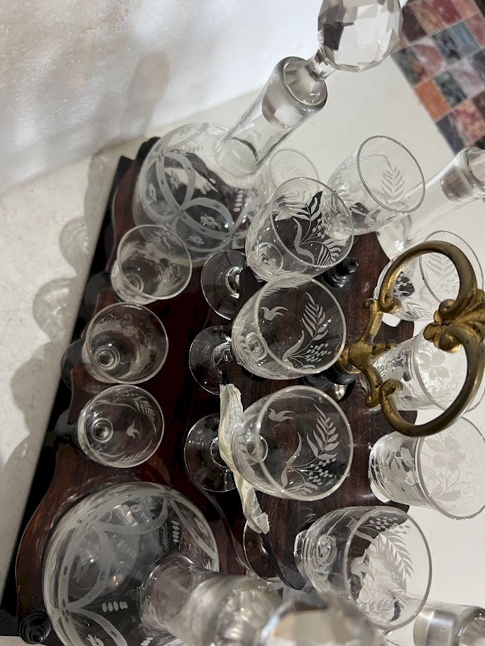 Très belle cave a liqueur Napoléon III. Boite en placage de bois de loupe de thuya et bois noir. Intérieur en acajou . Deux médaillons en marqueterie de bois de rose et laiton gravé Cabaret a poignée en bronze ciselé doré Quatre carafes et 9 verres d'origine. Nous avons complété avec 7 verres d'un model diffèrent voir la photo Ensemble très homogène Très bel état de conservation Ancienne restauration sur le fêle du couvercle voir photos Clé et serrure fonctionnelle. Epoque XIX siècle. Dimension H 27 x L 32 x 25 cm. Type:Objet de vitrine, Décoratif Origine:France Sous-type:Coffret Pays d'origine:France Hauteur:27 Style:Napoléon III Matière:Bois Longueur:32 Largeur:25