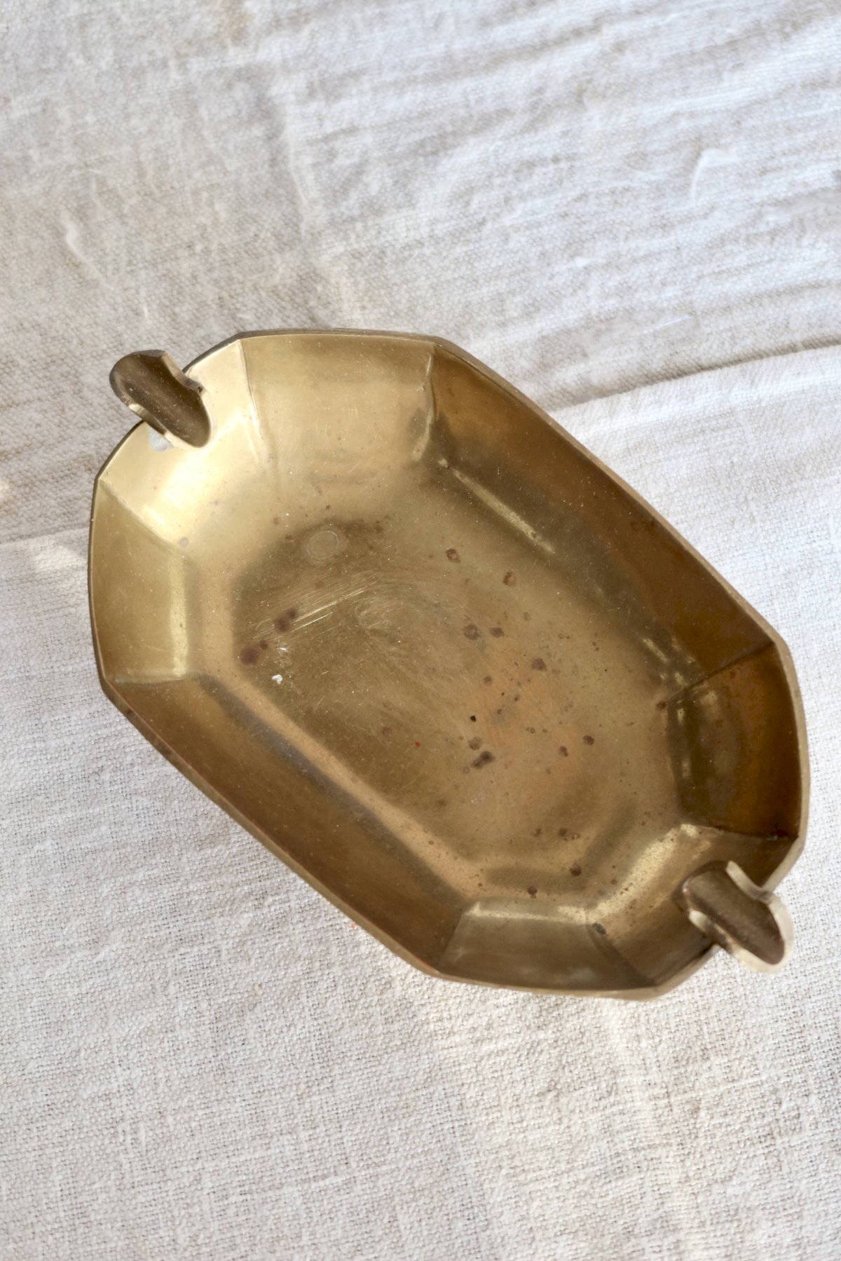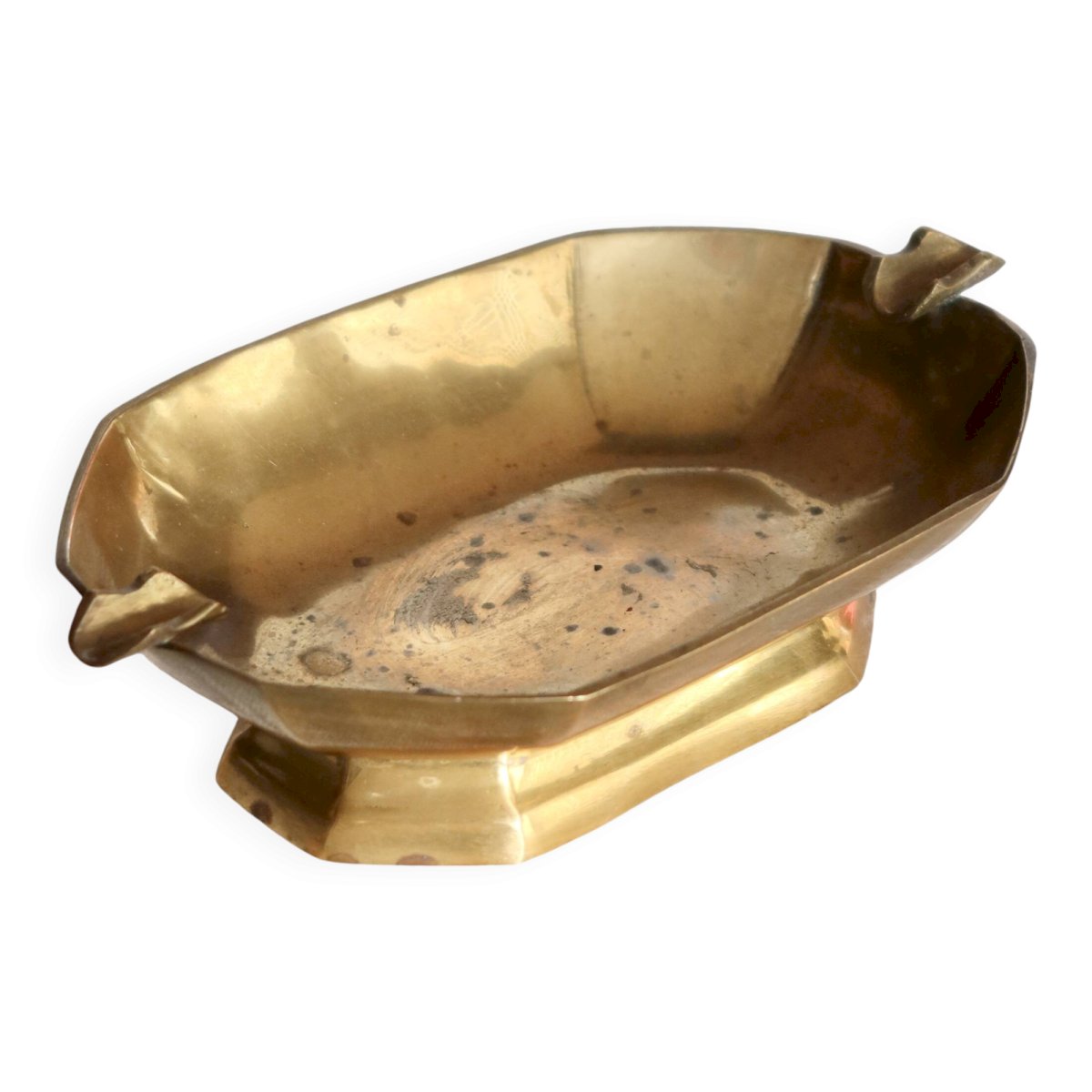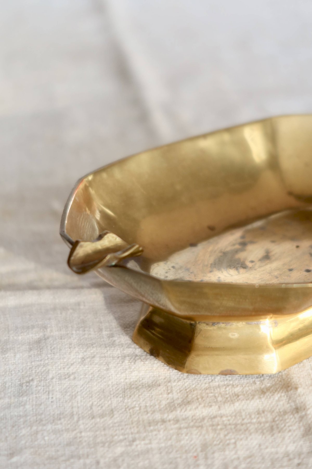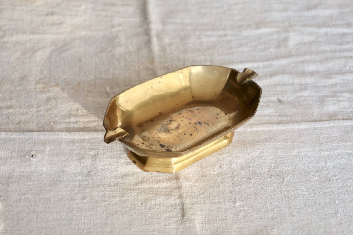 Cendrier ancien en laiton à la forme octogonale, reposant sur un piédouche discret et doté de deux encoches repose-cigarette.