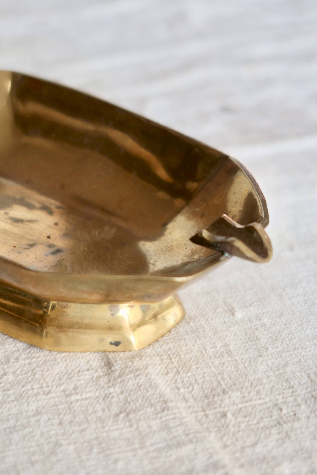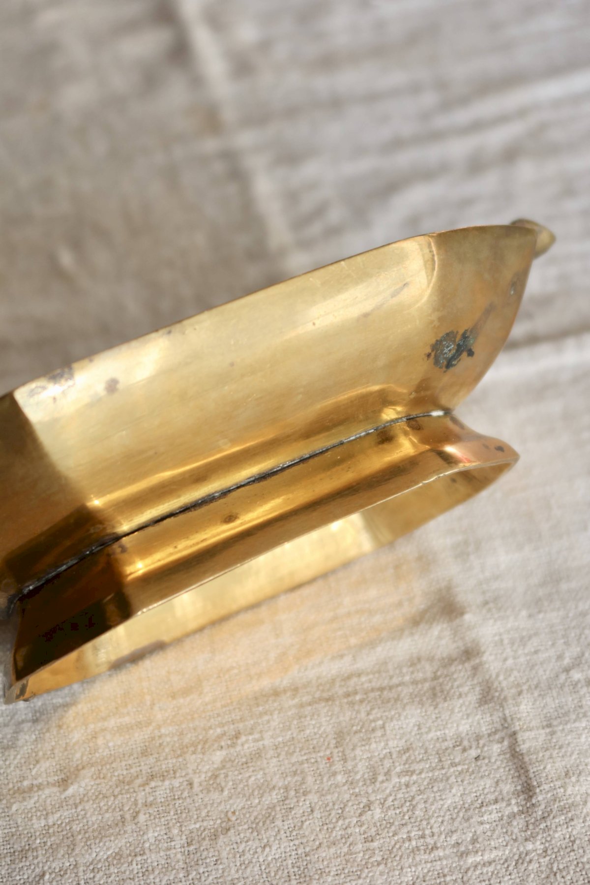 La surface présente une patine marquée et des traces d’oxydation, caractéristiques des objets en laiton anciens et de leur usage.Peut être utilisé comme cendrier ou détourné en vide-poche décoratif dans un intérieur au style vintage ou bistrot.Dimensions: 17cm X 2, 5cm X 10cm.