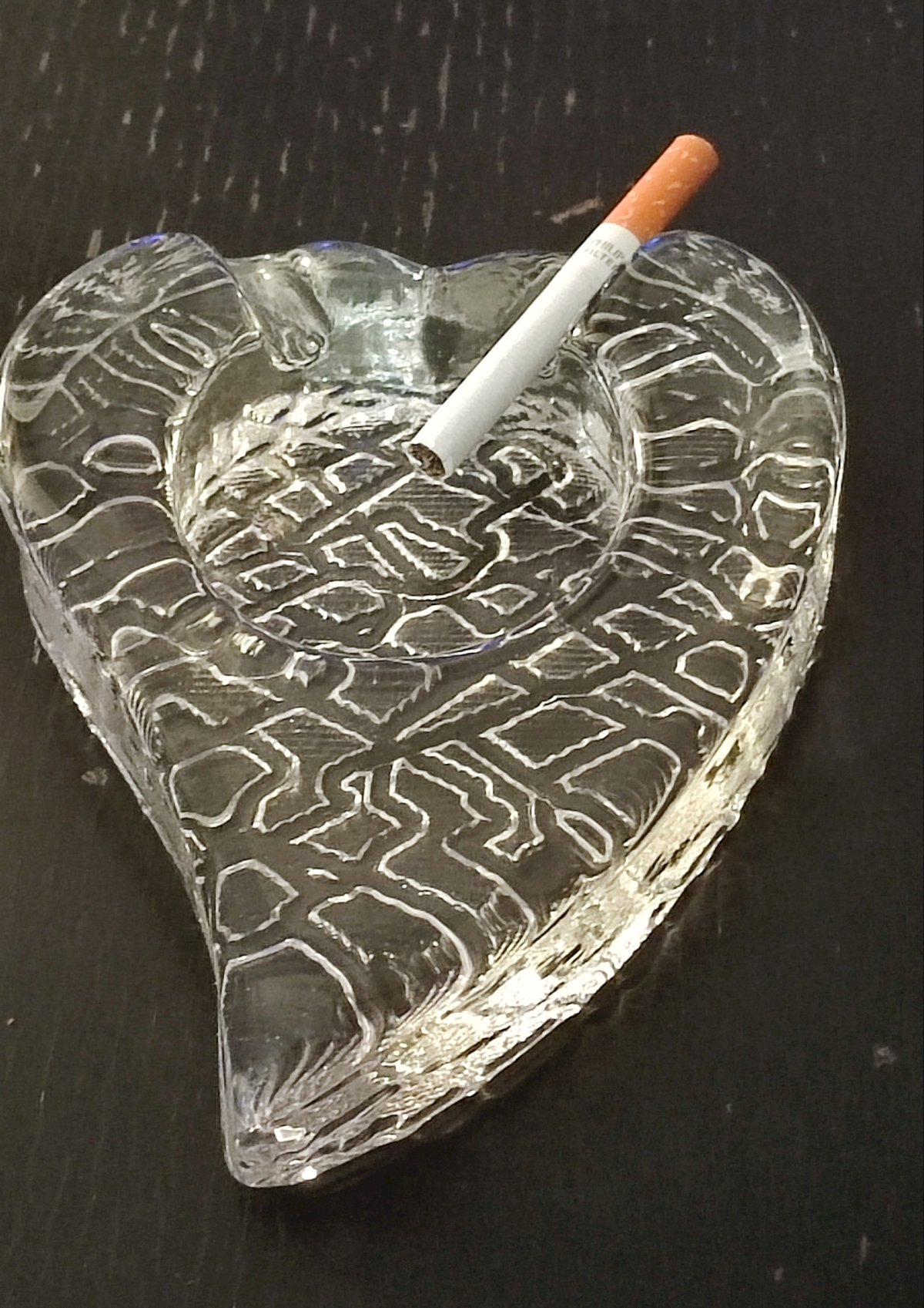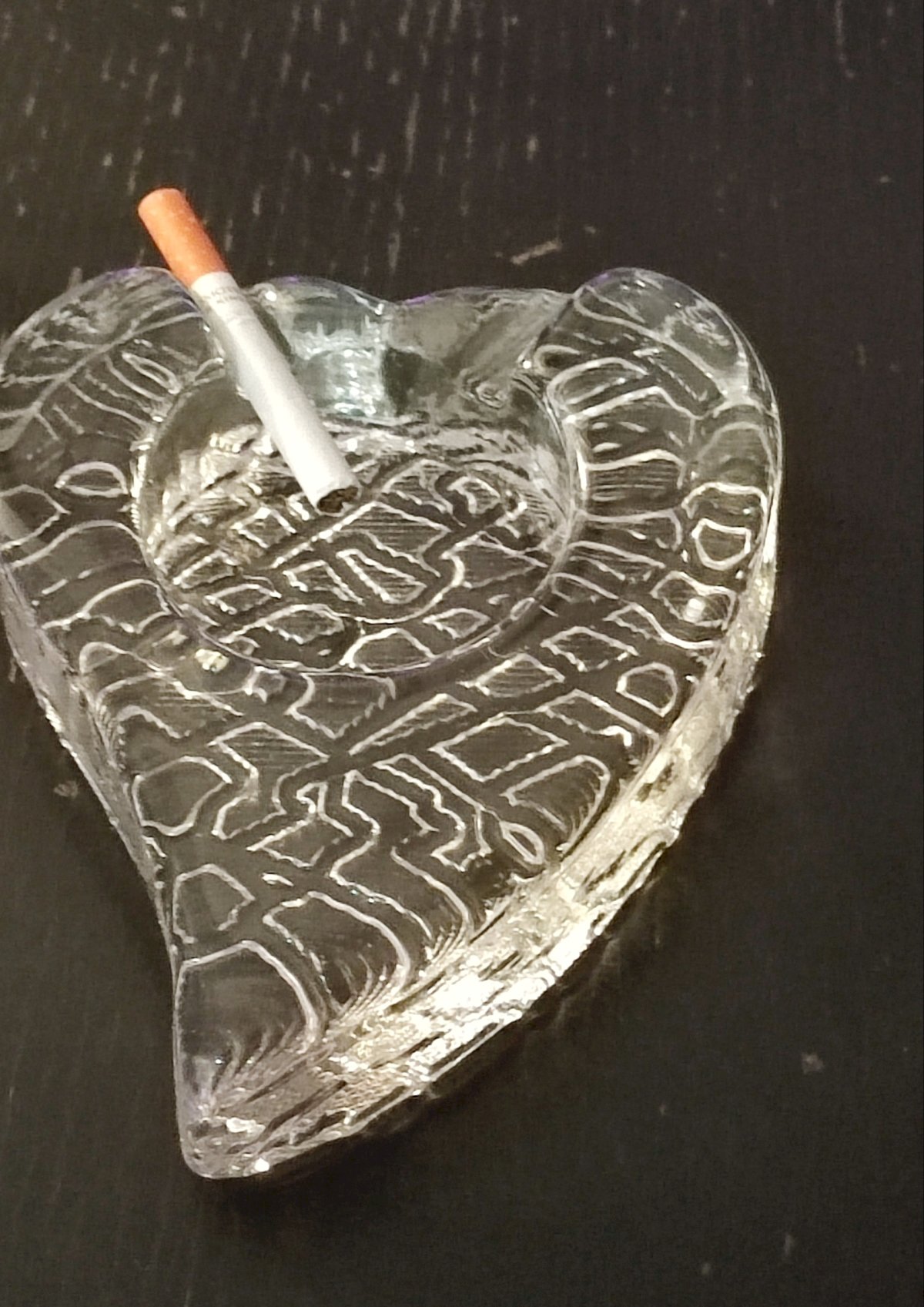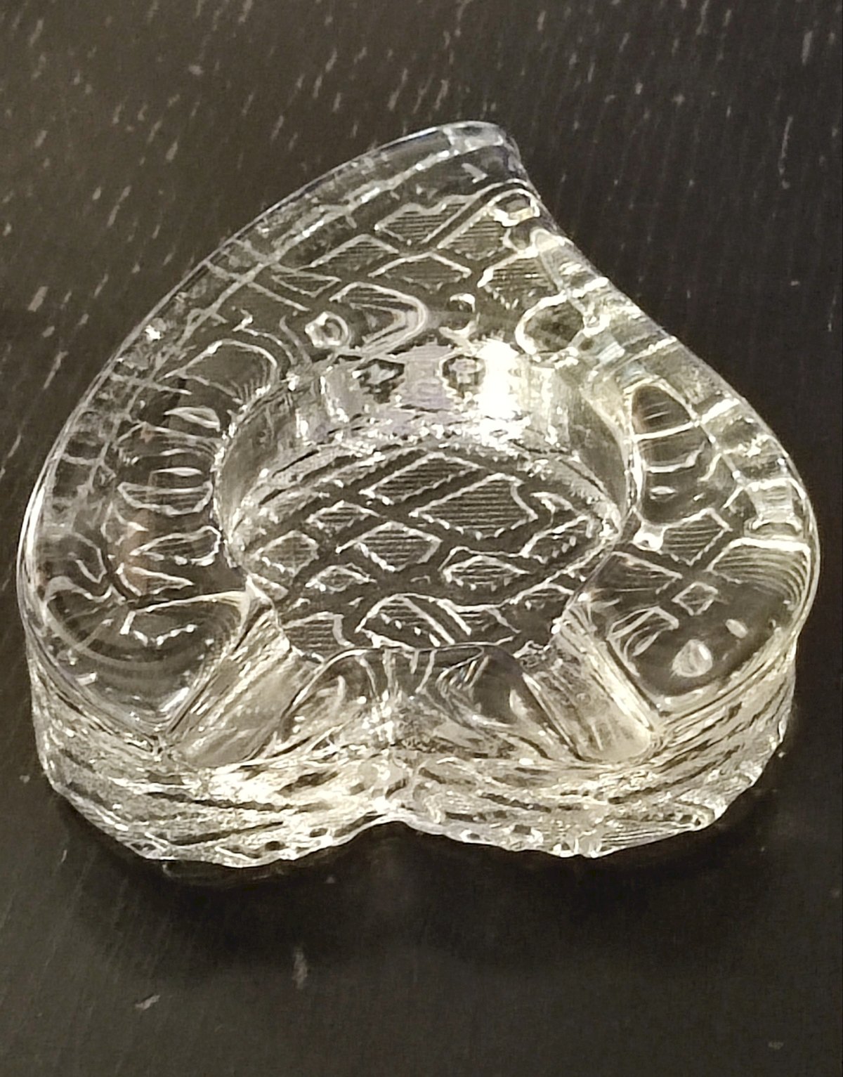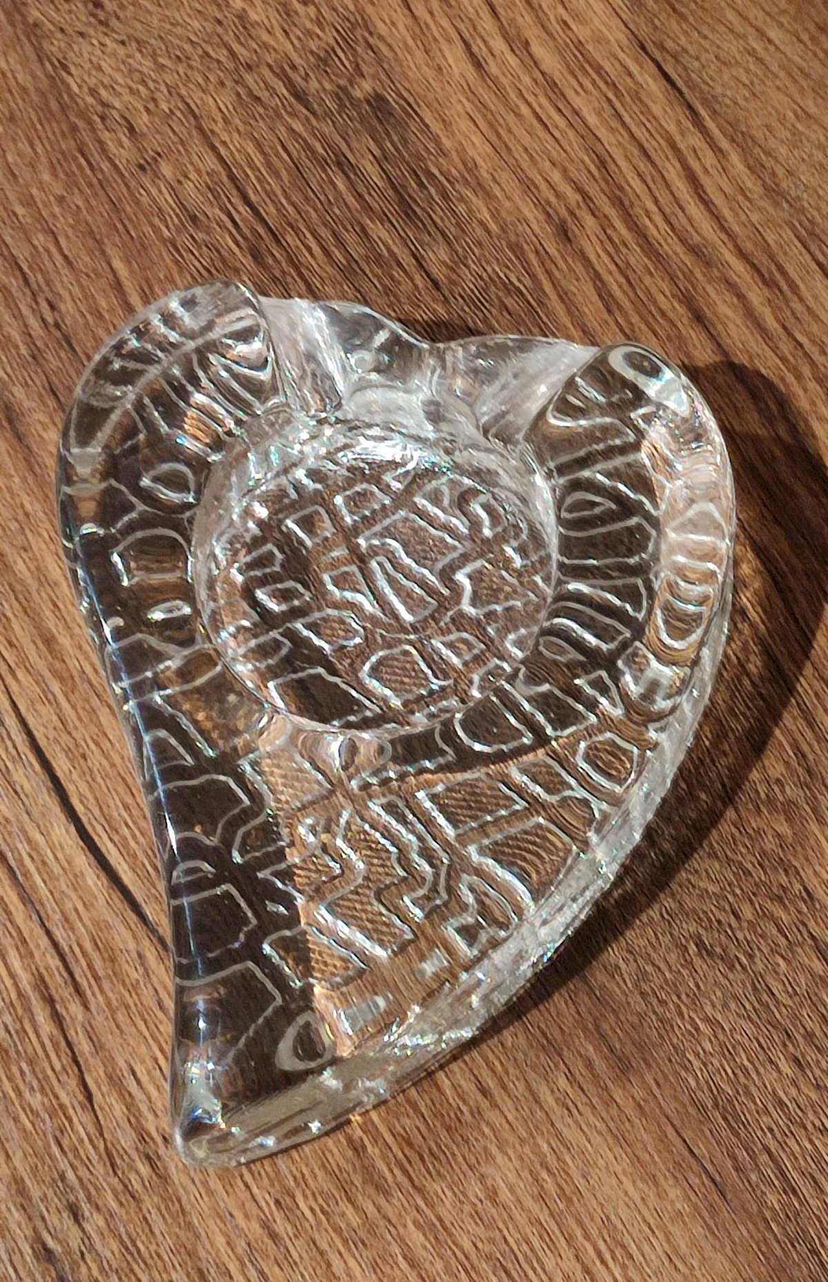 Cendrier en verre pressé épais, de forme cœur, avec un joli décor géométrique en relief.