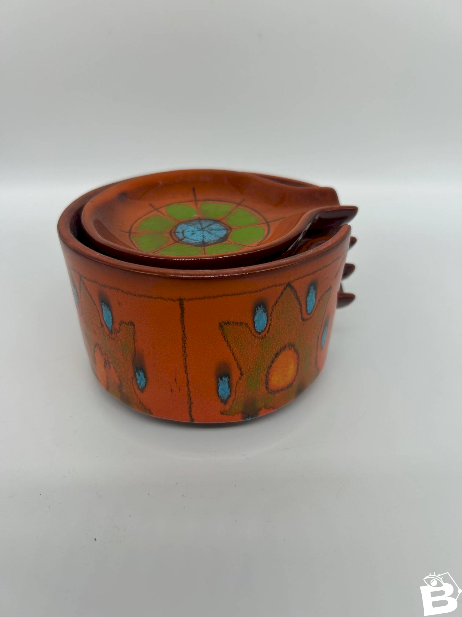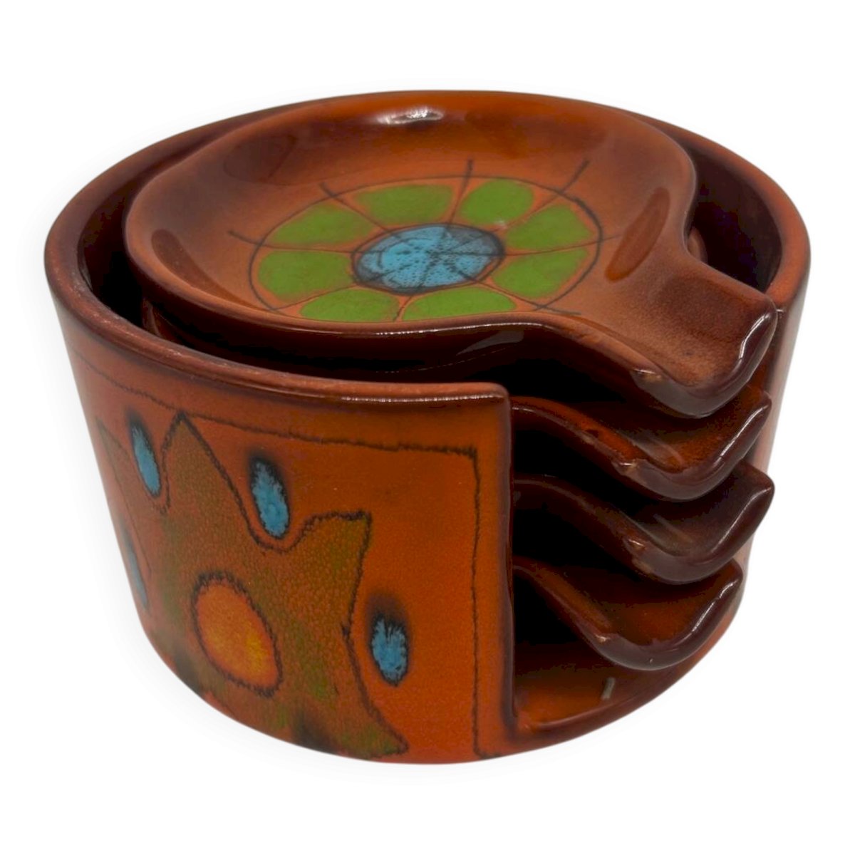 Cendriers individuels en céramique orange avec leur support, années 70.