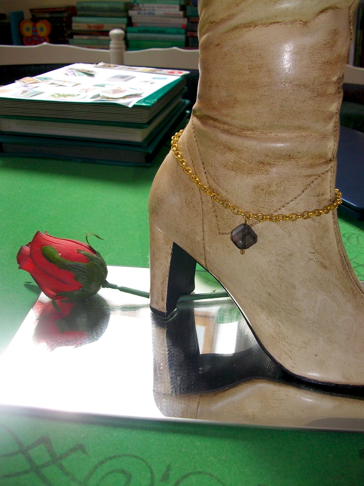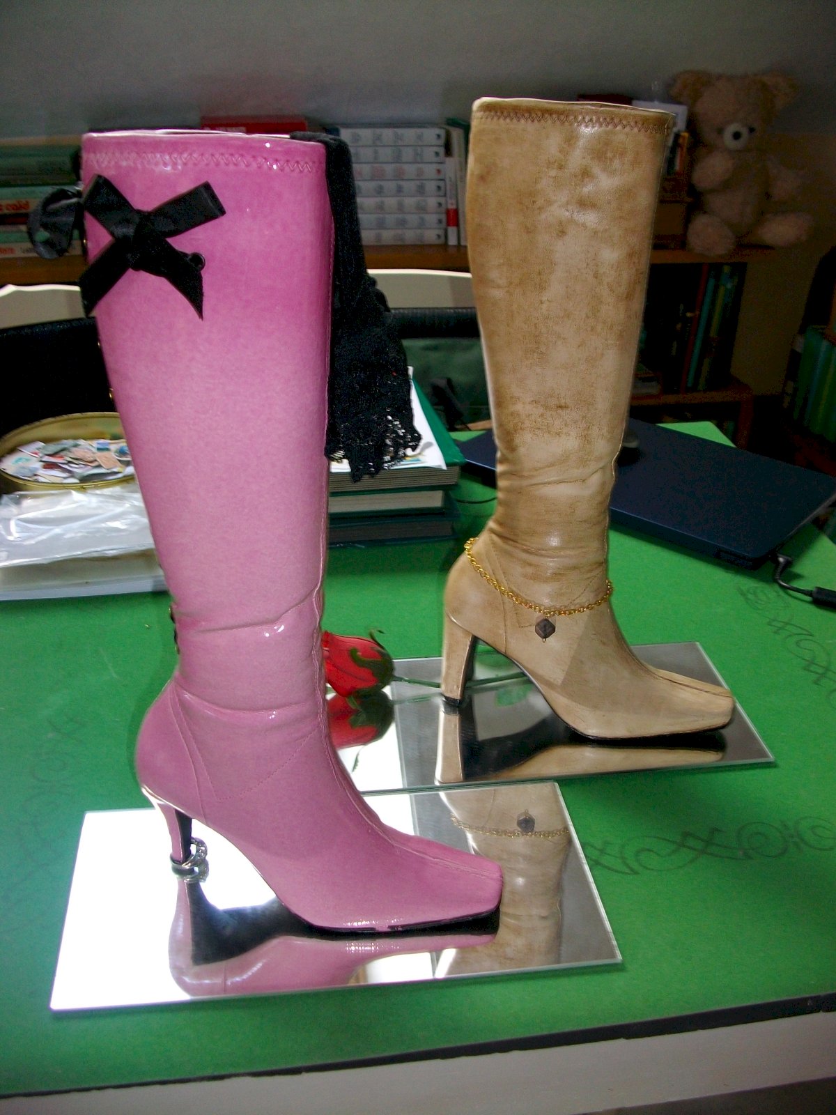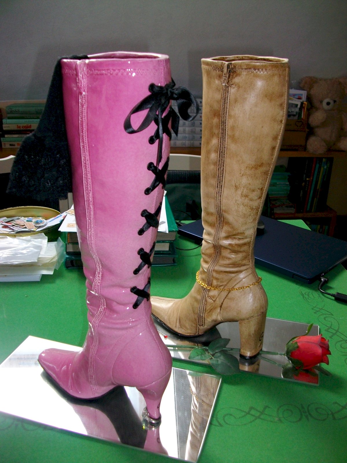 La seconde est en céramique coulée, cirée façon cuir avec une chainette de cheville dorée et une rose (en tissu) prise sous le talon, fixée sur un miroir également.