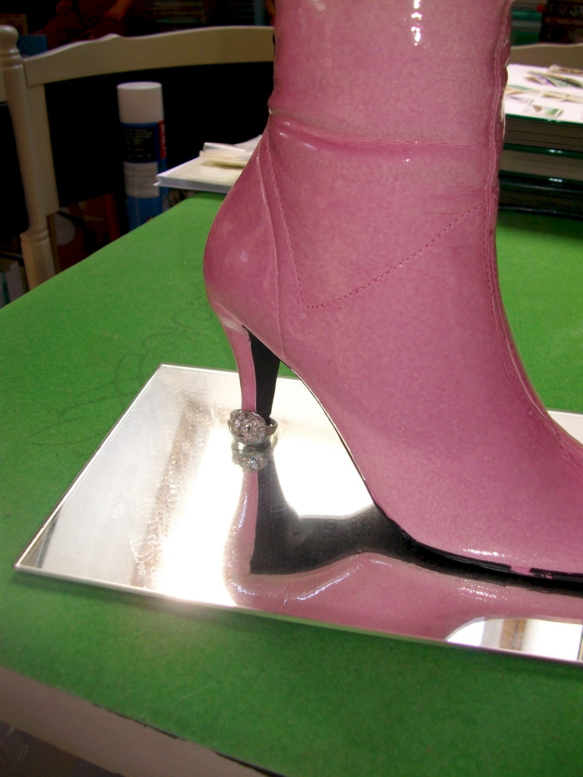 L'une est émaillée de couleur rose avec un laçage en satin sur l'arrière et une bague en "brillants fantaisie" autour du talon, et fixée sur un miroir.