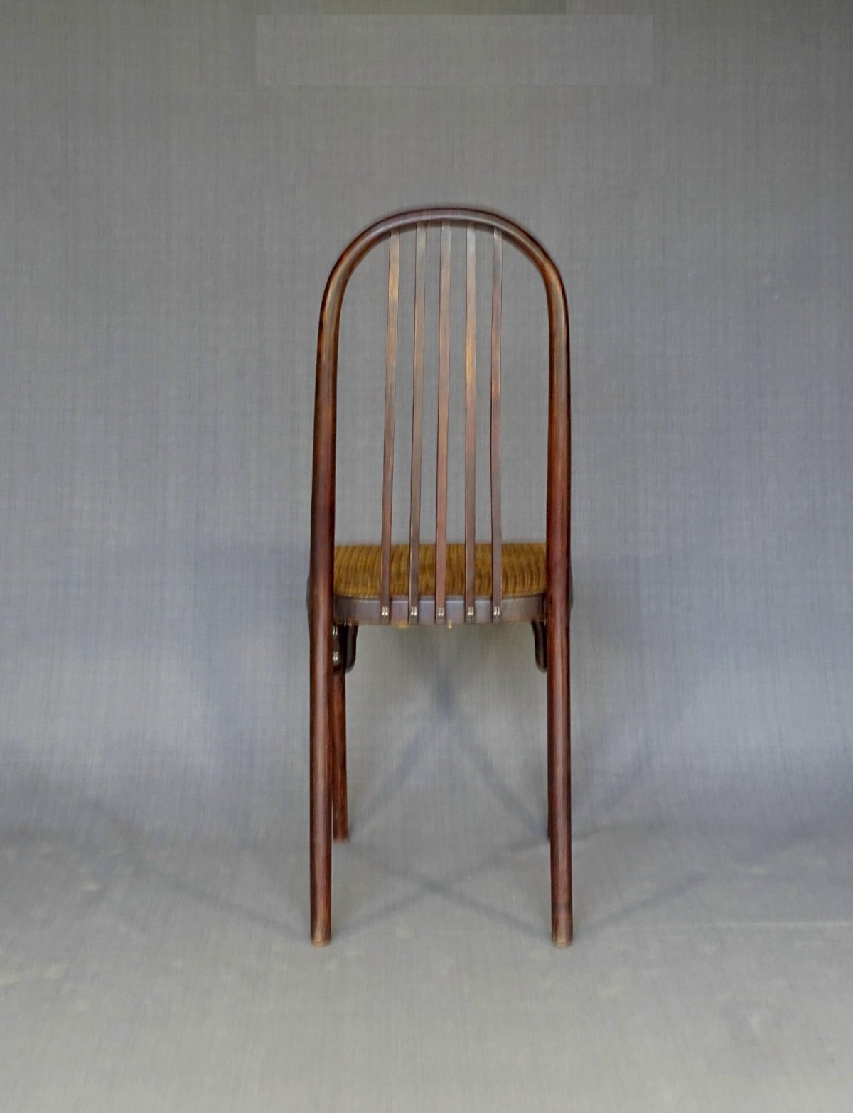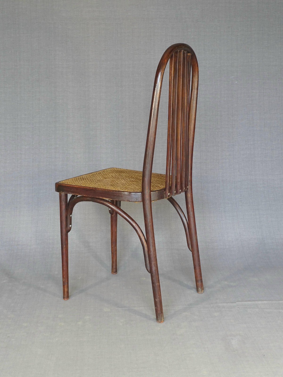 Chaise N°644 de Wojciechow, Pologne, vers 1925. C’est la reproduction de la chaise Kohn N°369 qui est admise comme une œuvre d’Hoffmann en 1910. Cet archétype à servi à une dizaine de fabricants européens pour décliner leur production Sécessionniste, voir photo de 8 modèles en Pj. On la trouve à 5, 4 et aussi à 3 barreaux verticaux, suivant d’ailleurs le luxe que l’on veut donner à l’objet. Cannage que je suppose d’origine à 4 brins très larges (3 mm) Teinte acajou américain sous gomme laque. Hauteur d’assise : 46 cm, Hauteur totale : 94 cm, assise : 39X41 cm Plus de photos et renseignements sur demande. Expédition professionnelle France et Europe, ou retrait en Alsace. Couleur:palissandre Nombre de pièces:1 Type:Chaise Marque:Wojciechow Période:Design du XXème Sous-type:Bistrot Pays d'origine:Pologne Matière:Hêtre Style:Bentwood