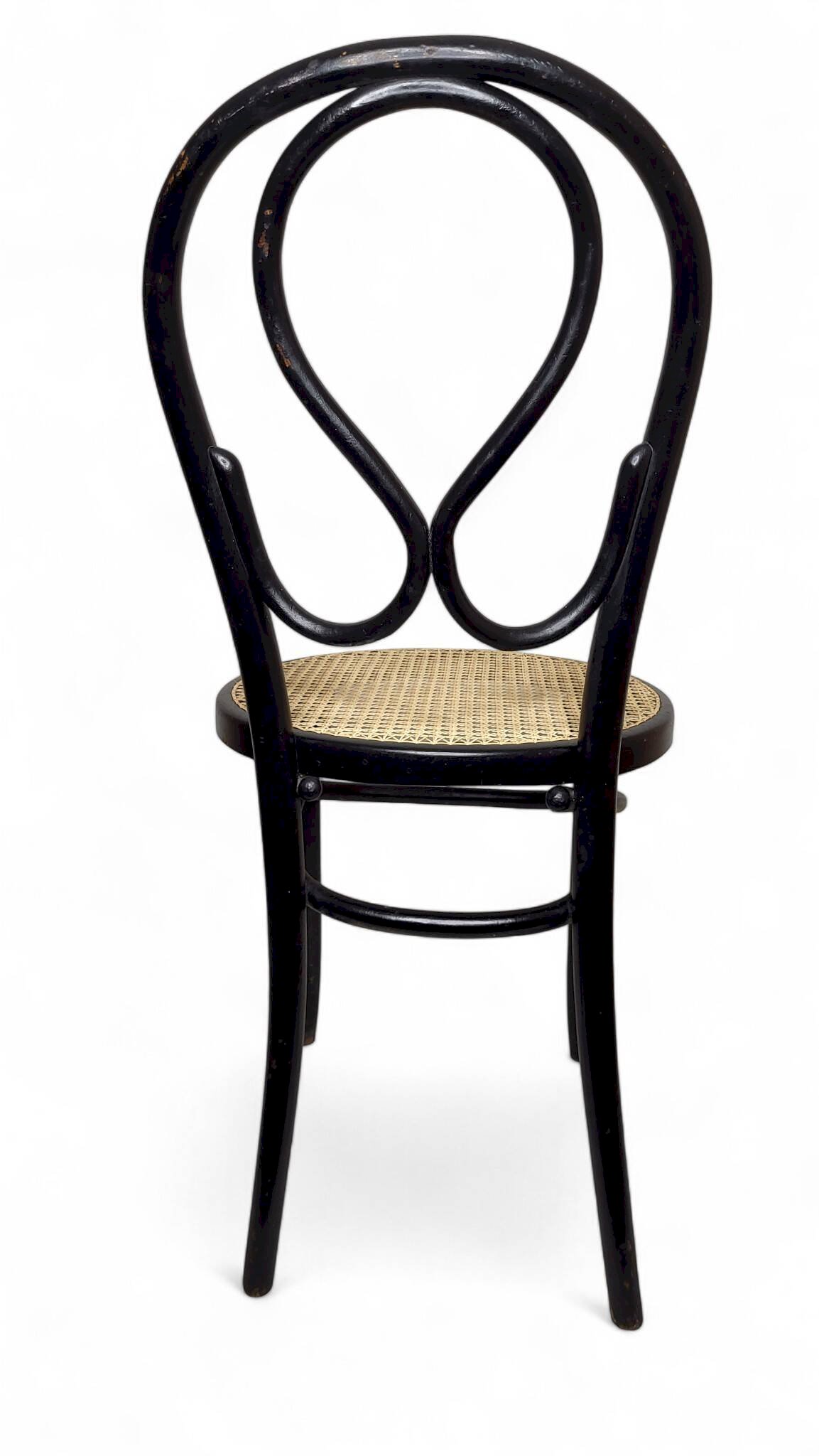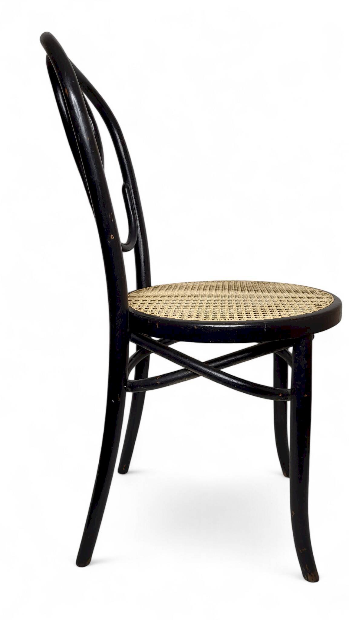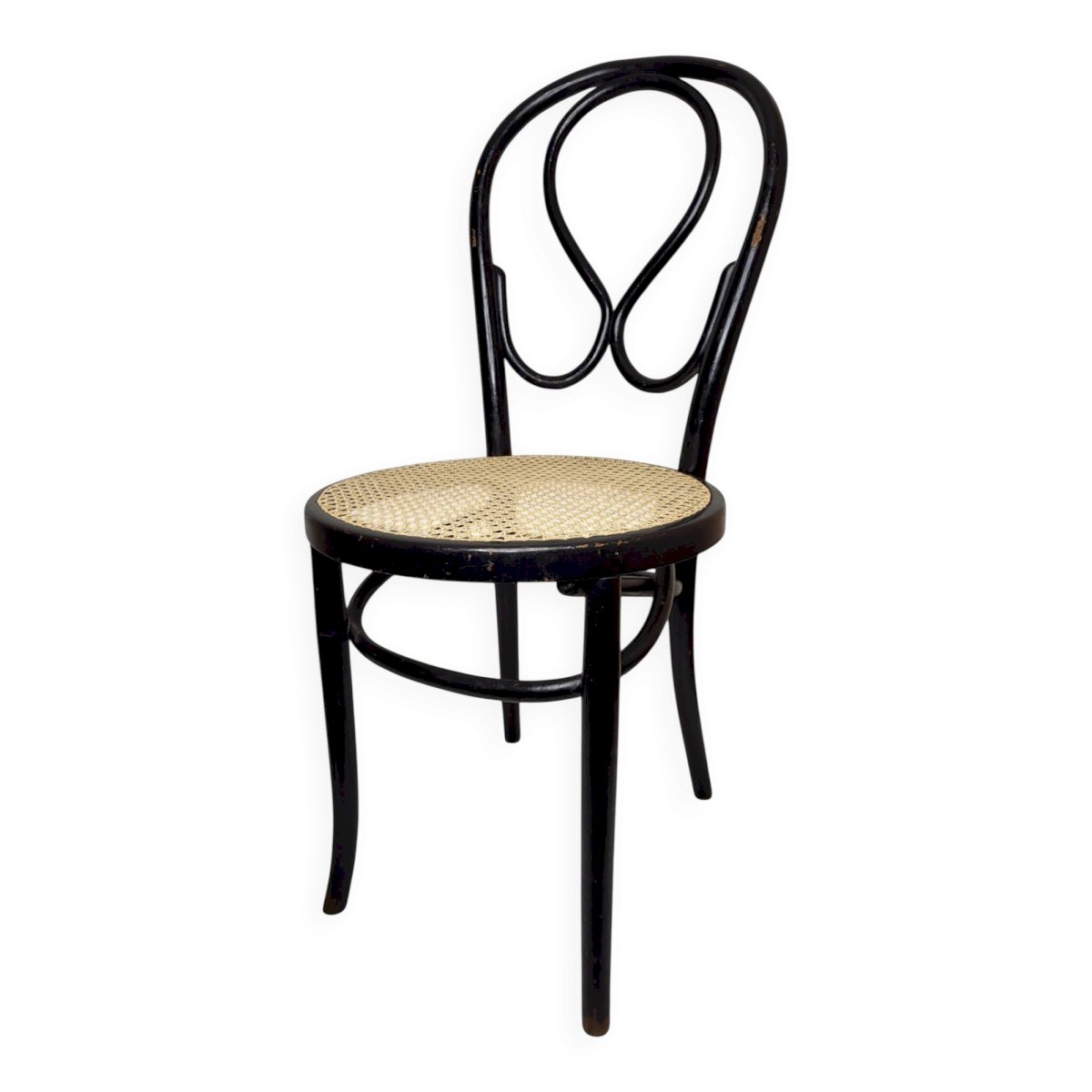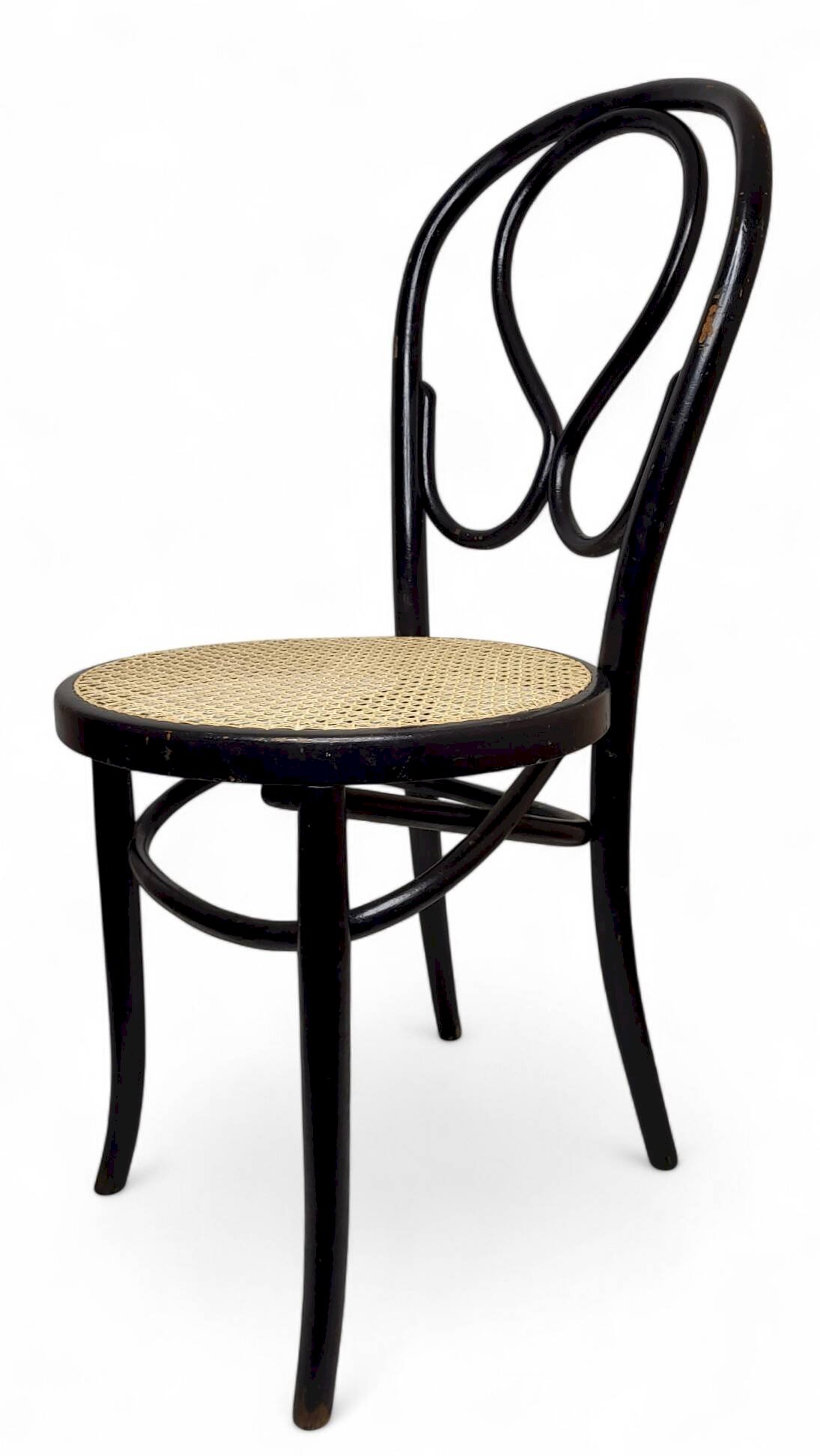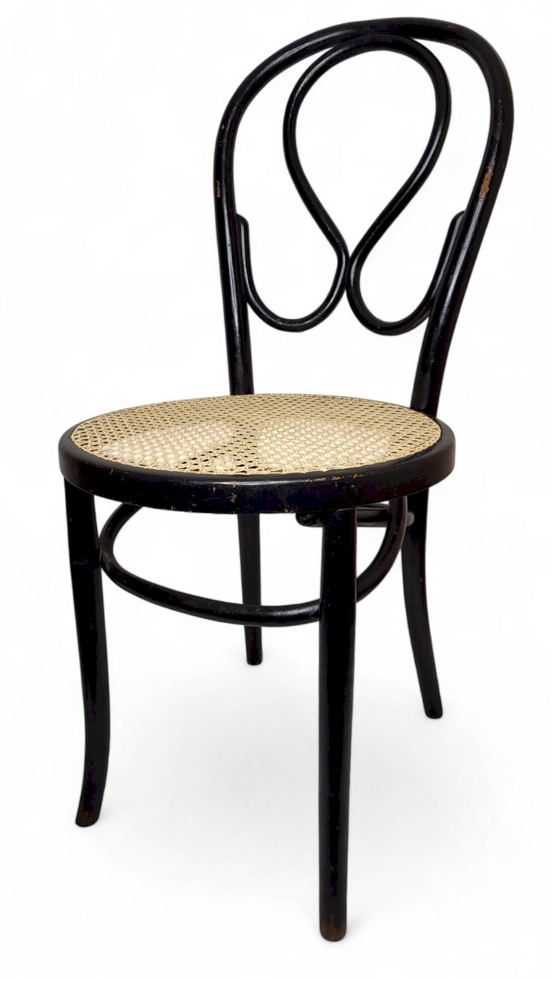Chaise oméga art nouveau en bois courbé, noirci / dans le goût de thonet, kohn cannage manuel neuf hauteur 91 cm hauteur assise 47 cm diamètre 41 cm.Traces d'usage et d'ancienneté.Patine du bois noirci.Emballage soigné et livraison rapide.
