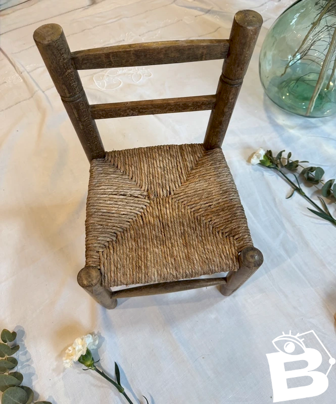 Chaise enfant vintage en bois foncé et assise en paille tressée