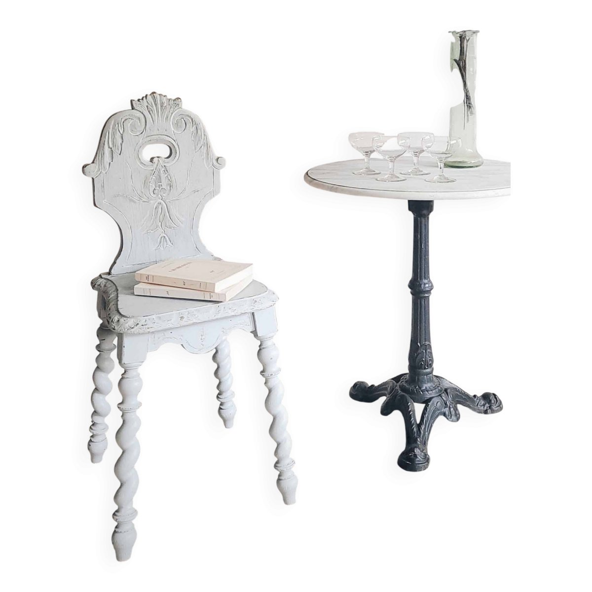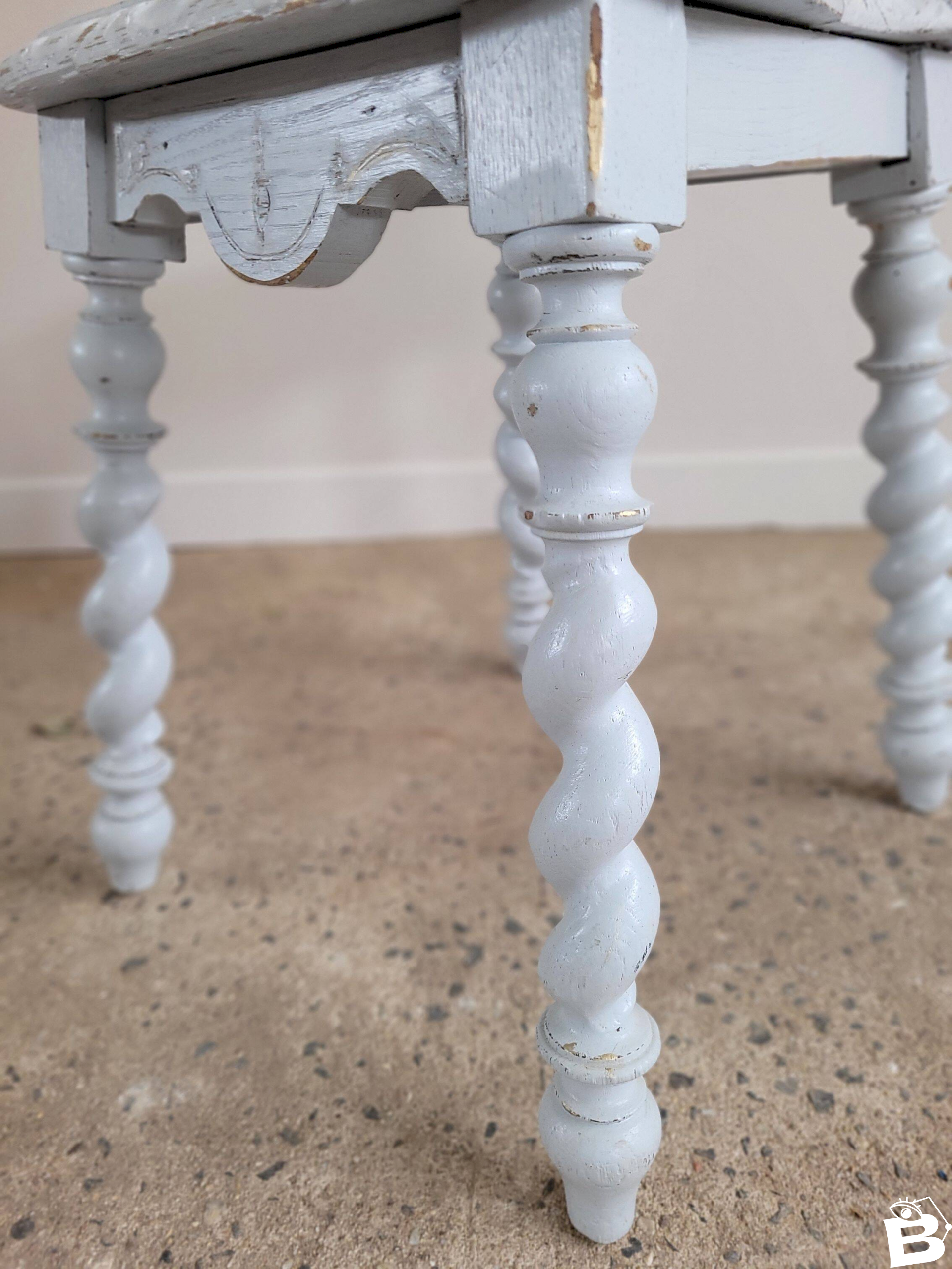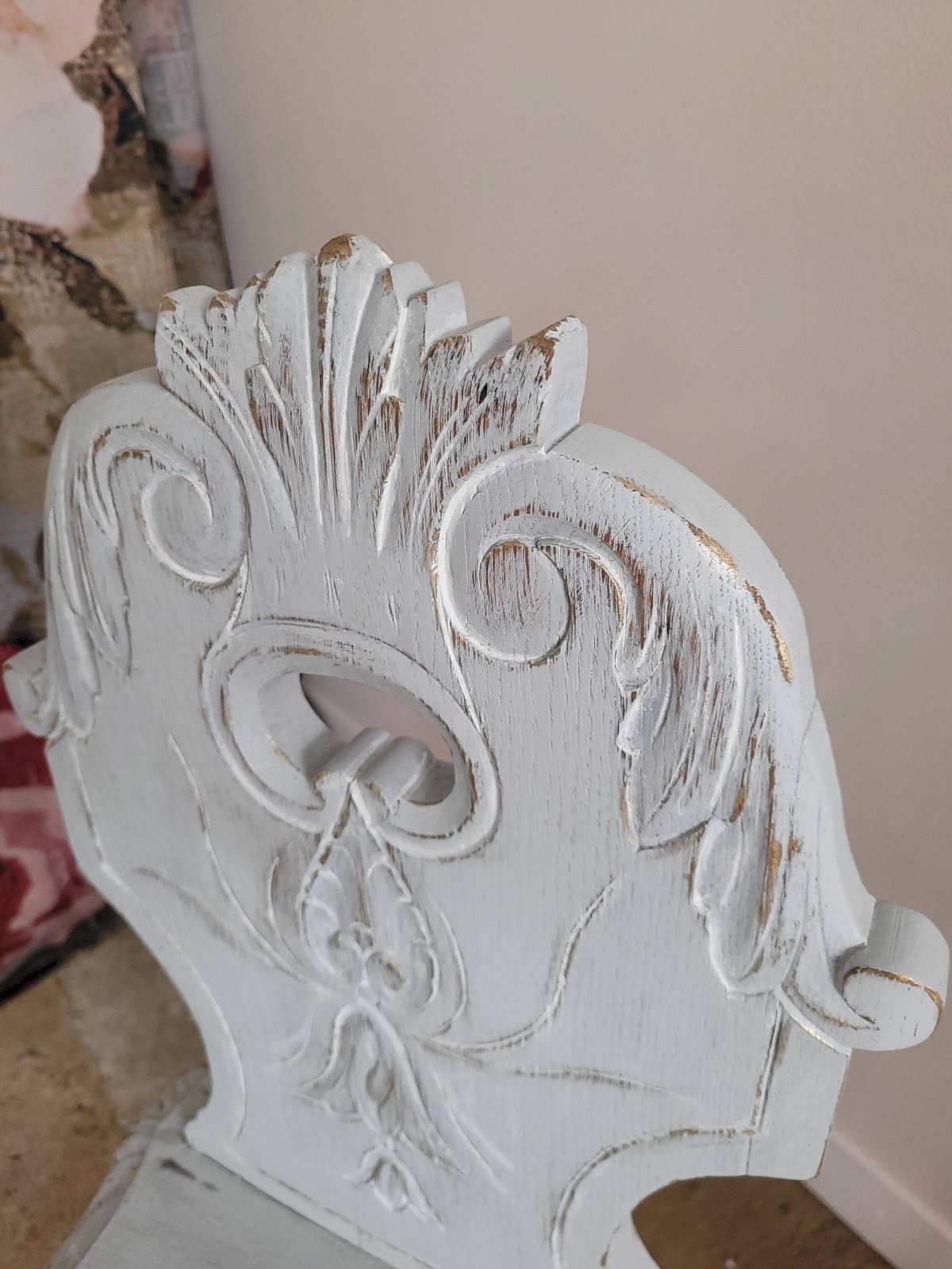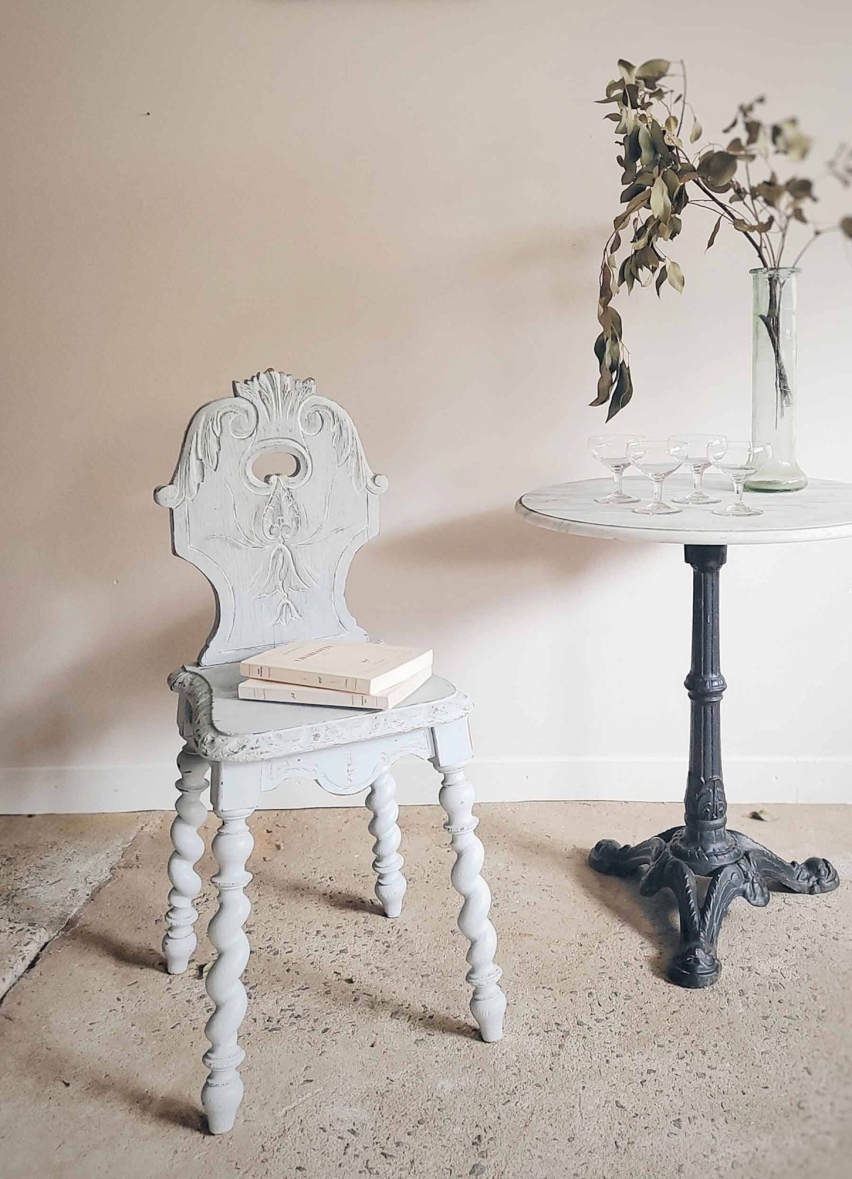 On aime ses pieds en bois tourné, sa patine d’un blanc un peu passé et les reliefs légèrement dorés.