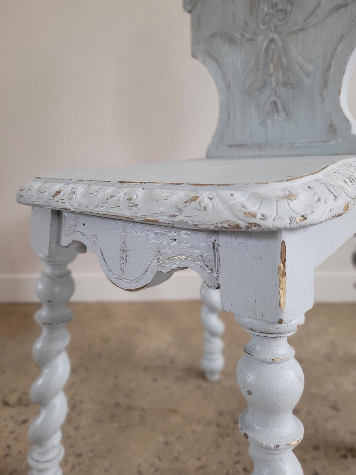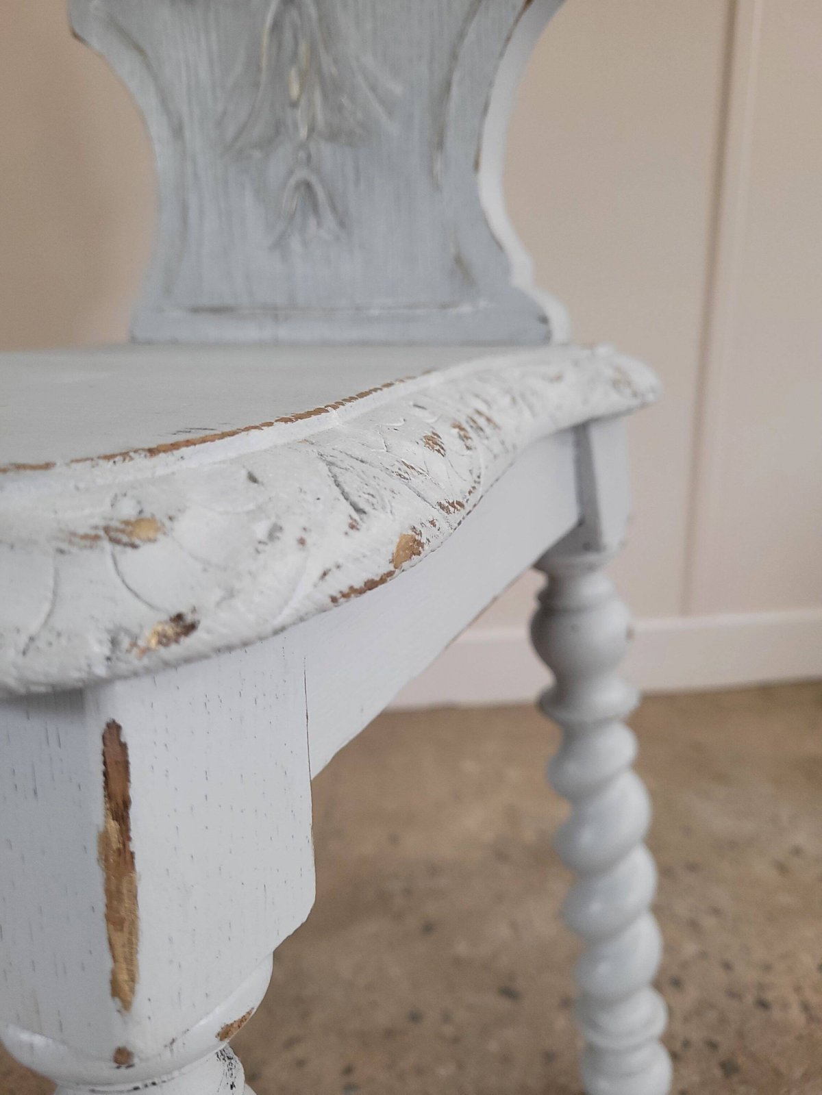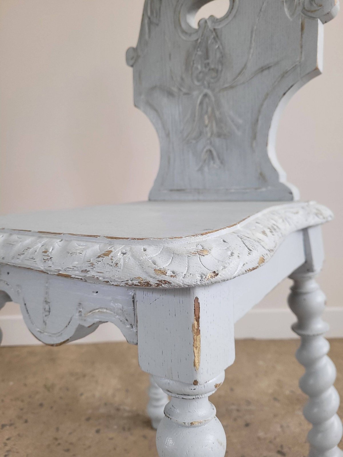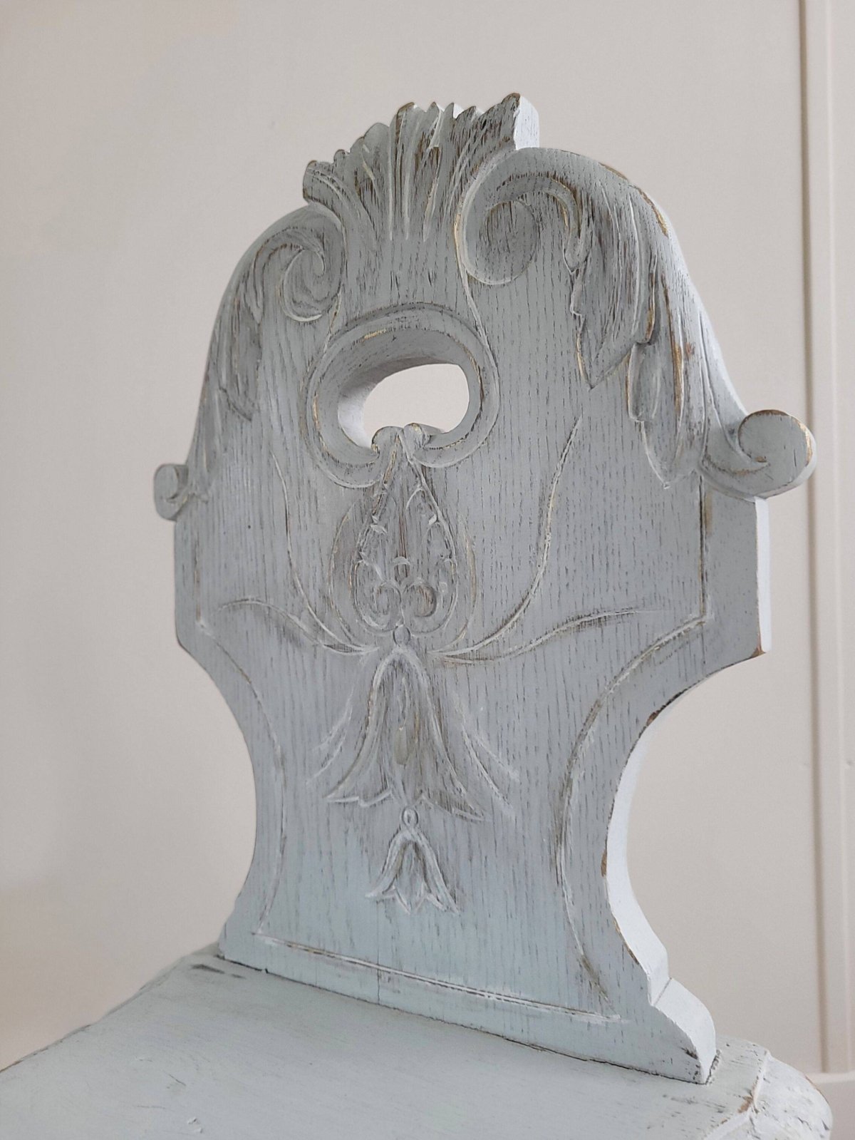 On aime ses pieds en bois tourné, sa patine d’un blanc un peu passé et les reliefs légèrement dorés.