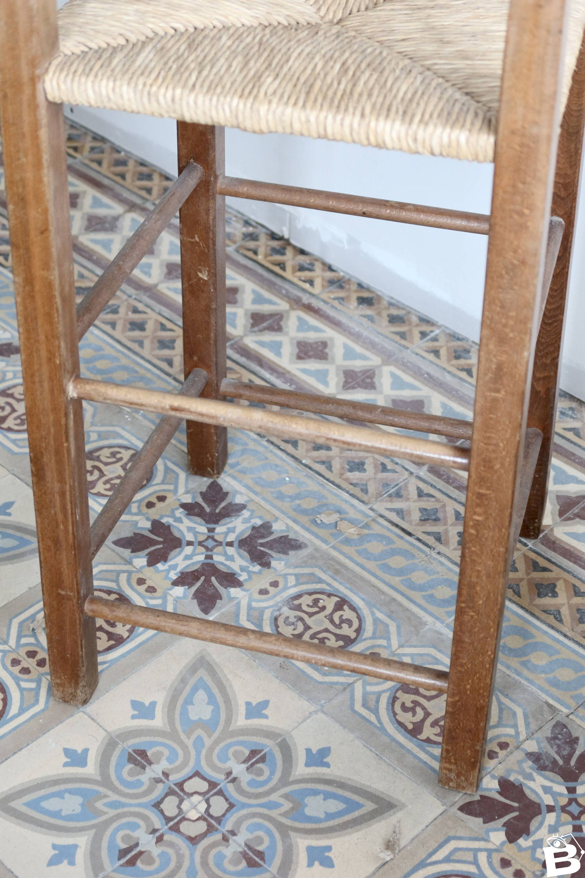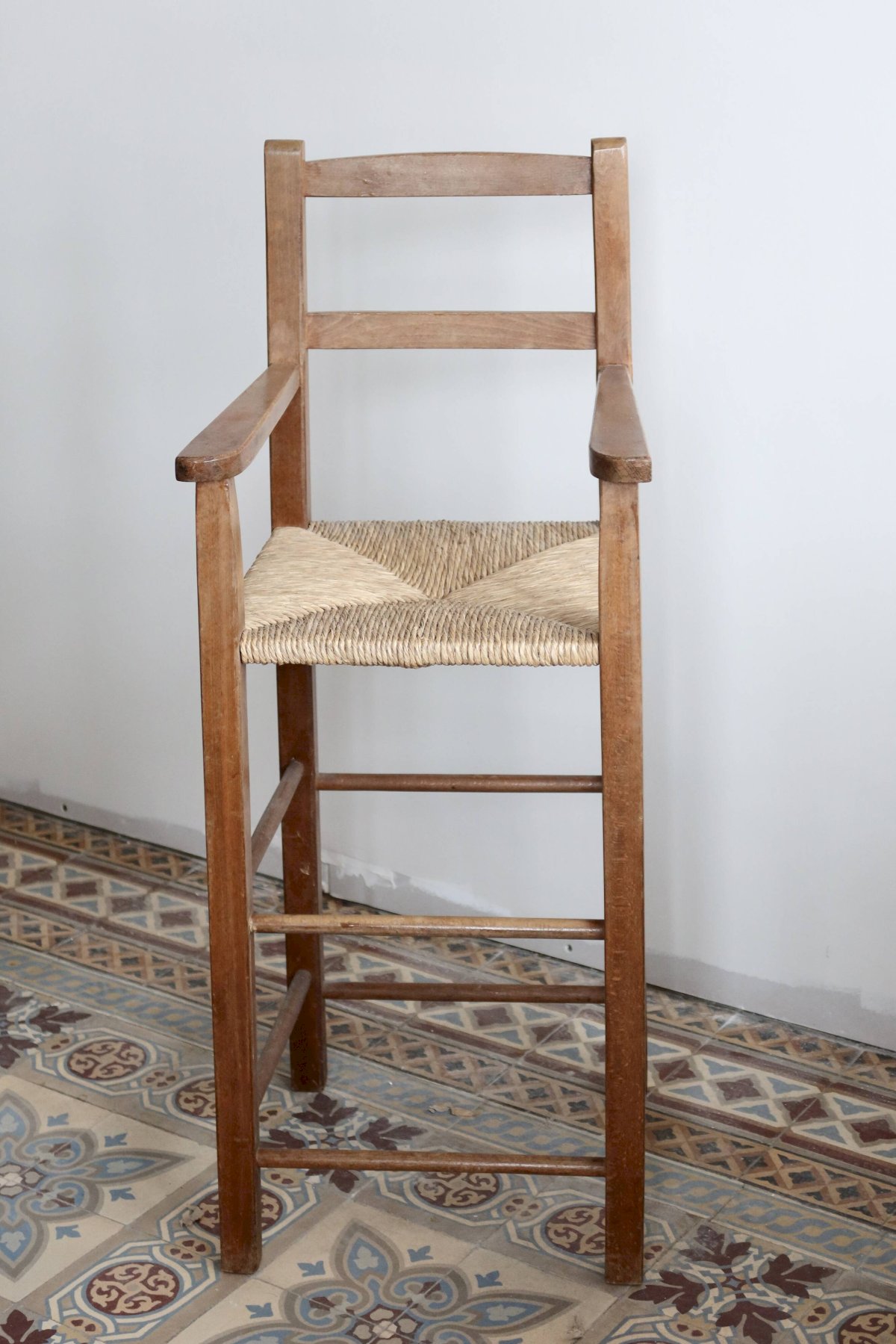 Chaise haute enfant ancienne en bois massif avec accoudoirs et assise paillée tressée, aux lignes sobres et authentiques.