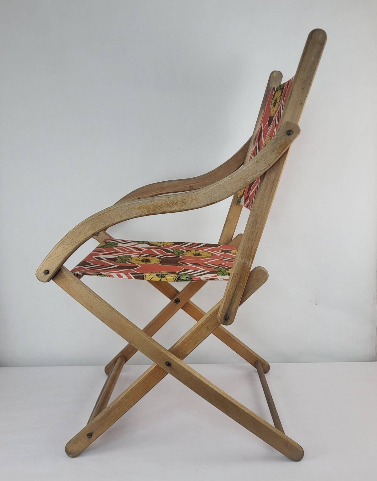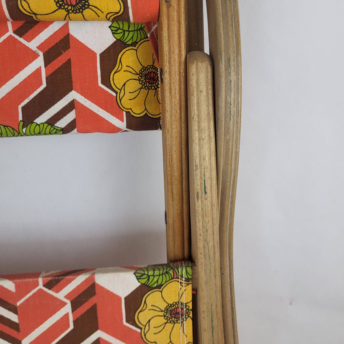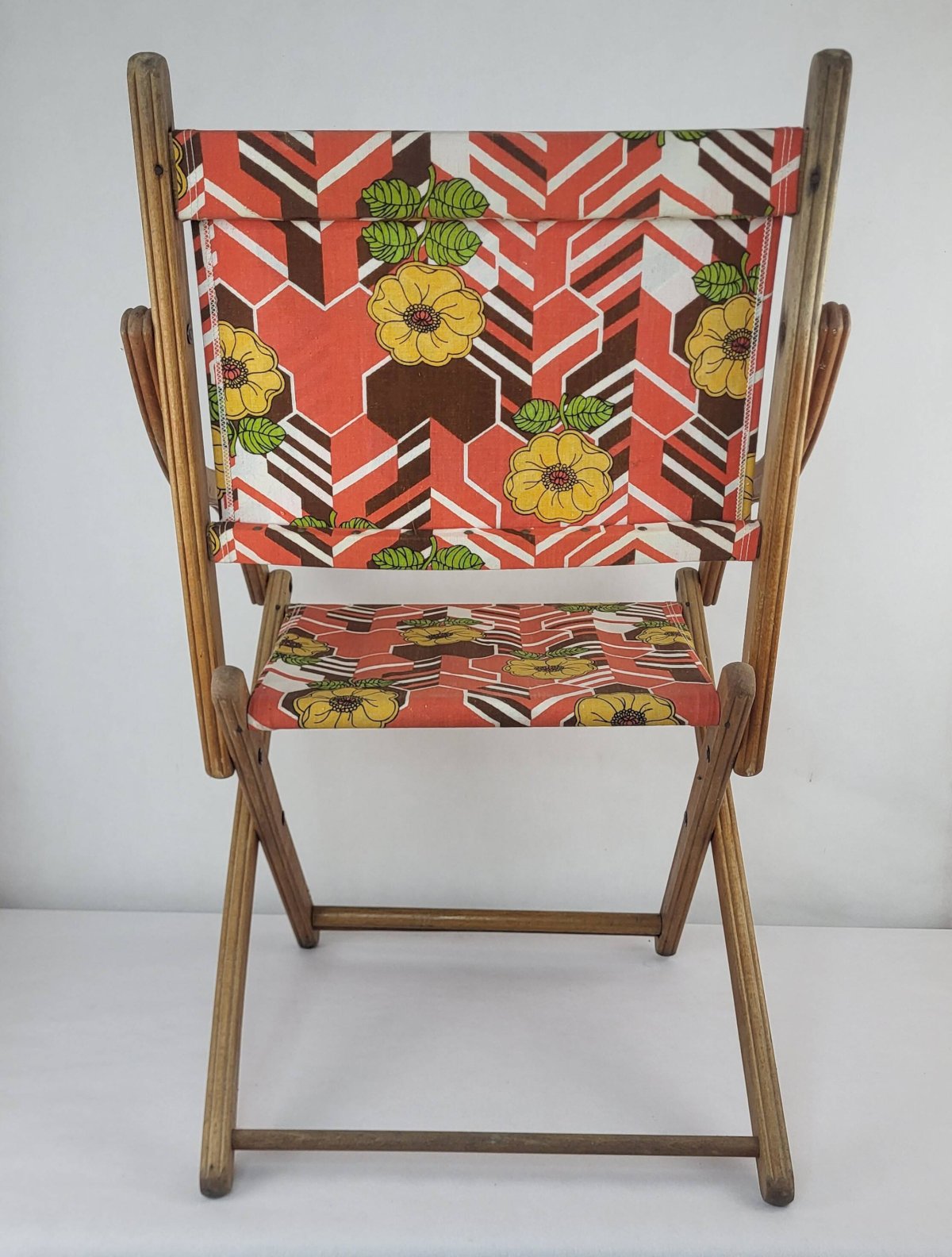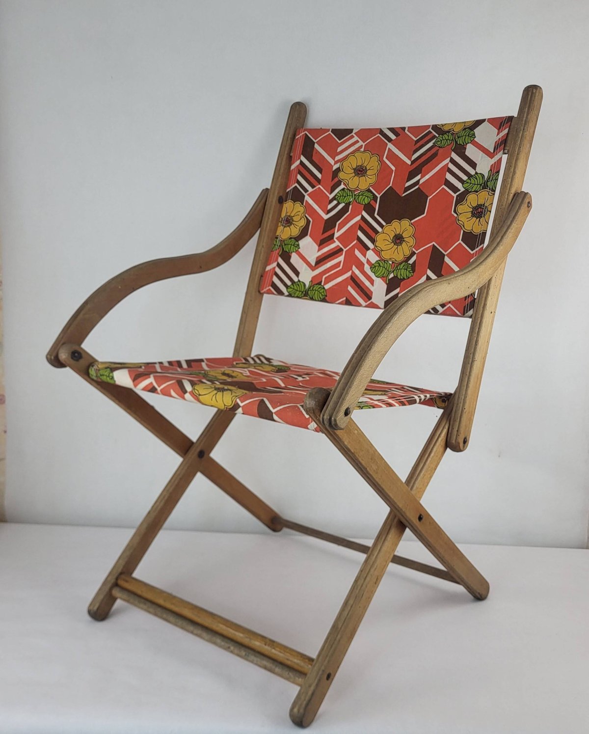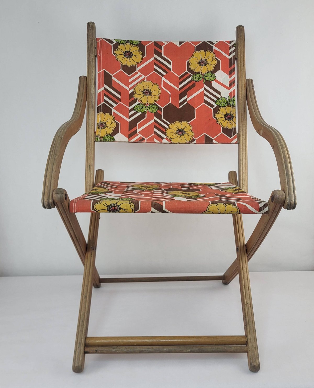 Chaise pliante vintage 1960's / structure en bois / assises et dossiers en tissu imprimé fleuri.Hauteur 85 cm.Hauteur assise 41 cm.Largeur 53 cm.Profondeur assise 37 cm.Elles sont en bon état avec traces minimes d'usage et d 'ancienneté.Emballage soigné et livraison rapide.