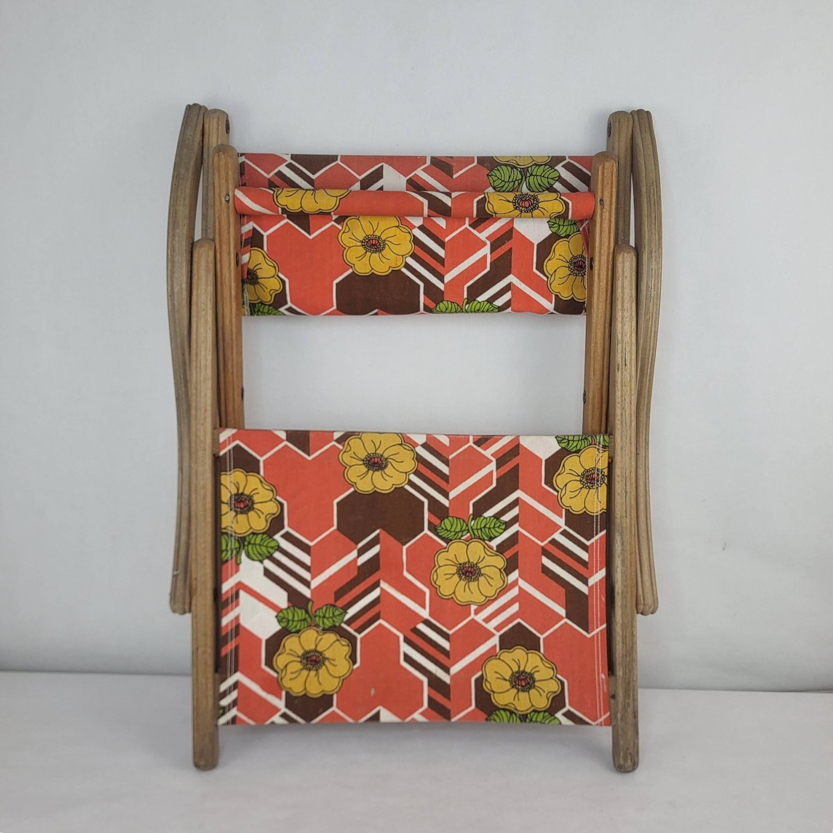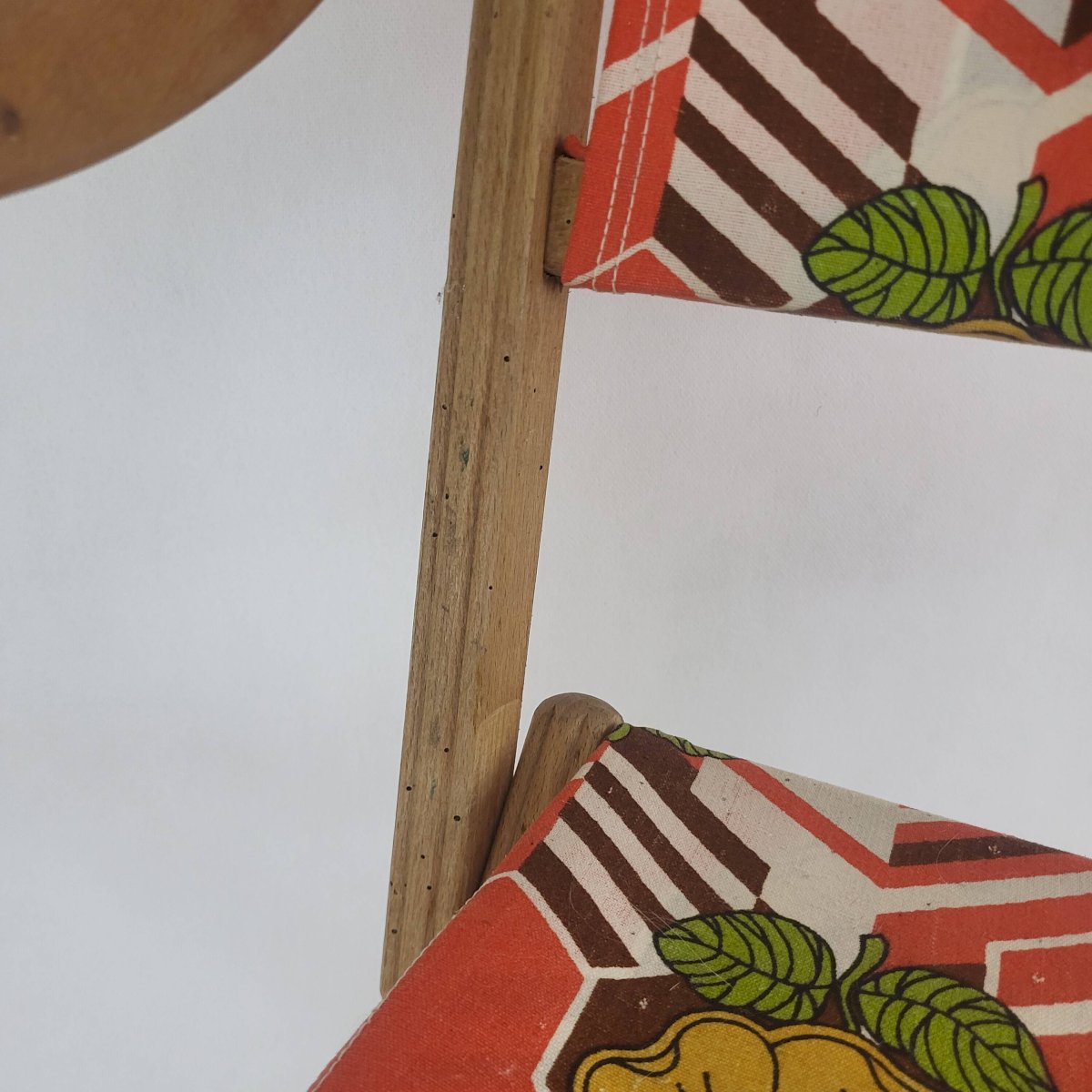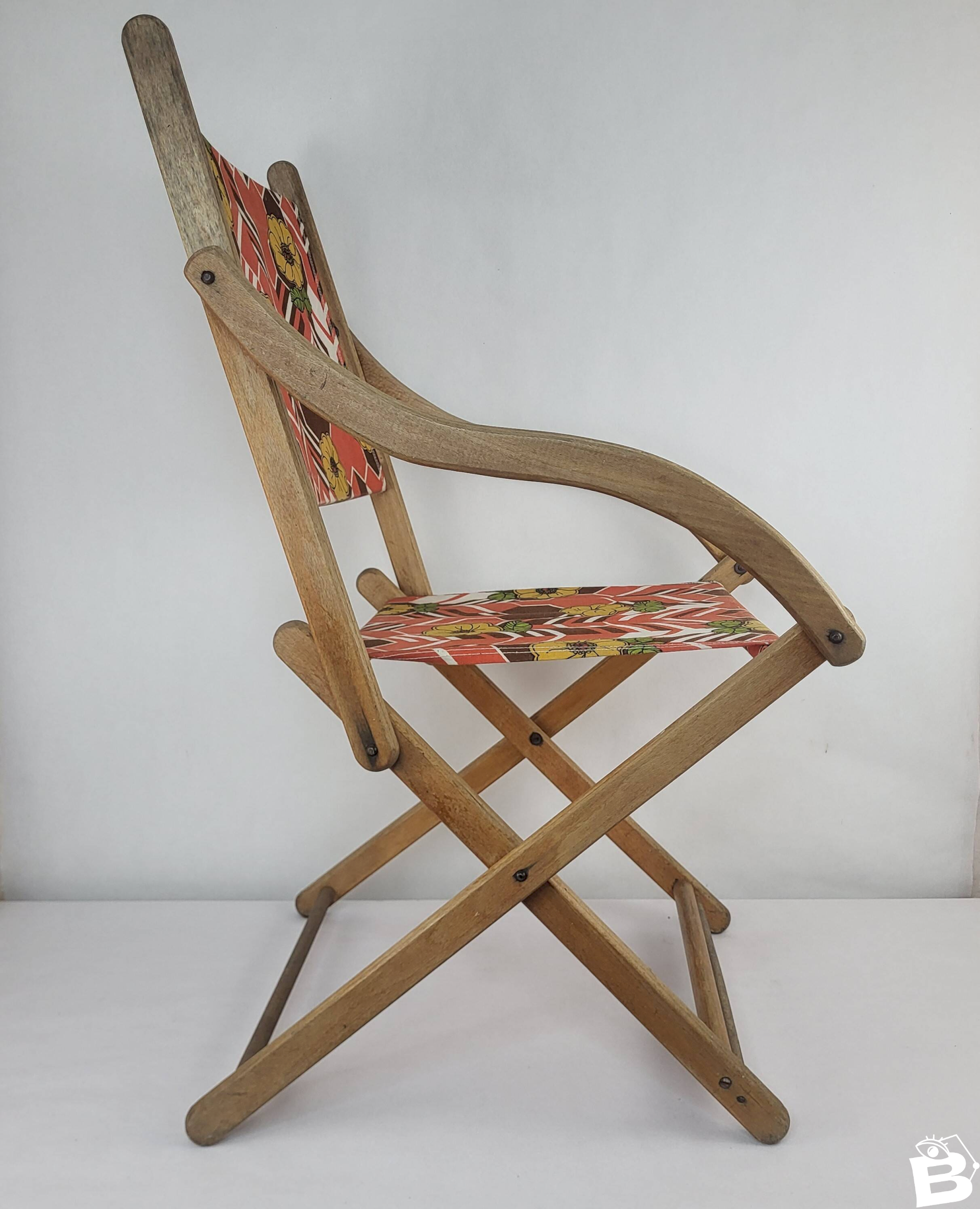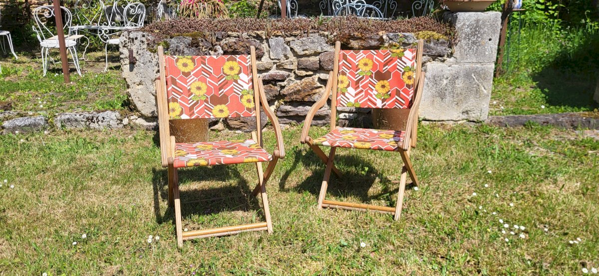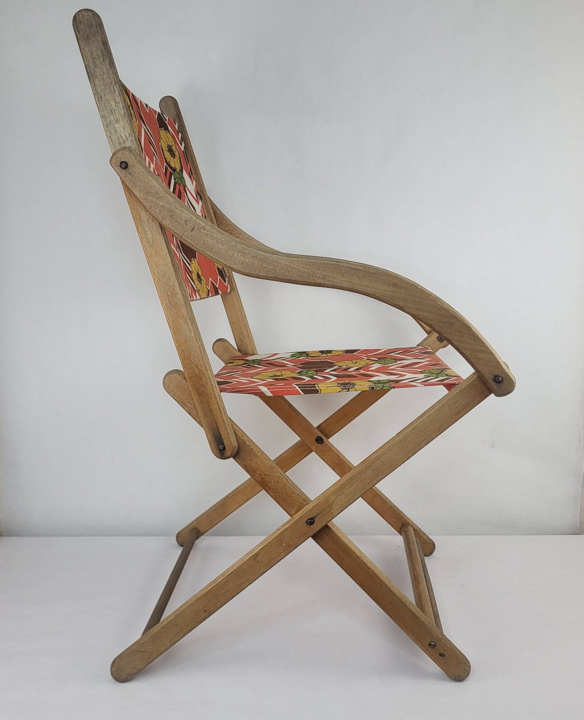 Chaise pliante vintage 1960's / structure en bois / assises et dossiers en tissu imprimé fleuri.Hauteur 85 cm.Hauteur assise 41 cm.Largeur 53 cm.Profondeur assise 37 cm.Elles sont en bon état avec traces minimes d'usage et d 'ancienneté.Emballage soigné et livraison rapide.