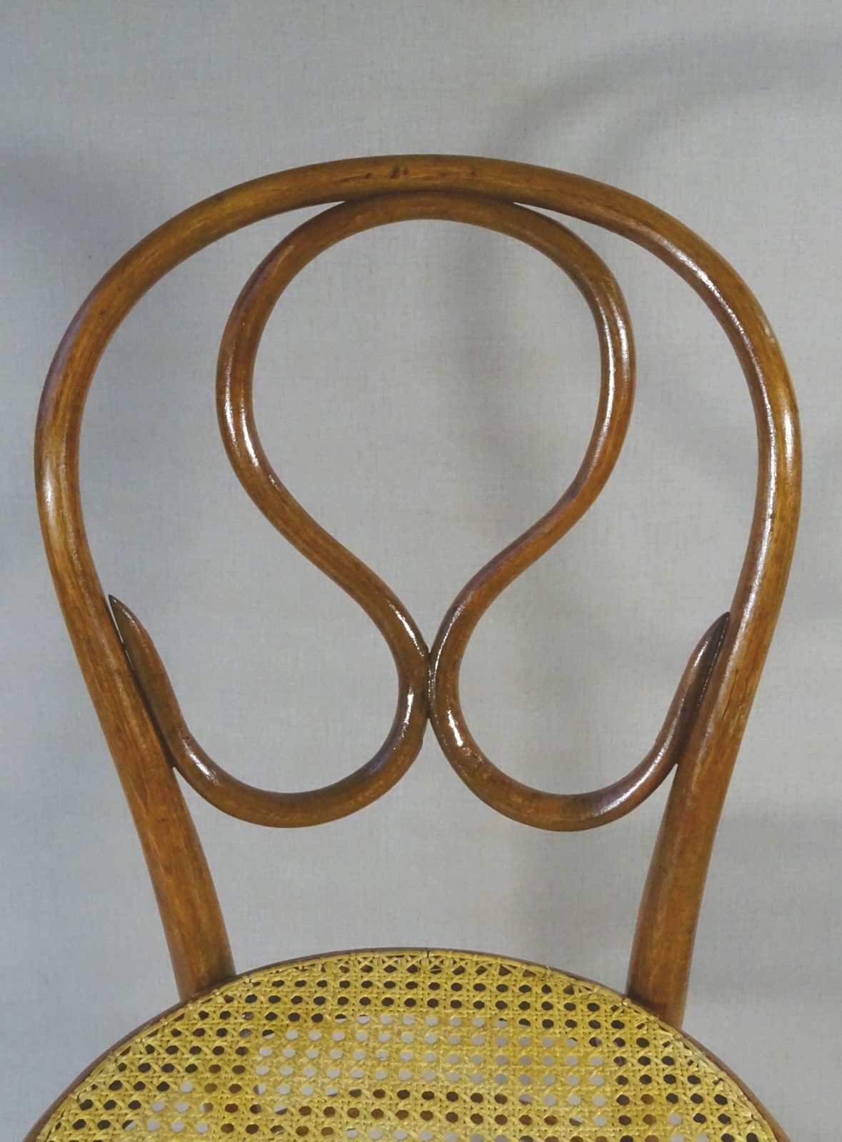 Chaise Thonet N°20 dite « oméga » datable de 1875/80.   Belle teinte merisier d’origine. Etat parfait, cannage récent prêt pour le service. Estampille sous la ceinture d’assise. Hauteur d’assise : 46 cm hauteur totale : 92 cm Plus de photos et renseignements sur demande Expédition France, Europe ou enlèvement Alsace. Nombre de pièces:1 Couleur:merisier Type:Chaise Marque:Thonet Période:XIXème et avant Pays d'origine:Autriche