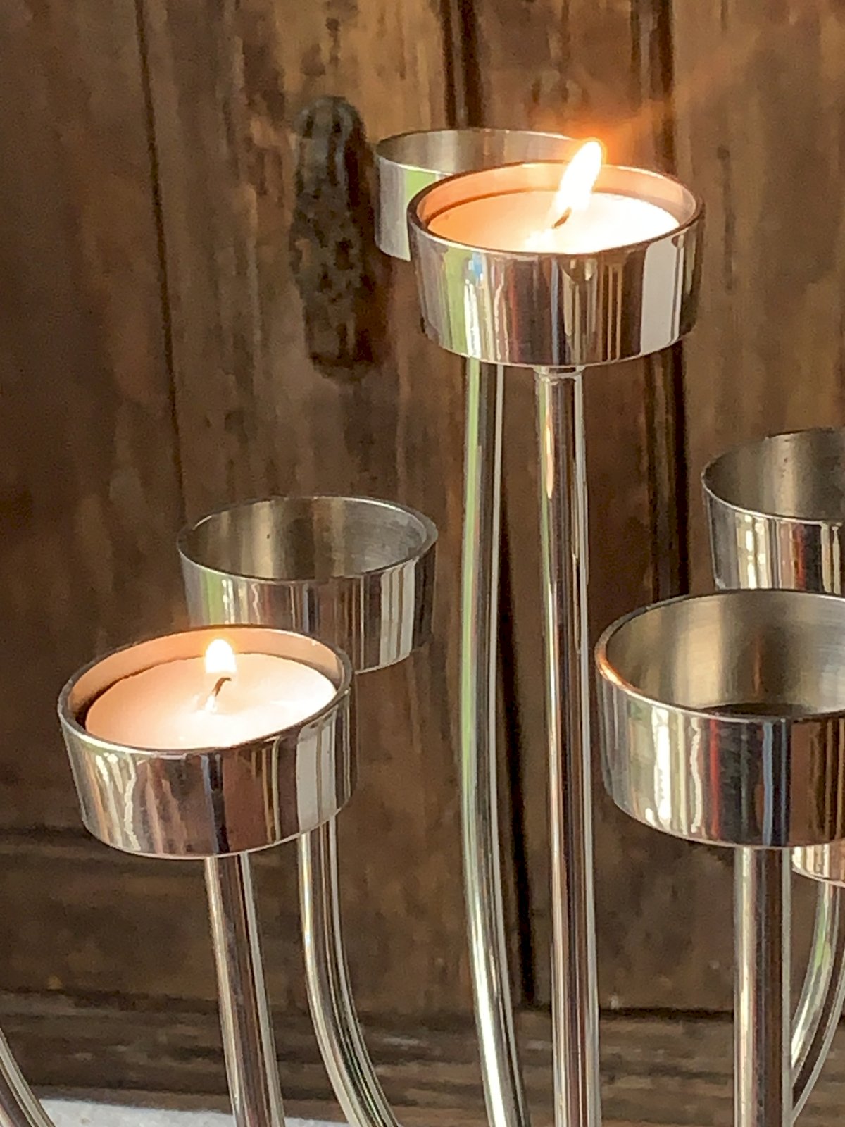 Bougeoir vintage 5 branches sur pied, 5 bougeoirs, fer forgé sculpté de feuilles