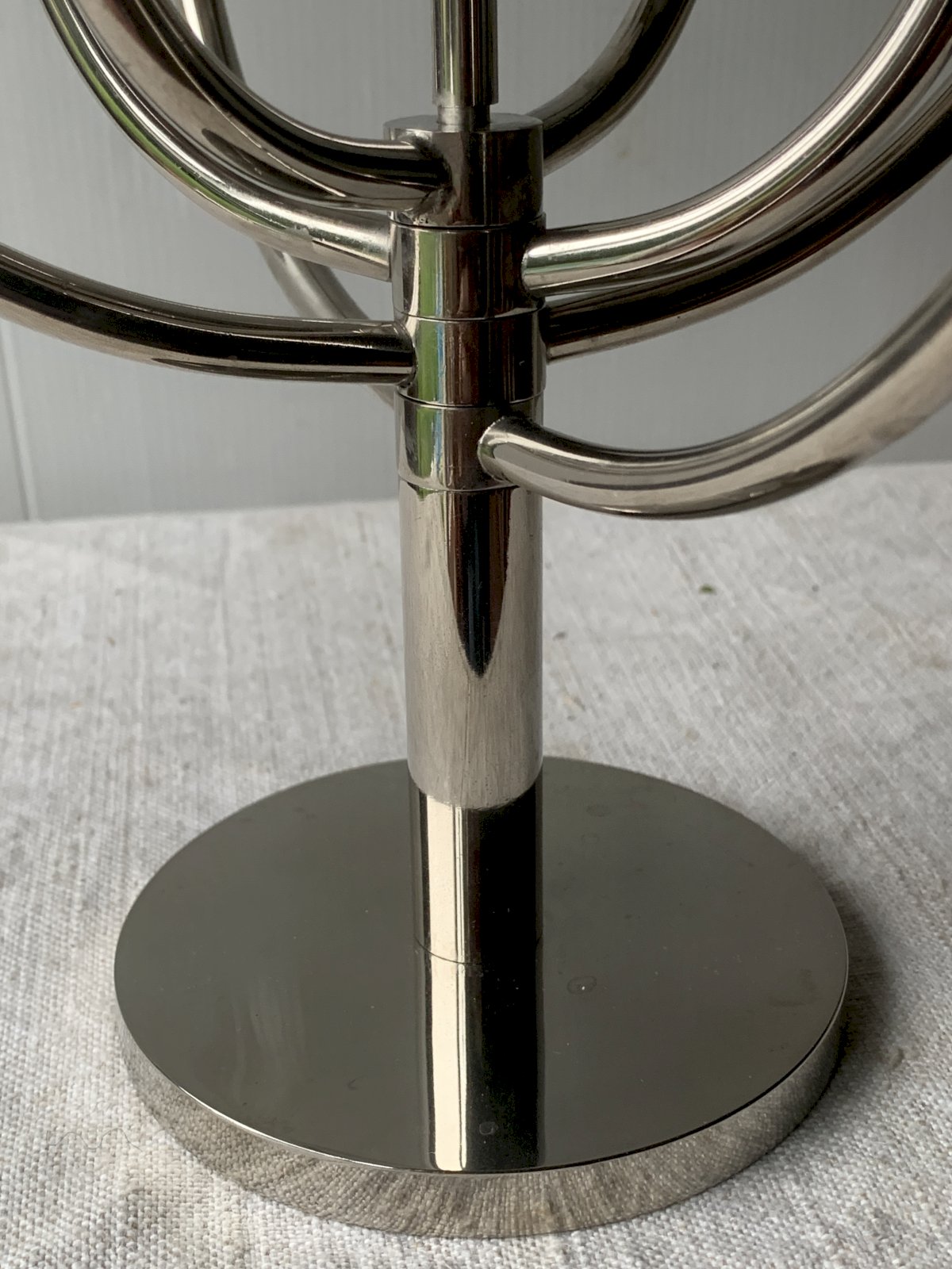 En très bon état général, chandelier moderniste huit branches rotatives, acier chromé poli , conçu par Jasper Conran pour Habitat fin 90s . Les bras sont articulés. Un manque sur un support, rien de sérieux. Aspect général comme neuf.