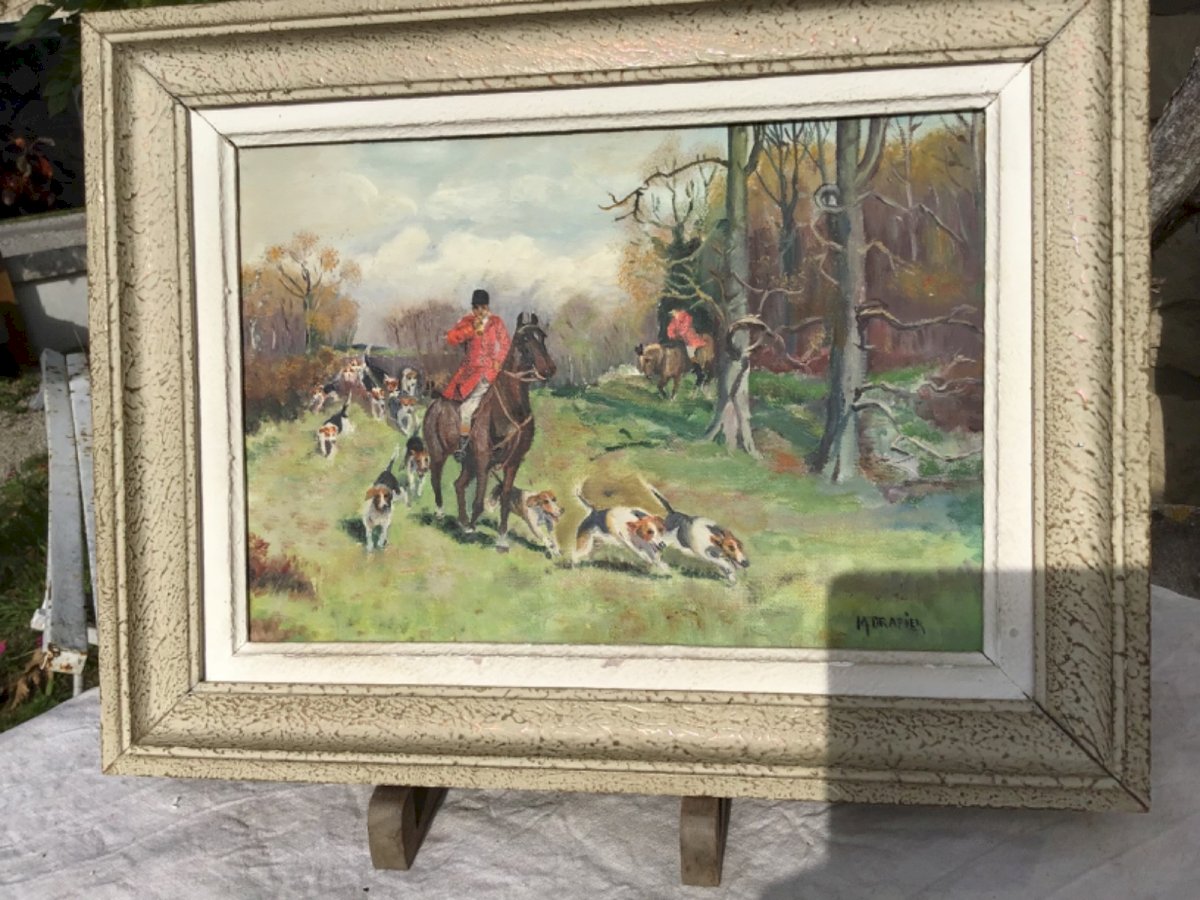Huile sur toile, encadrée, signée en bas à gauche. Dimensions de la peinture:  Signée M. DRAPIER  un peintre français de scènes de genre, de fleurs.  Référence AKOUN Type:Huile sur toile Style:1960 Genre:Post-impressionnisme Caractéristiques:Signé Thème:Chasse Artiste:M. DRAPIER